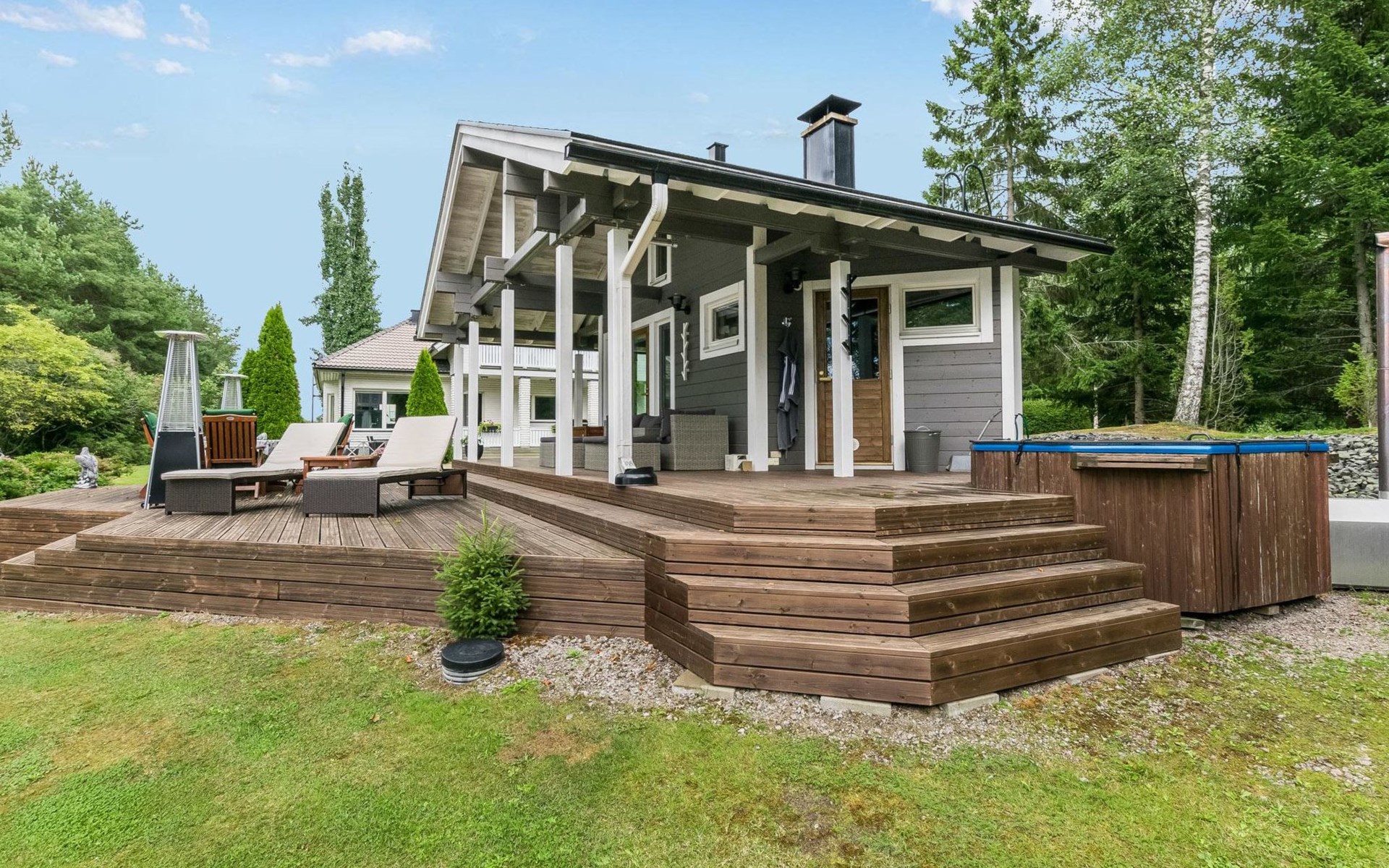 Large furnished terrace, hot tub (included in the price), sun beds, infrared heaters and gas grill in front of the sauna building.