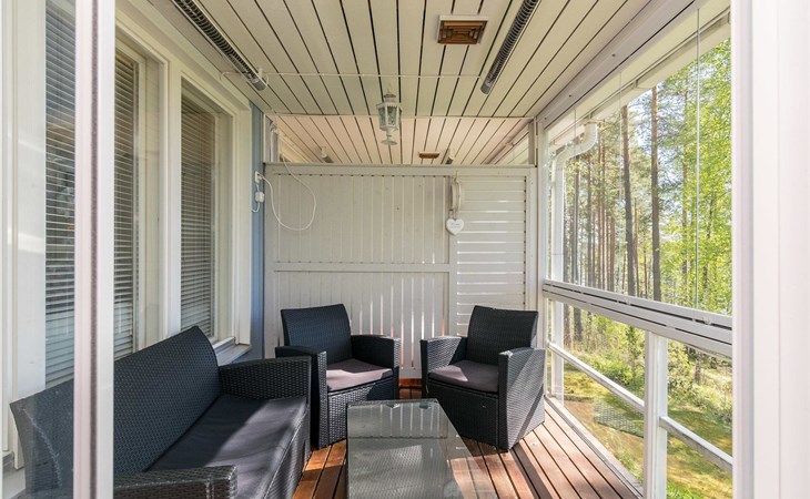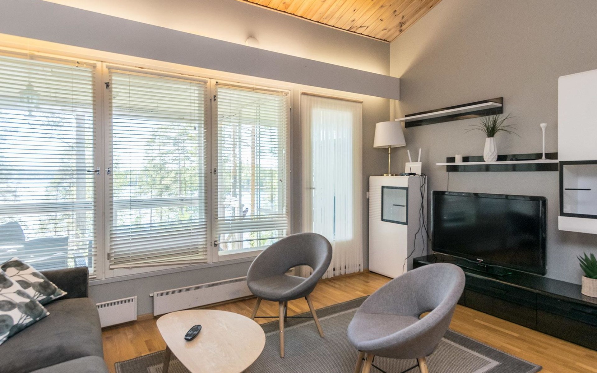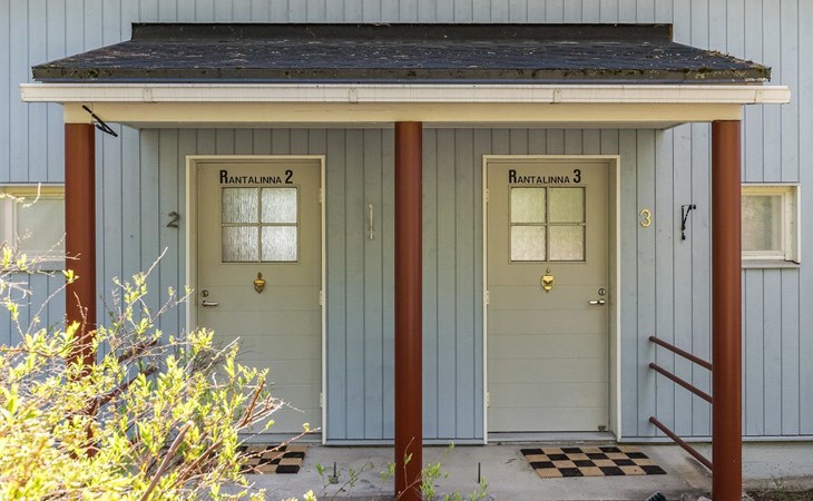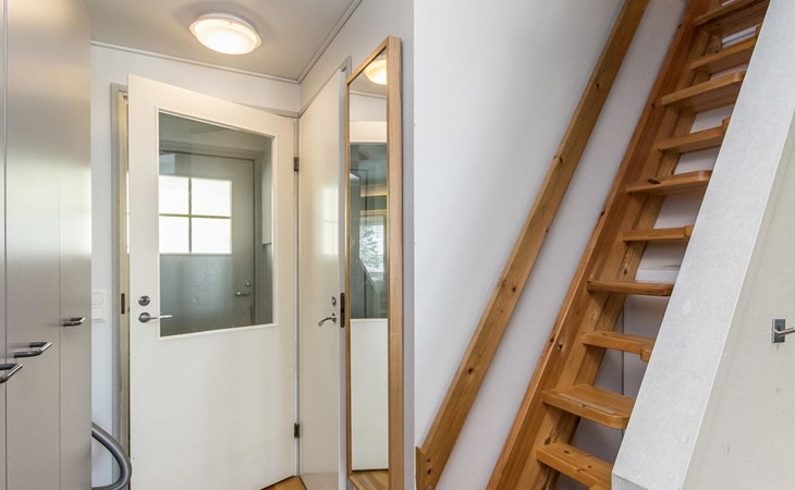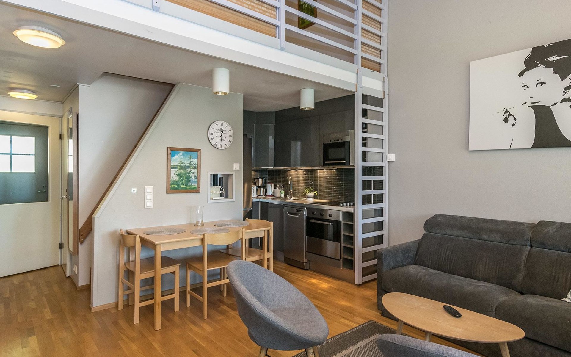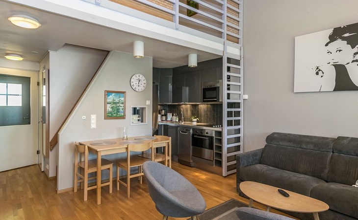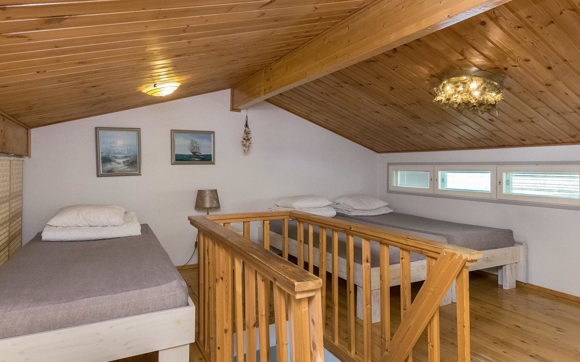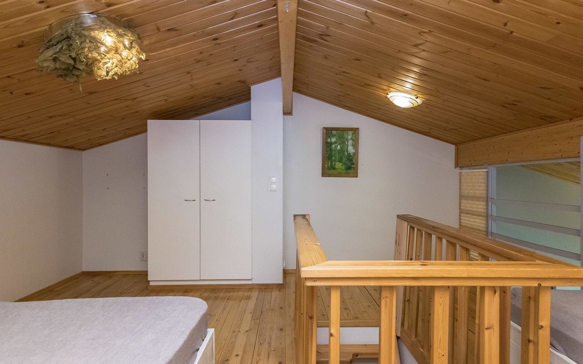 Apartment in a row house (built in 1990), living room with sofa bed for two, kitchenette (renovated in 2012), washroom with WC and shower, electric sauna, glazed terrace. Three beds in the loft, steep stairs lead to the loft.