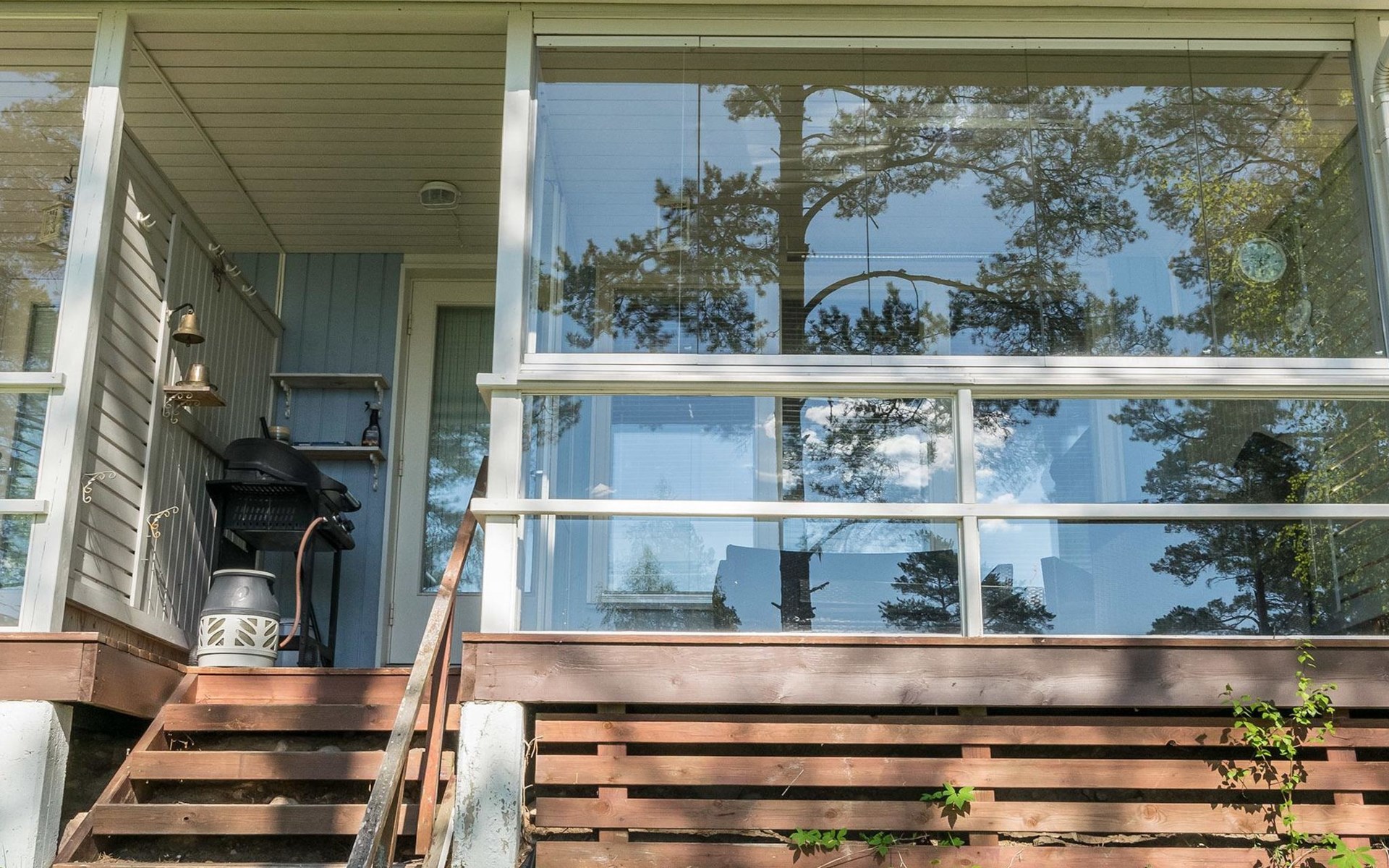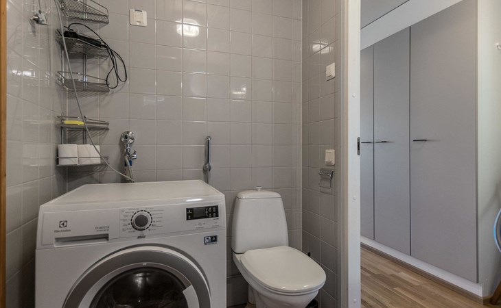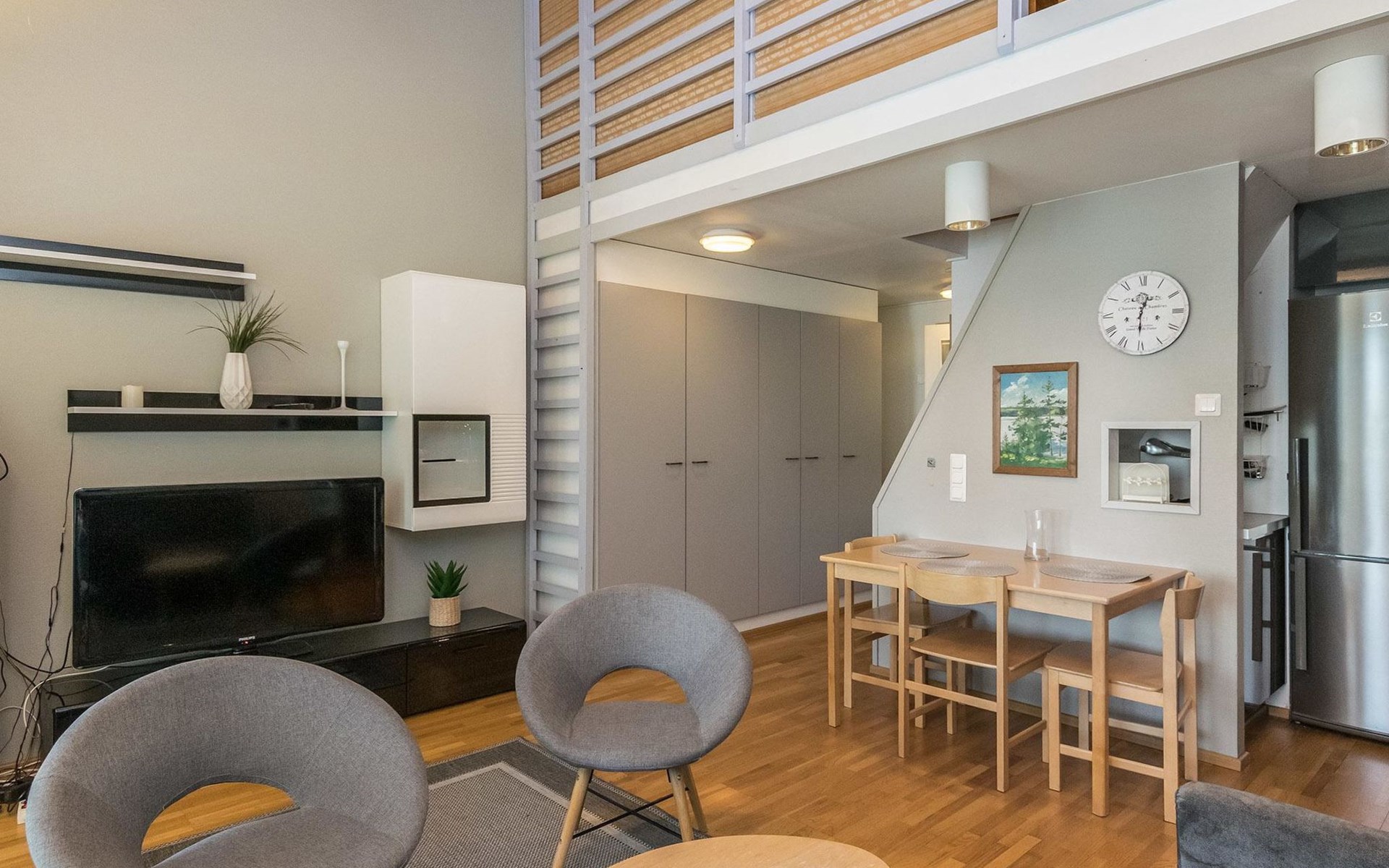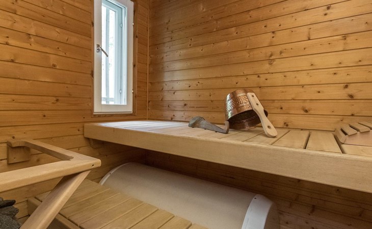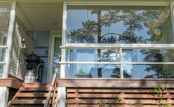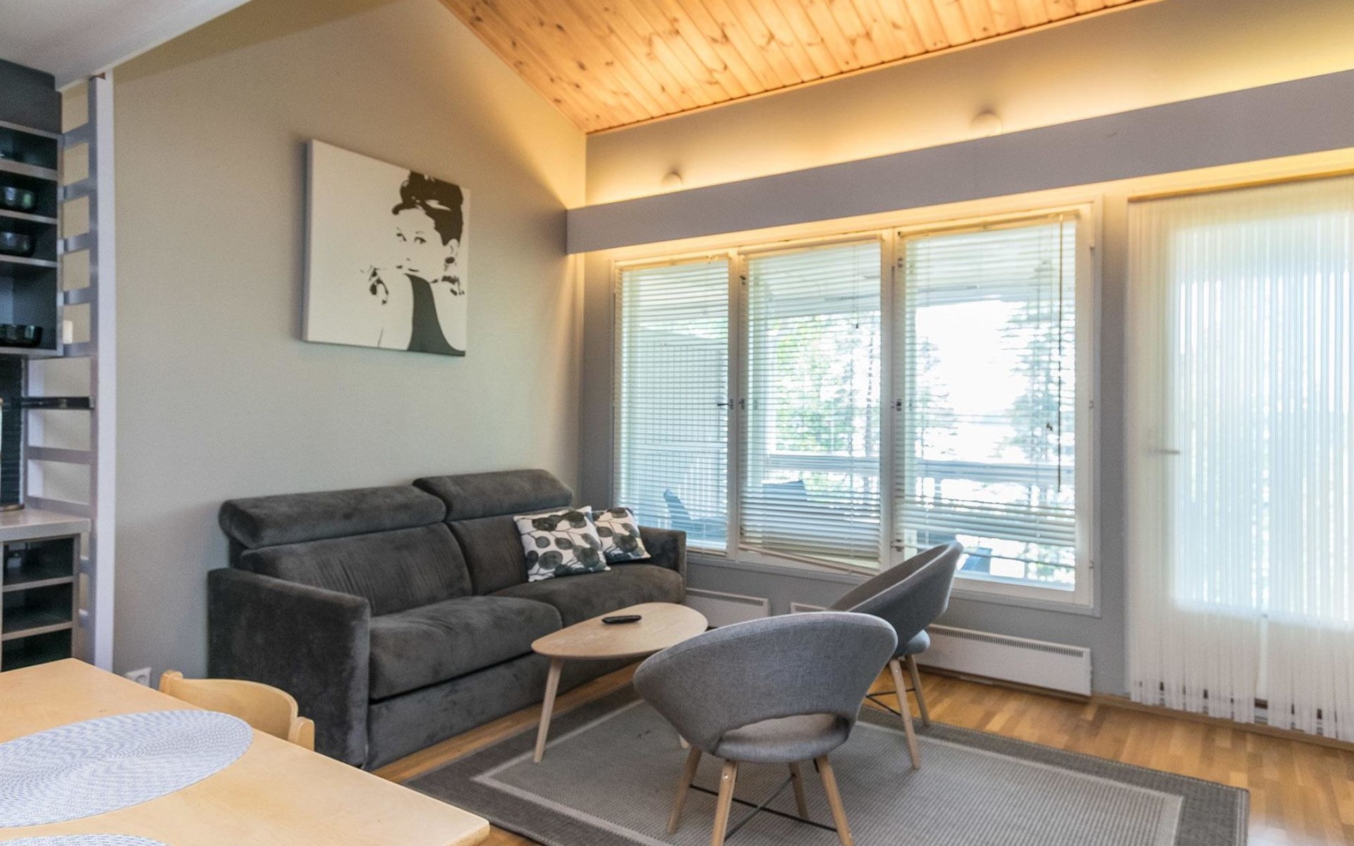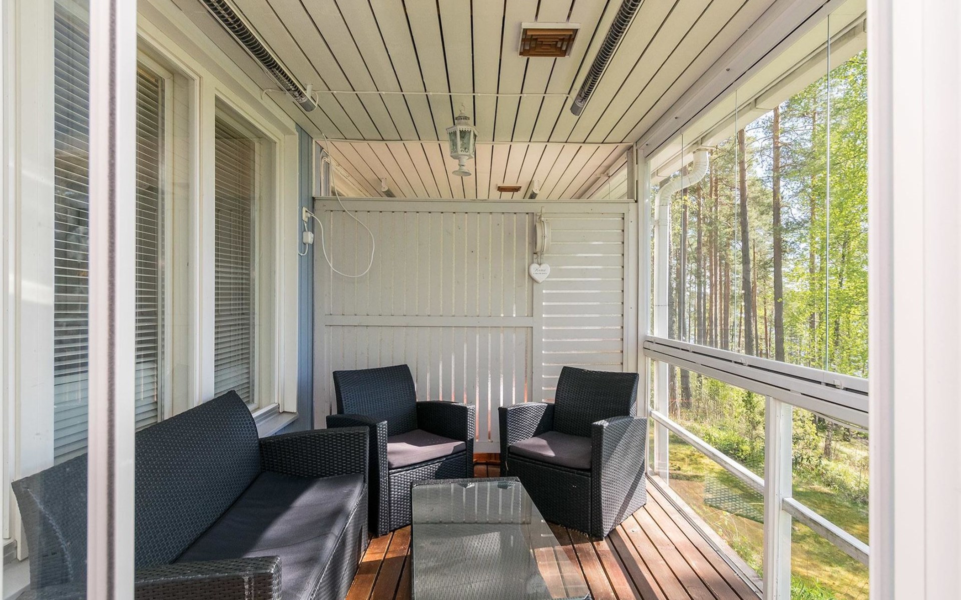Apartment in a row house (built in 1990), living room with sofa bed for two, kitchenette (renovated in 2012), washroom with WC and shower, electric sauna, glazed terrace. Three beds in the loft, steep stairs lead to the loft.