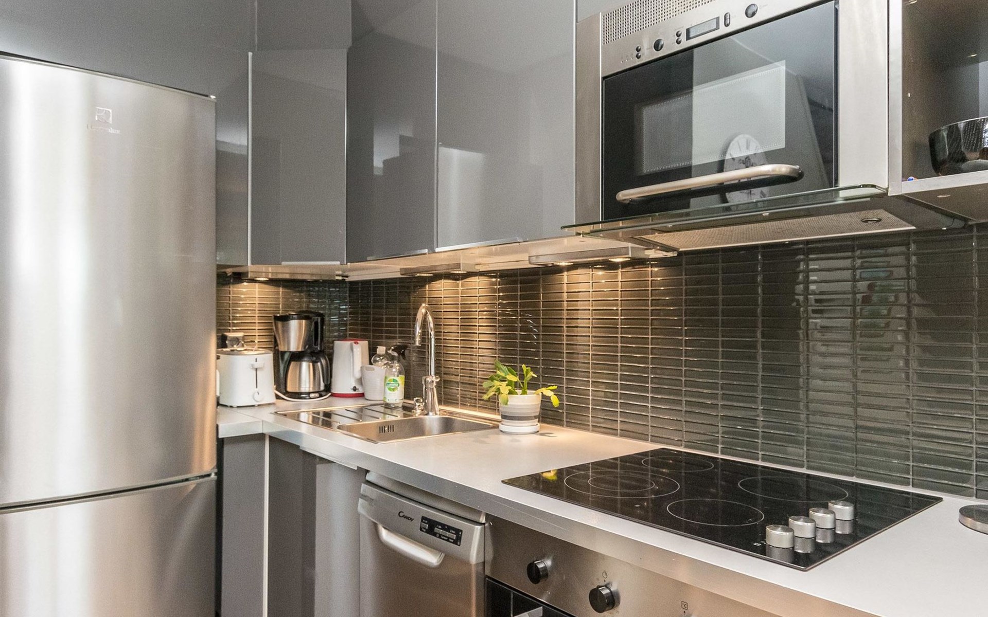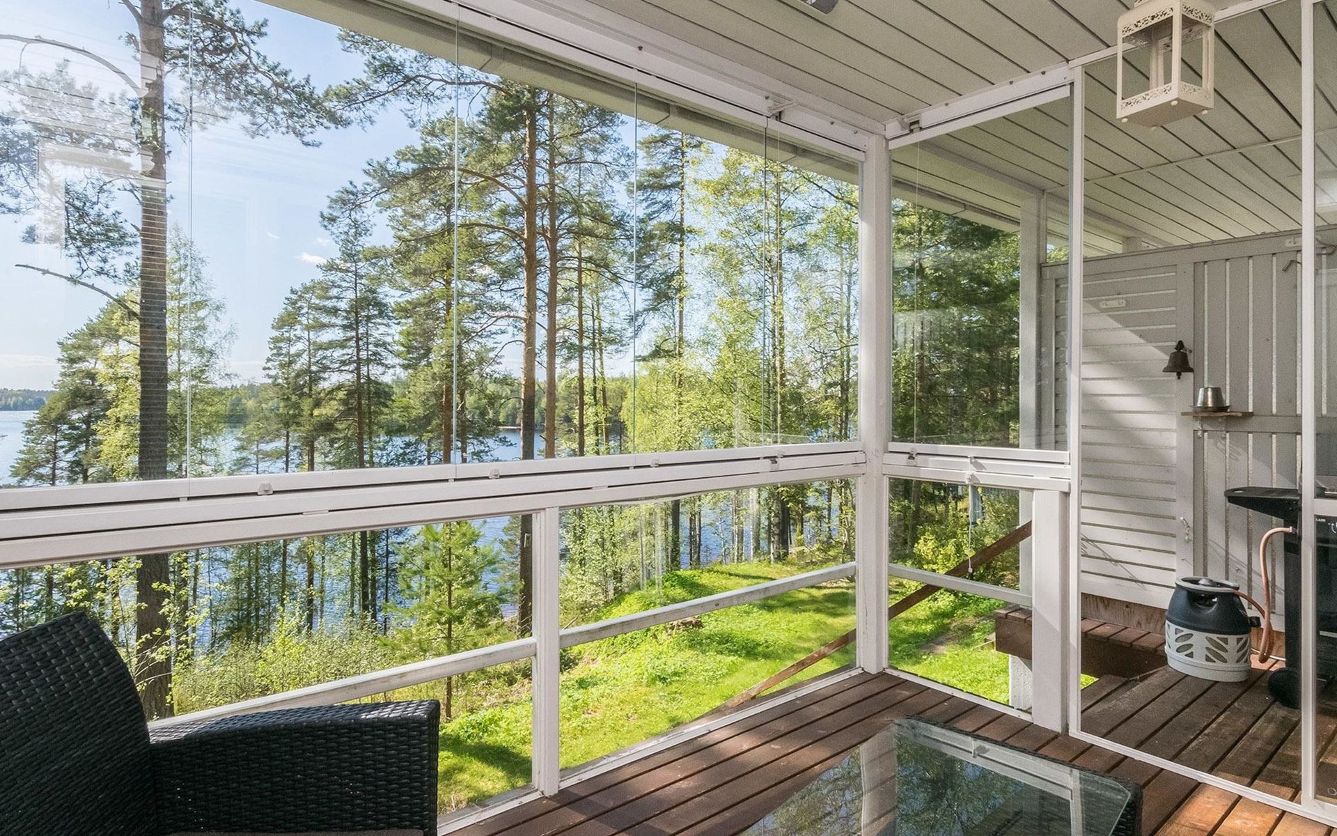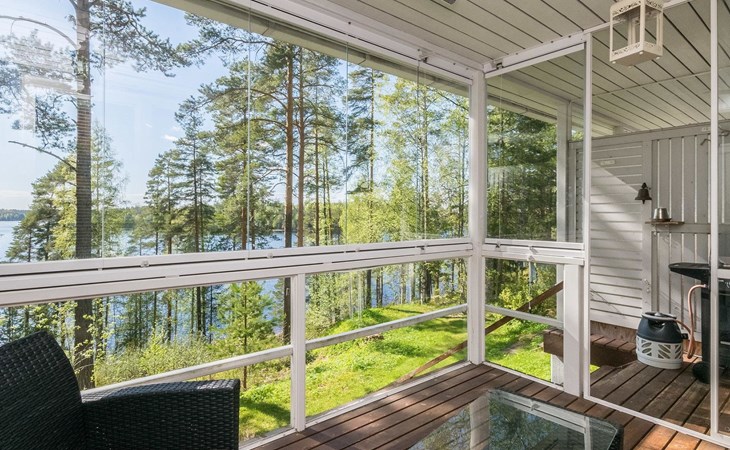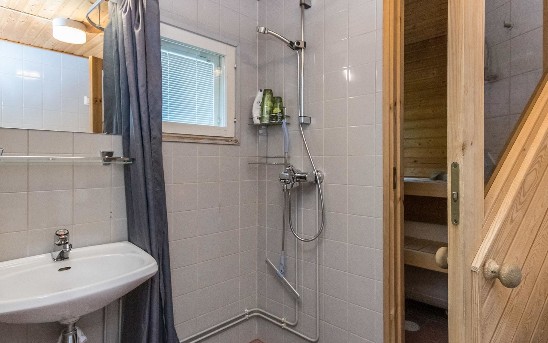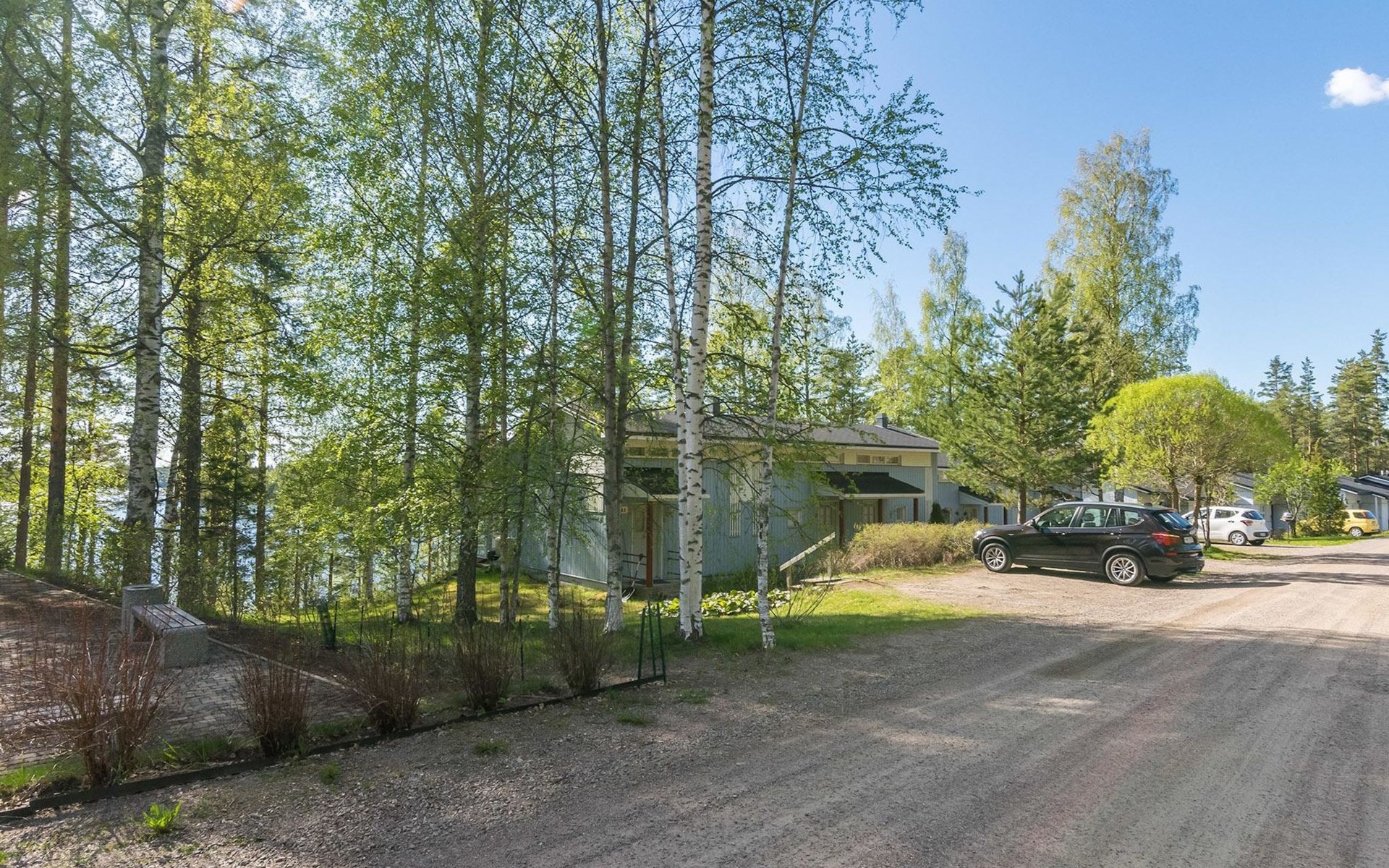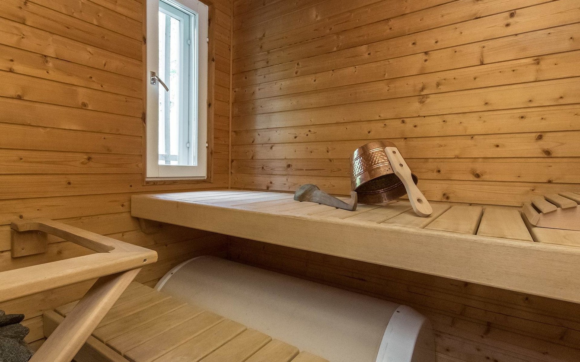 Apartment in a row house (built in 1990), living room with sofa bed for two, kitchenette (renovated in 2012), washroom with WC and shower, electric sauna, glazed terrace. Three beds in the loft, steep stairs lead to the loft.