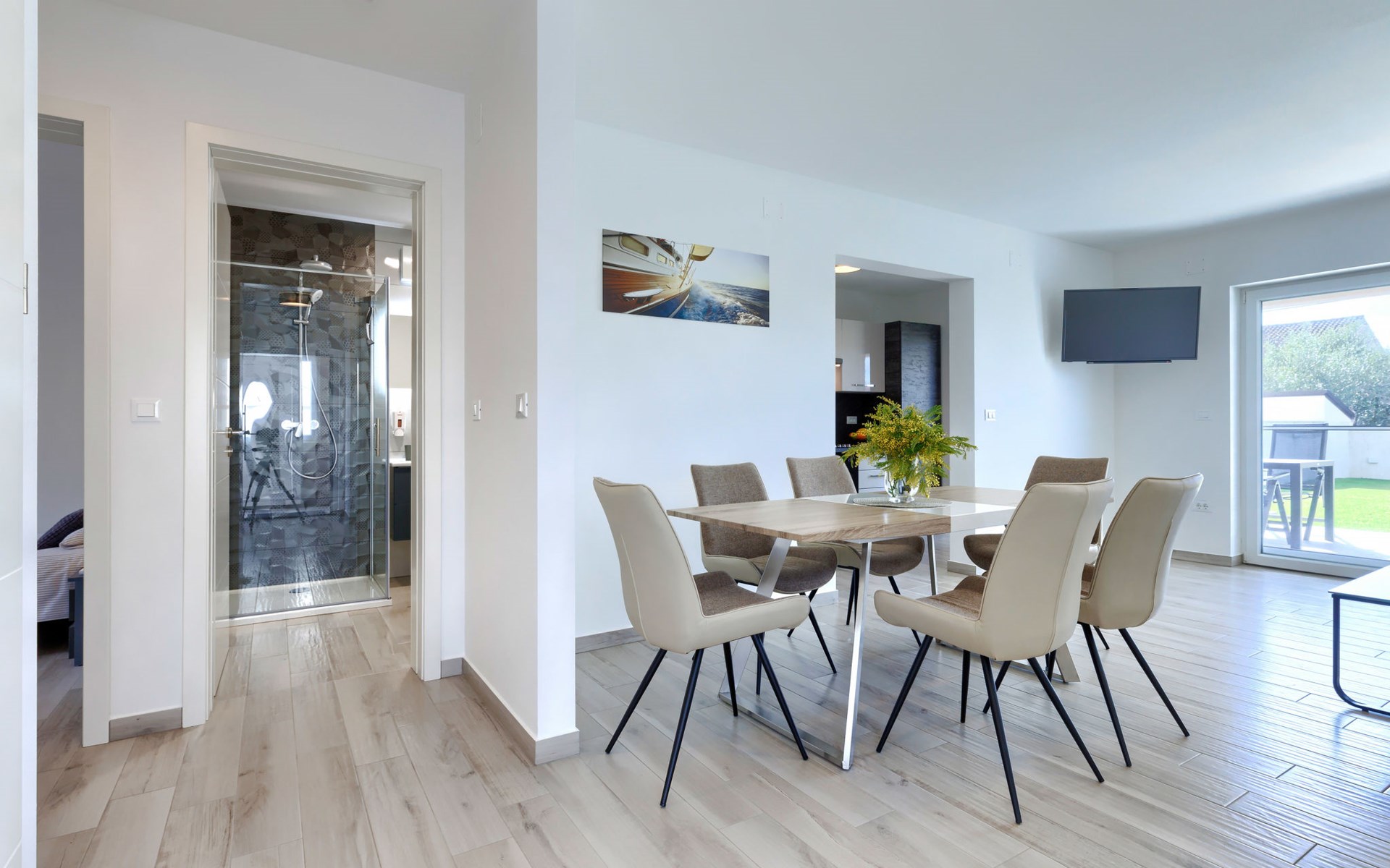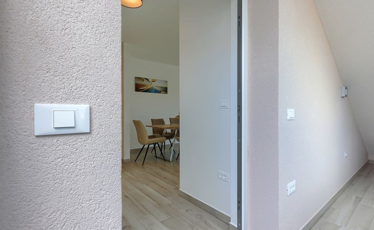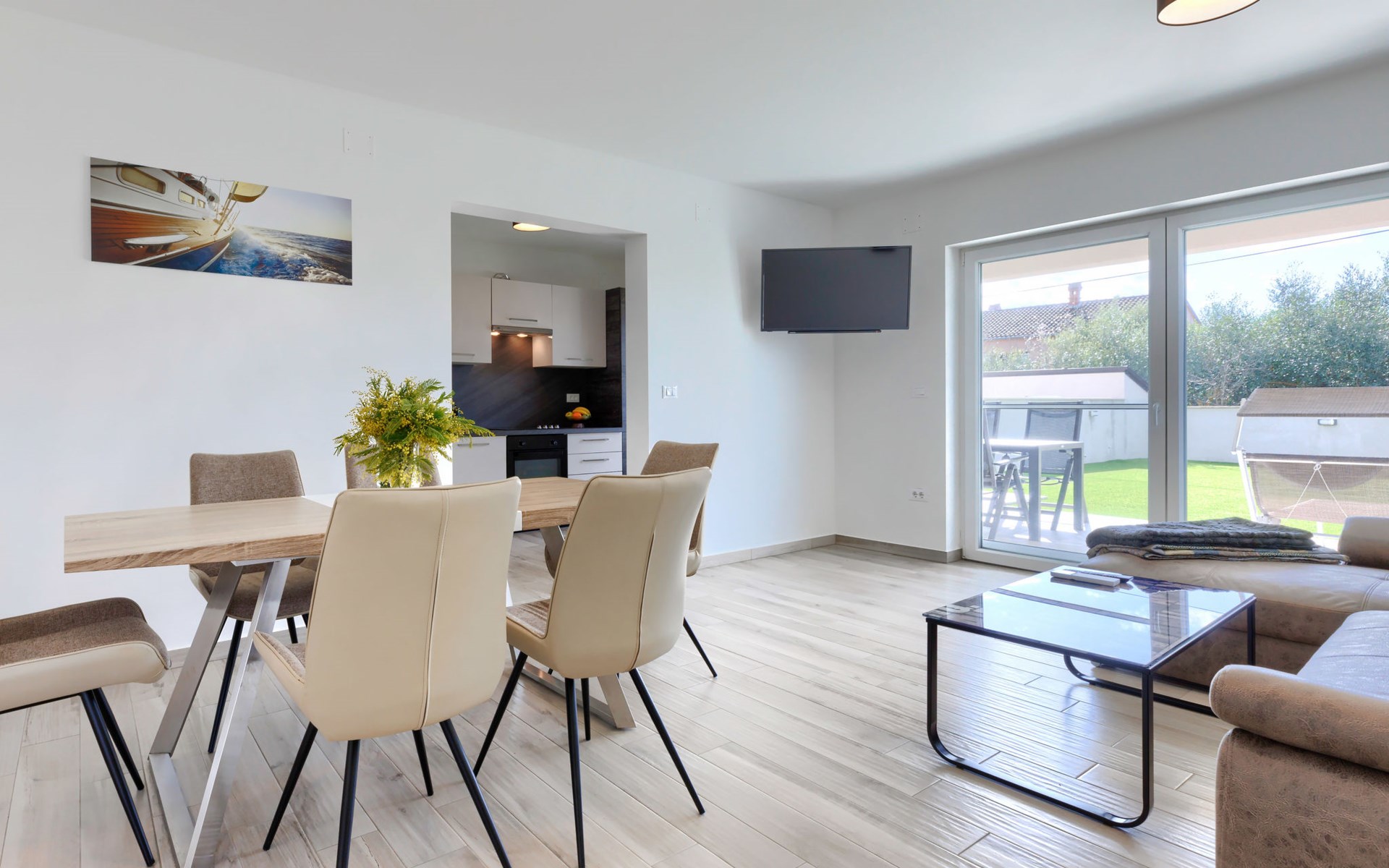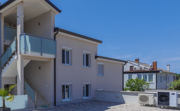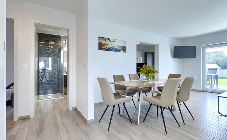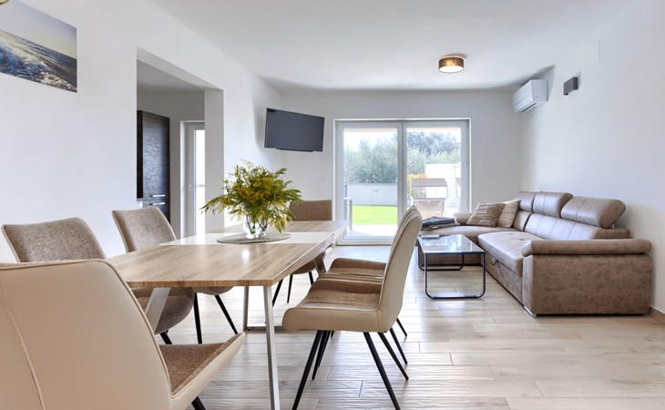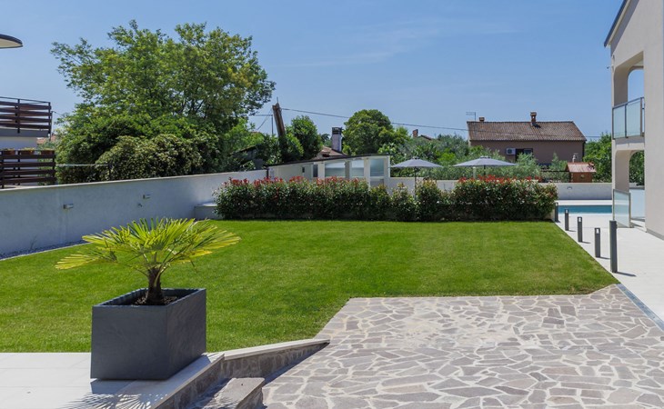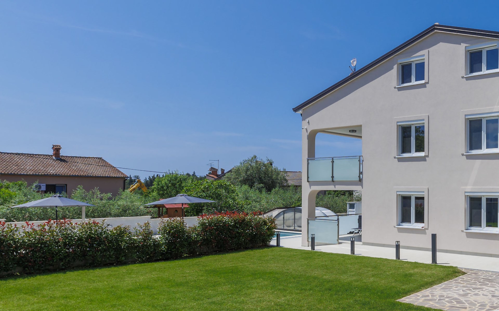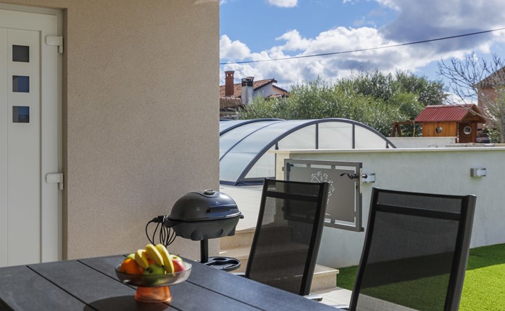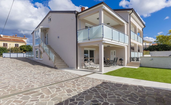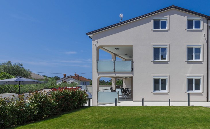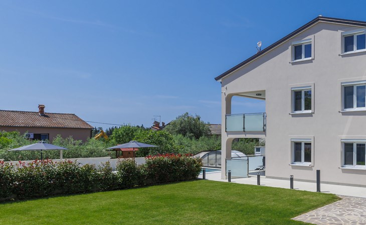 Murine 3 km van Umag: Appartementencomplex "Villa Galici", bouwjaar 2022. In het gehucht Galići, 1 km van het centrum van Murine, zonnige ligging, 2.5 km van zee, 2.5 km van het strand. Voor medegebruik: terrein 1.000 m2 met gazon, openluchtzwembad hoekig verwarmd (10 x 5 m, 150 cm diepte, seizoensgebonden beschikbaarheid: 01.Jan. - 31.Dec.) met trap en oprolbaar afdekscherm. Buitendouche. In het huis: internetaansluiting, tafelvoetbal. Parkeerplaats bij het huis op het terrein. Winkel 1.5 km, restaurant 800 m, bushalte 4.1 km, kiezelstrand 2.5 km, rotsstrand 2.5 km. Wandelroutes 100 m vanaf het huis, fietspad 150 m. De eigenaar accepteert geen jeugdgroepen.