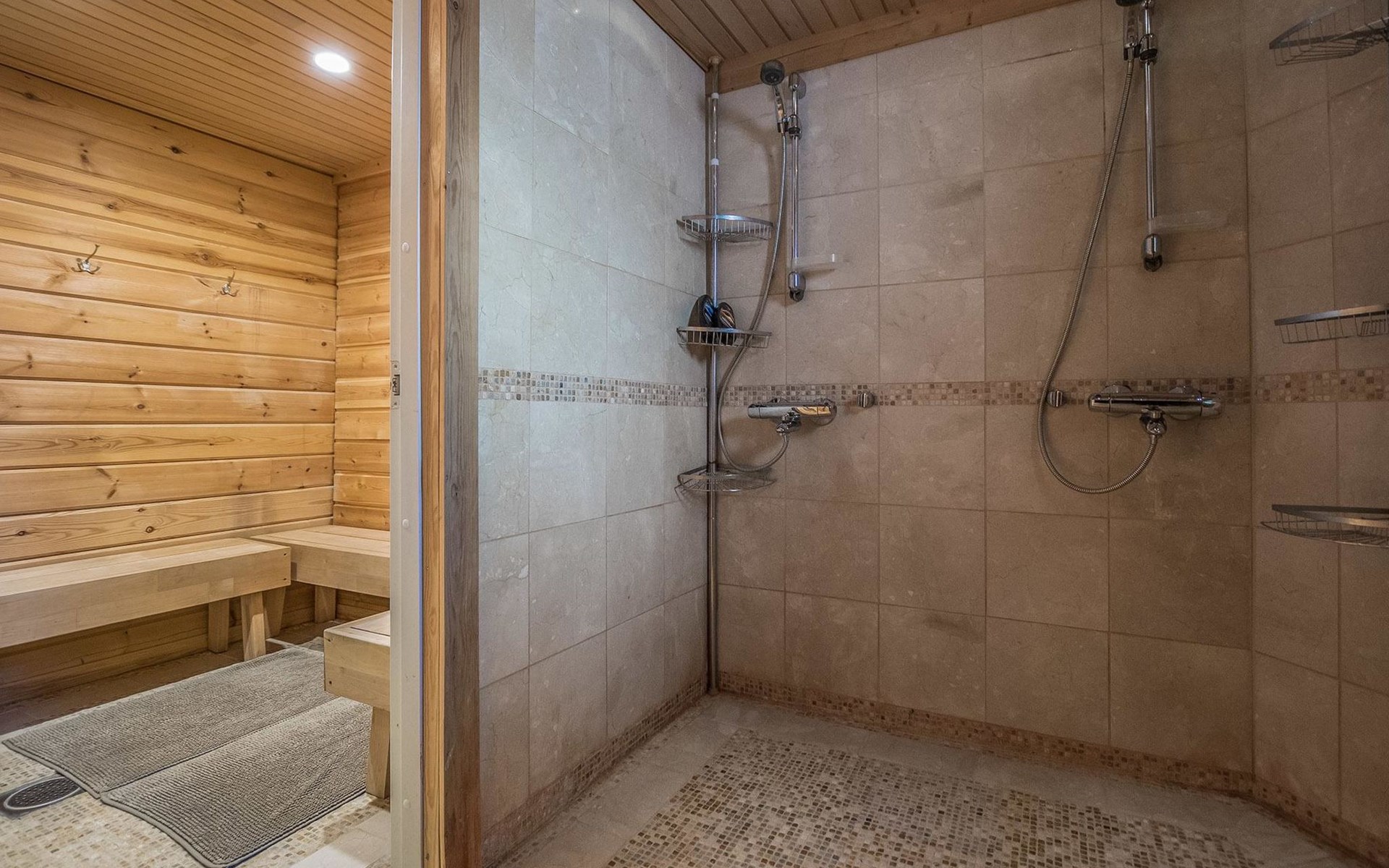 The apartment includes an open kitchen opening directly into the living room, five bedrooms, a sauna, a washroom, two separate toilets (one upstairs and one downstairs), a dressing room, a wind closet, an outdoor terrace with a charcoal grill, a dock with a swimming ladder and a shared boat with apartment A.