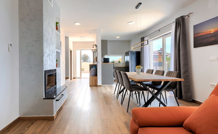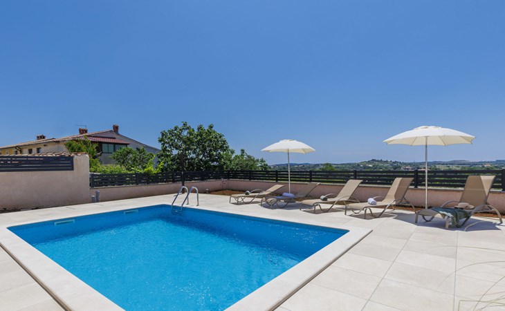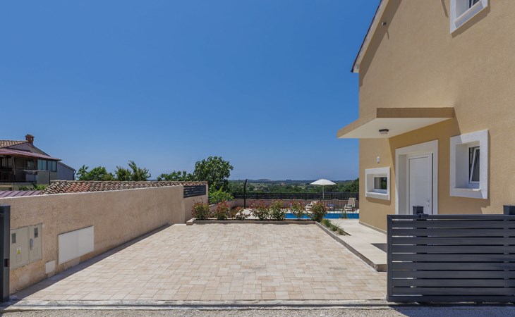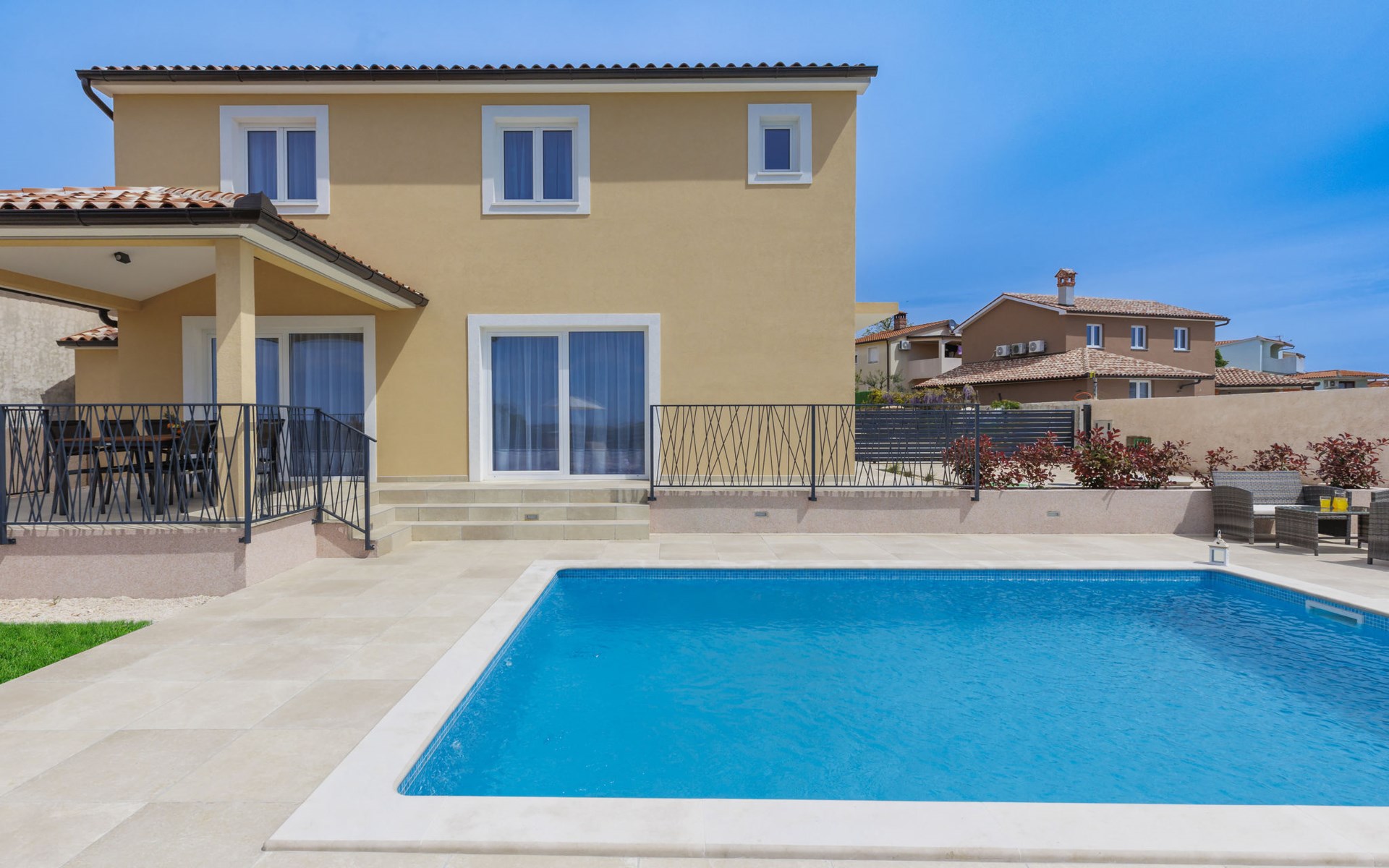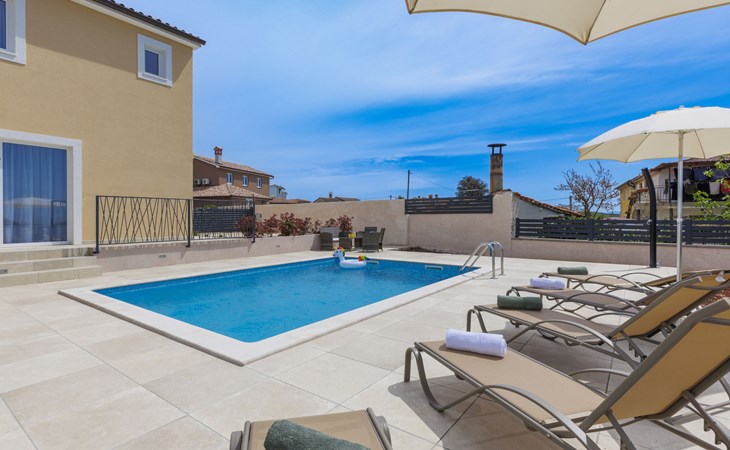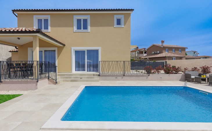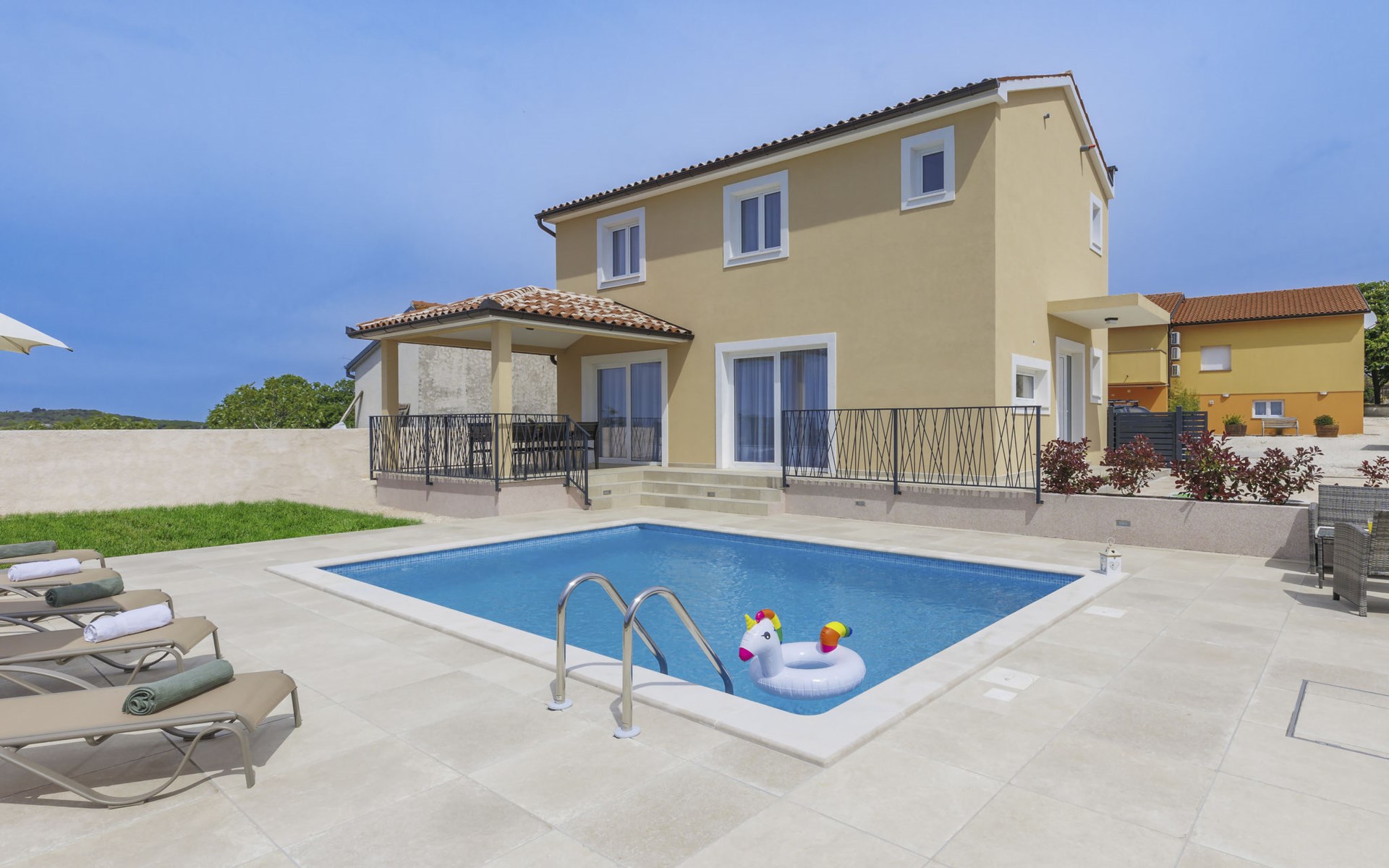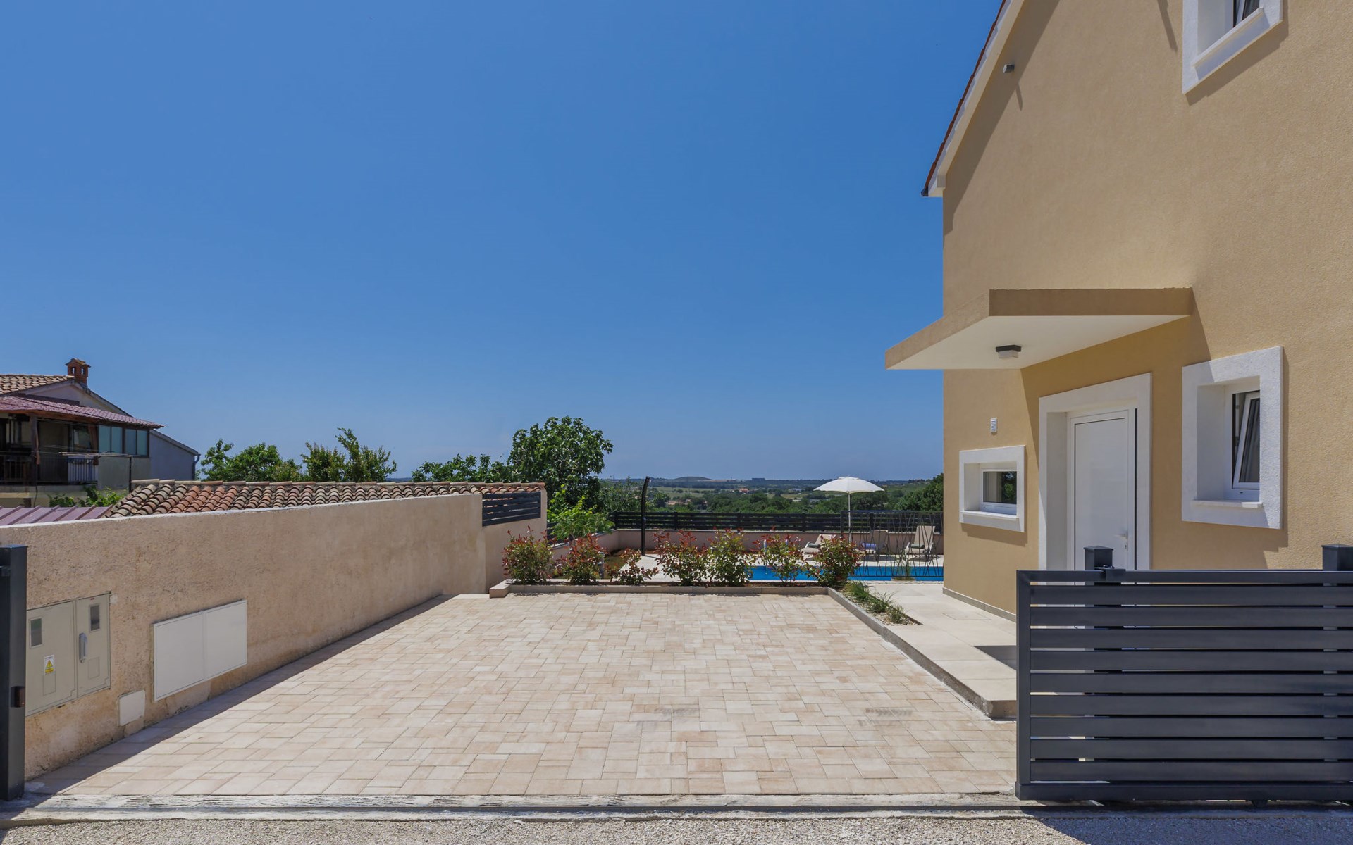 Mooi eengezinswoning "Villa Dora", van 2 verdiepingen, bouwjaar 2023. In het gehucht Jadreški, 7.5 km van het centrum van Pula, rustige, zonnige ligging, 7 km van zee. Voor alleengebruik: terrein 394 m2, tuin met gazon, openluchtzwembad hoekig (6 x 4 m, 150 cm diepte, seizoensgebonden beschikbaarheid: 01.Mei. - 15.Okt.). Buitendouche, barbecue. In het huis: internetaansluiting, wasmachine. Parkeerplaats (voor 2 auto's) bij het huis op het terrein. Winkel 150 m, supermarkt 5 km, restaurant 3.2 km, bushalte 280 m, zandstrand 7 km kiezelstrand 7 km. Wandelroutes 100 m vanaf het huis, fietspad 150 m. Attracties in de buurt: Amphitheater 8 km, NP Brijuni 14 14 km, Nature park Rt Kamenjak 17 km. Geschikt voor families. De eigenaar accepteert geen jeugdgroepen. Vliegveld 7 km van het huis.