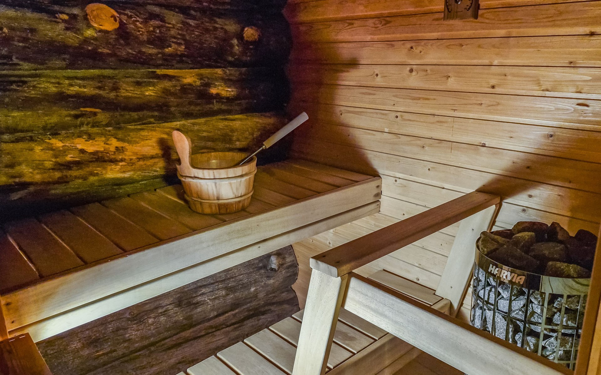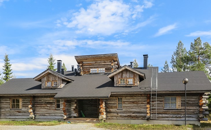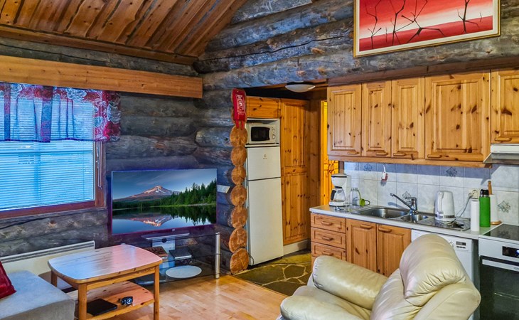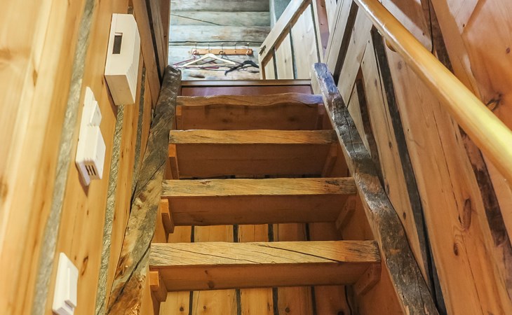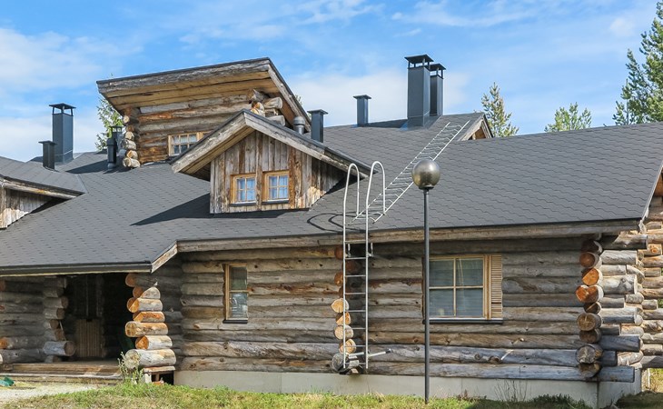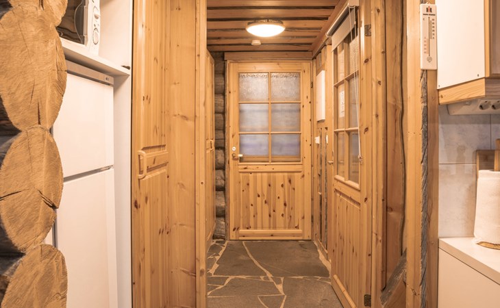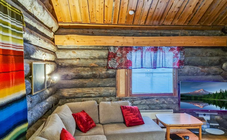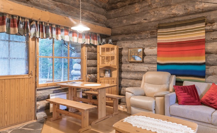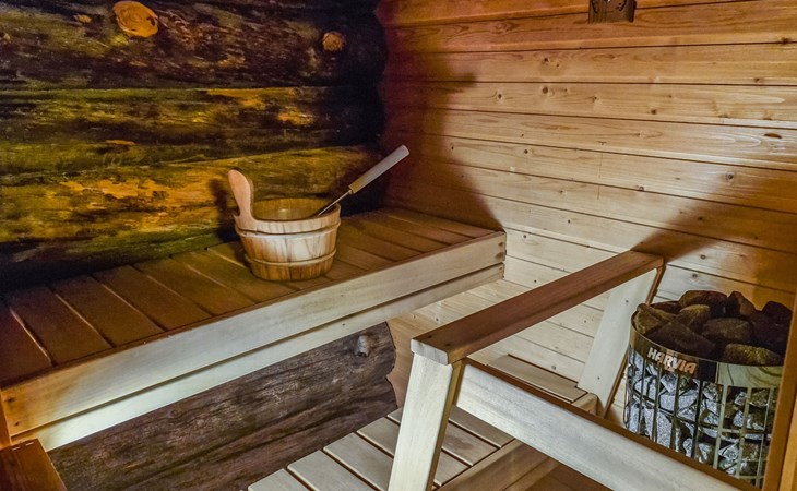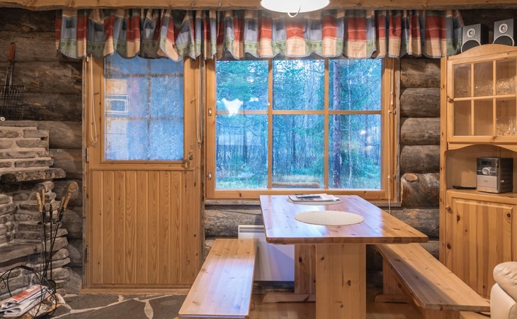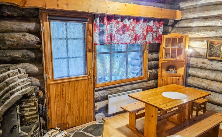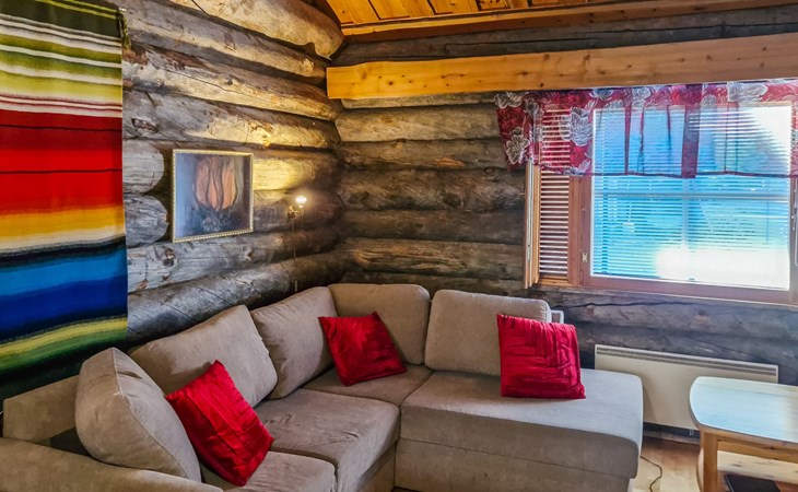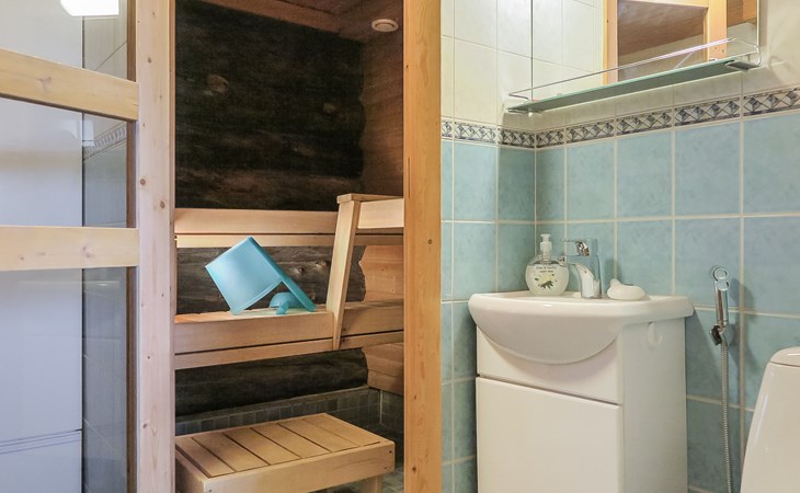 Living room with sofa bed (sleeping area spread out 140x200 cm), 15 m² loft has two sleeping areas, separated by partition wall, one area with bunk bed, another (lower one) with double bed (width 160 cm). Sauna with electric stove, bathroom/toilet, hallway and small covered porch. Narrow staircase, rather steep stairs to the loft.