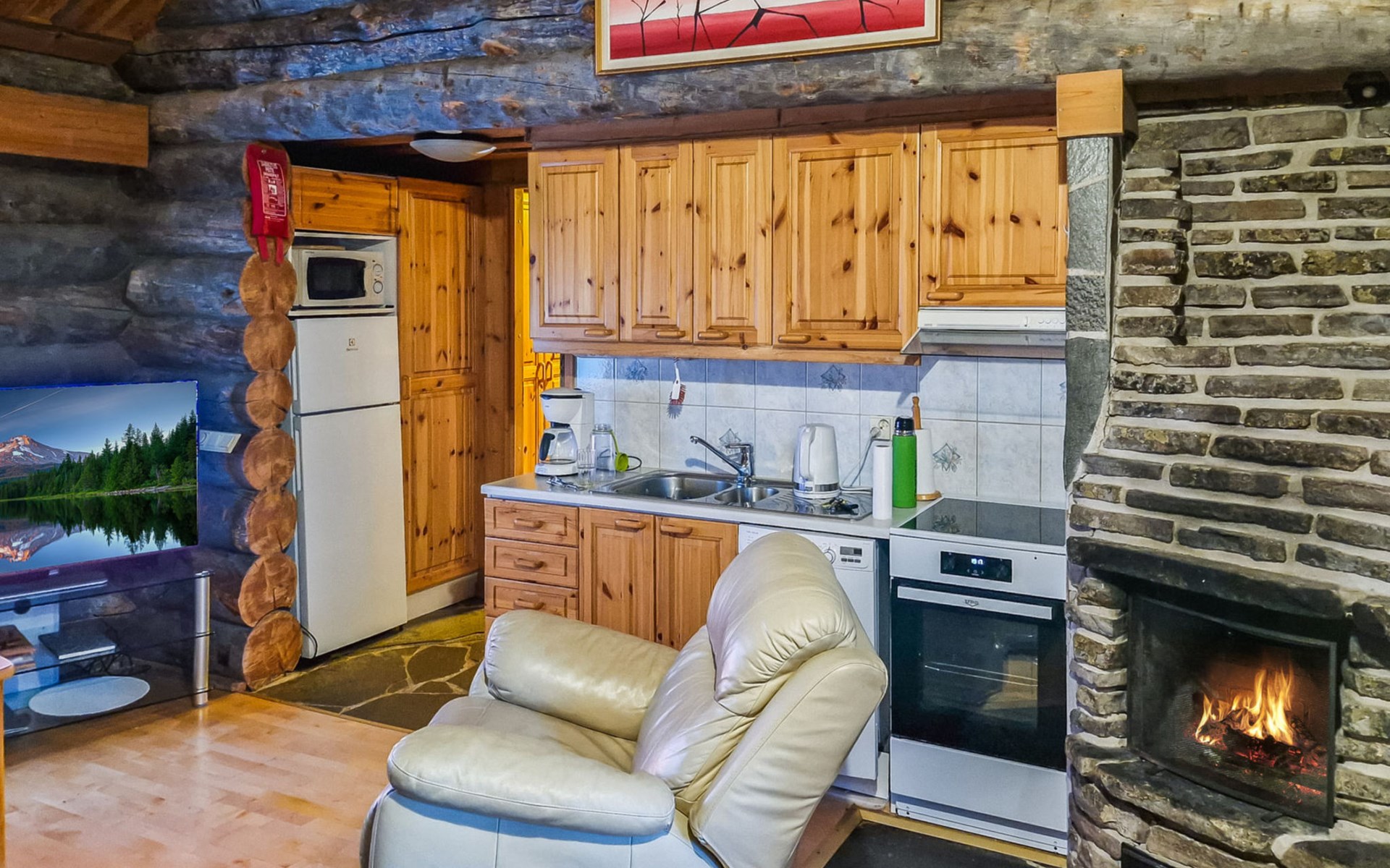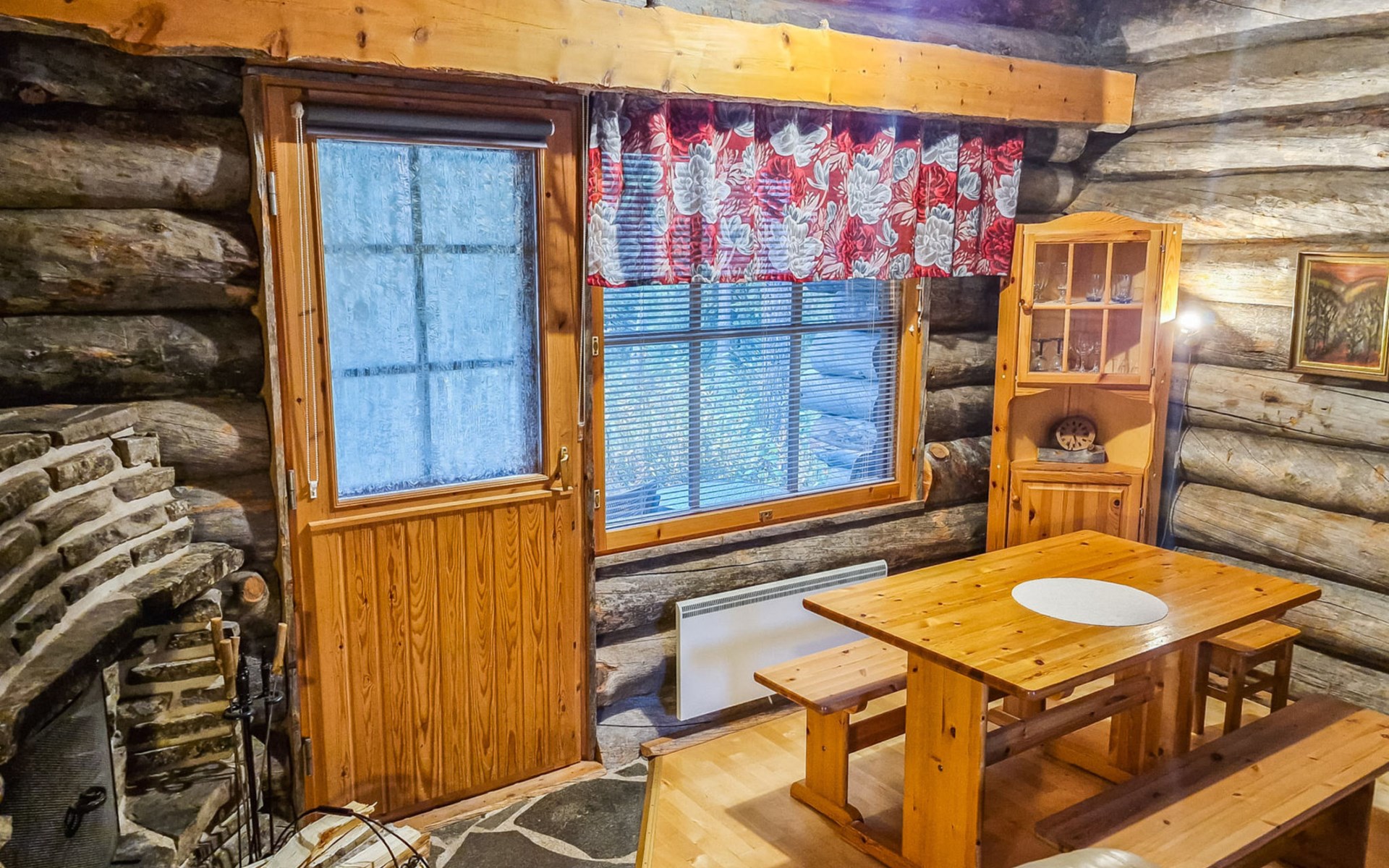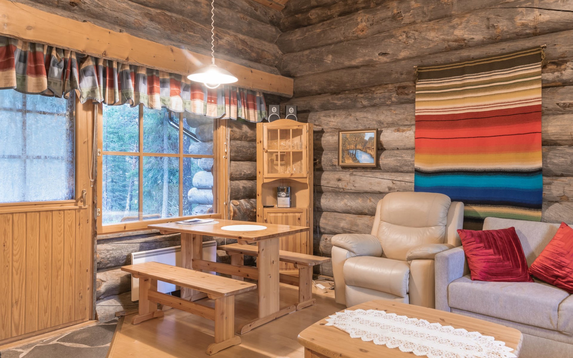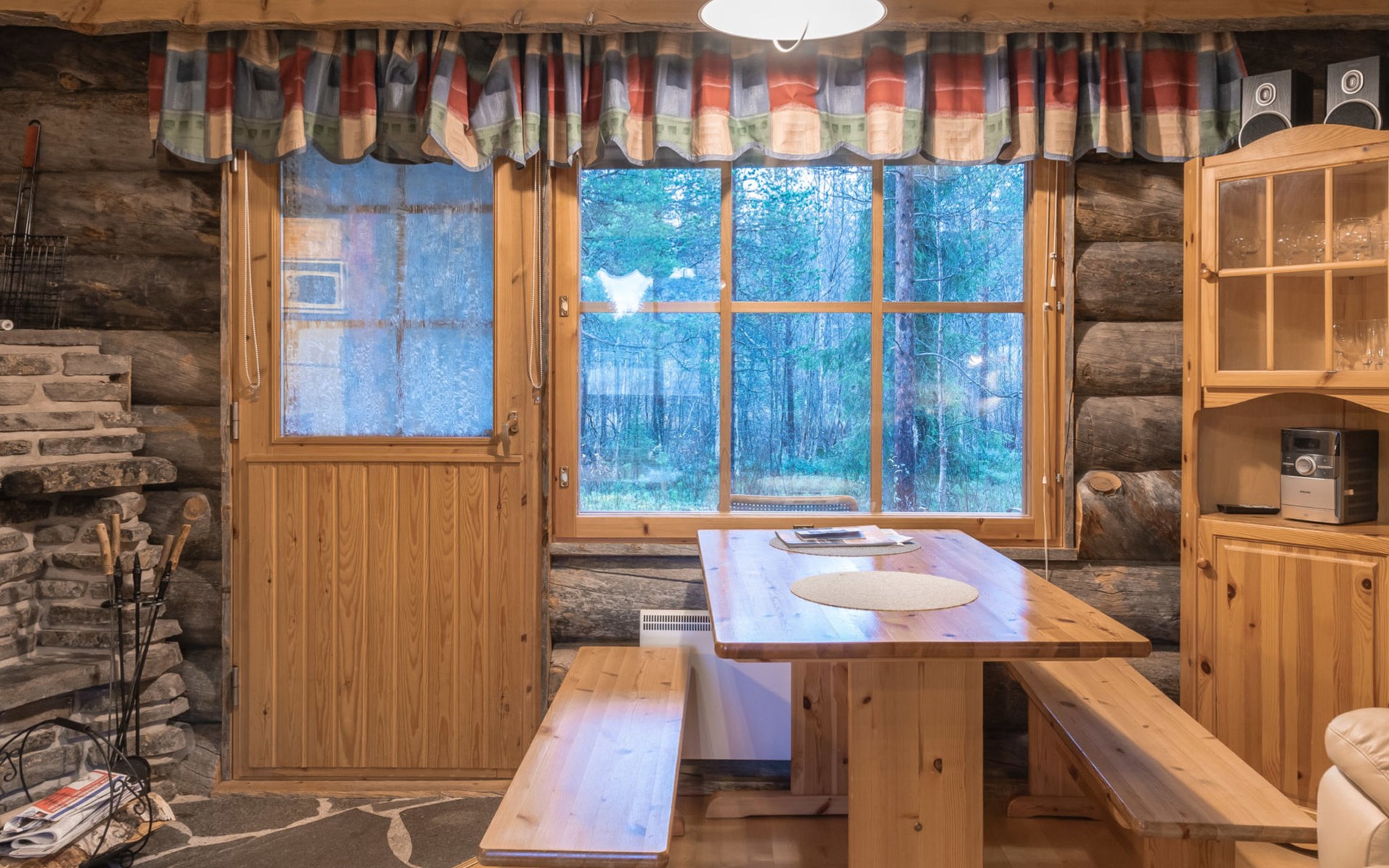 Living room with sofa bed (sleeping area spread out 140x200 cm), 15 m² loft has two sleeping areas, separated by partition wall, one area with bunk bed, another (lower one) with double bed (width 160 cm). Sauna with electric stove, bathroom/toilet, hallway and small covered porch. Narrow staircase, rather steep stairs to the loft.