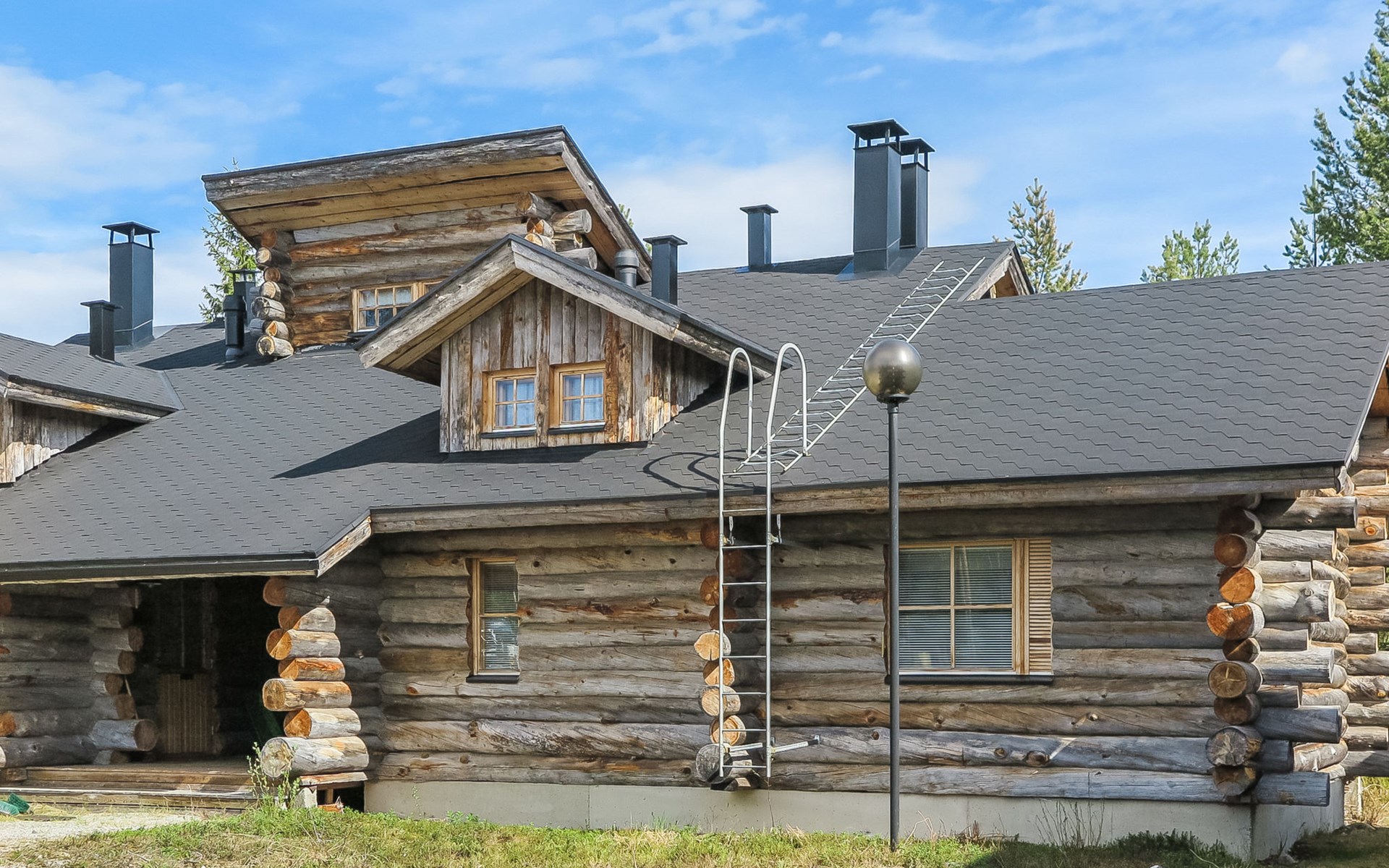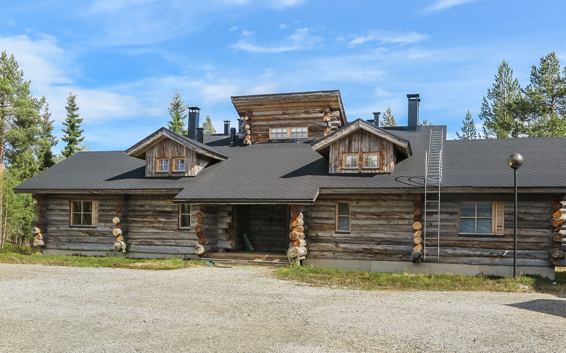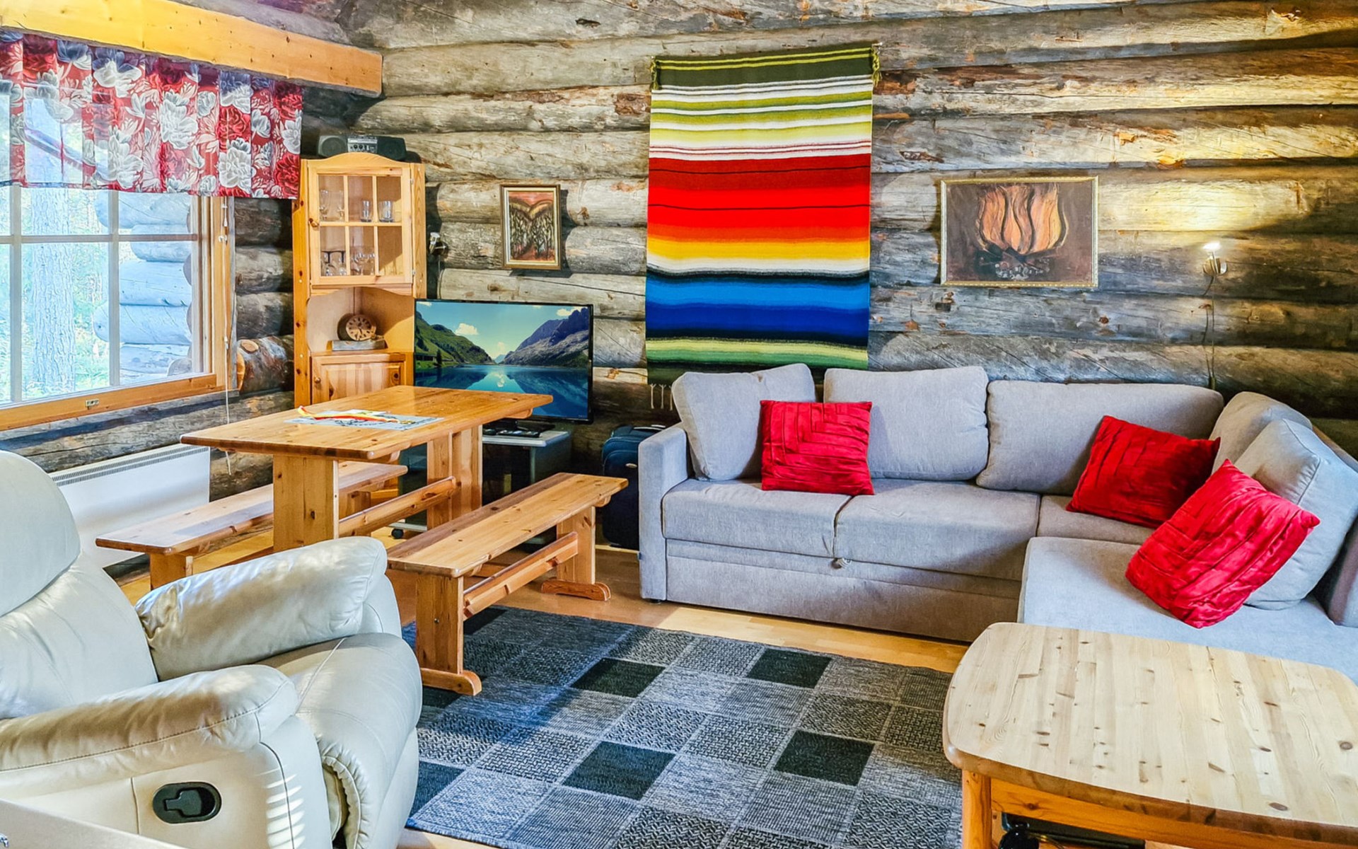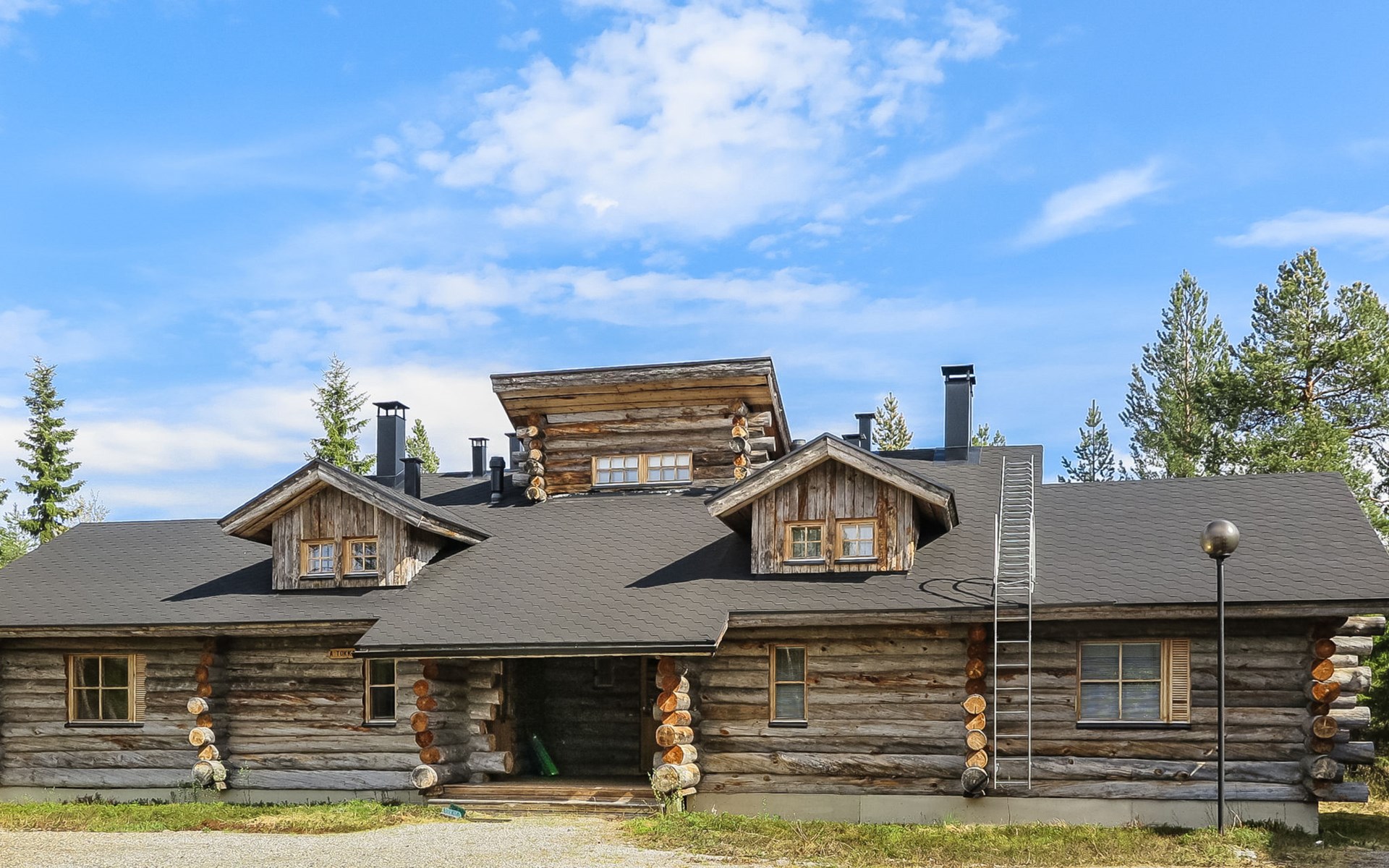 Living room with sofa bed (sleeping area spread out 140x200 cm), 15 m² loft has two sleeping areas, separated by partition wall, one area with bunk bed, another (lower one) with double bed (width 160 cm). Sauna with electric stove, bathroom/toilet, hallway and small covered porch. Narrow staircase, rather steep stairs to the loft.