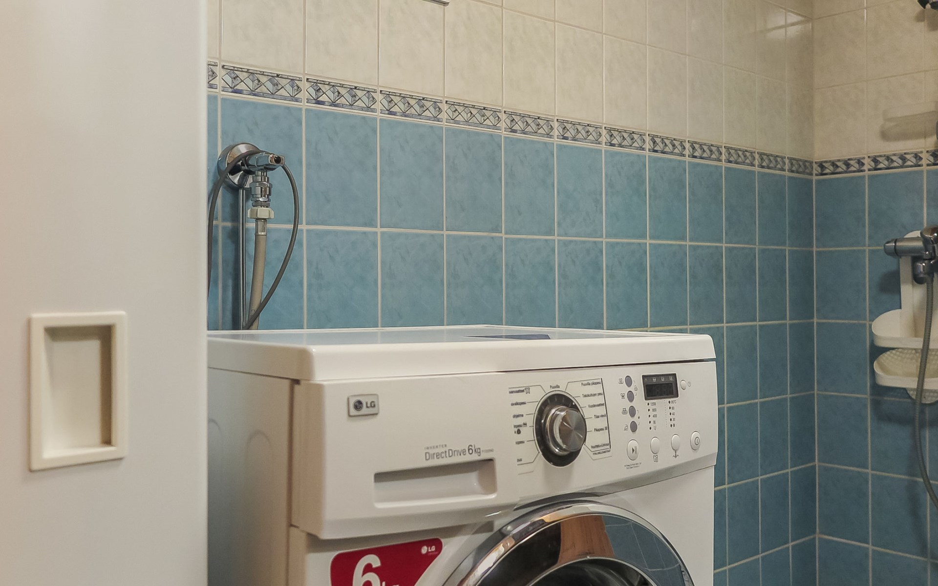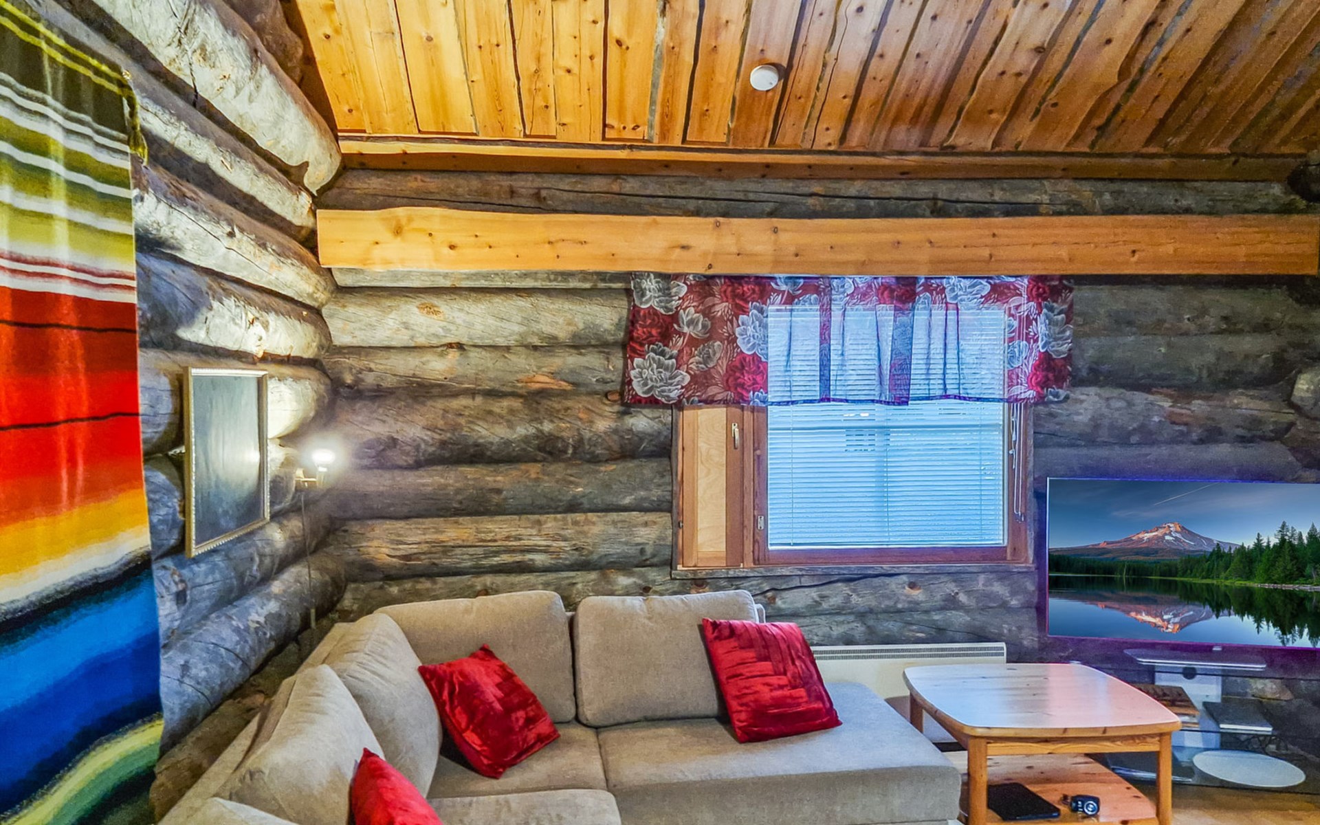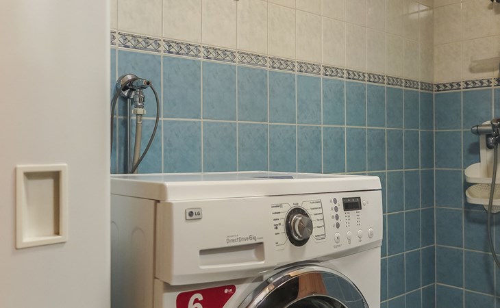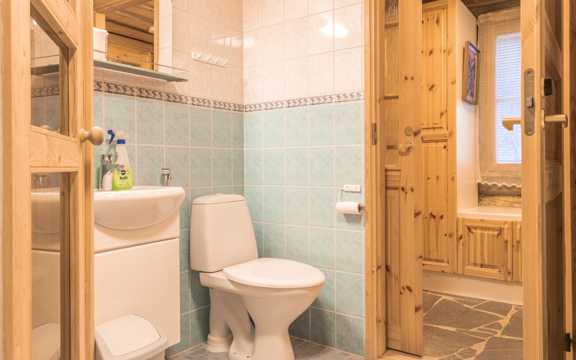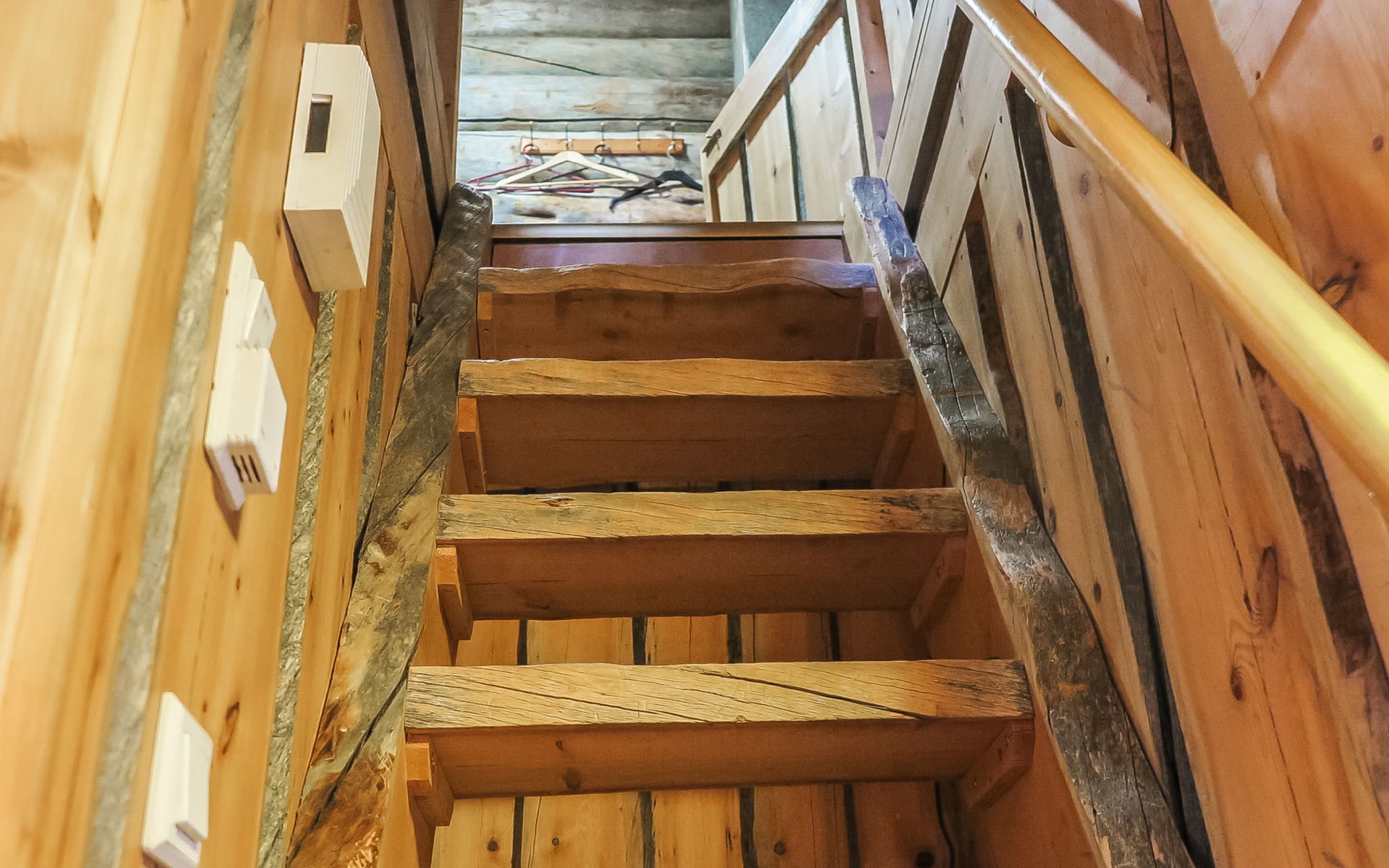 Living room with sofa bed (sleeping area spread out 140x200 cm), 15 m² loft has two sleeping areas, separated by partition wall, one area with bunk bed, another (lower one) with double bed (width 160 cm). Sauna with electric stove, bathroom/toilet, hallway and small covered porch. Narrow staircase, rather steep stairs to the loft.
