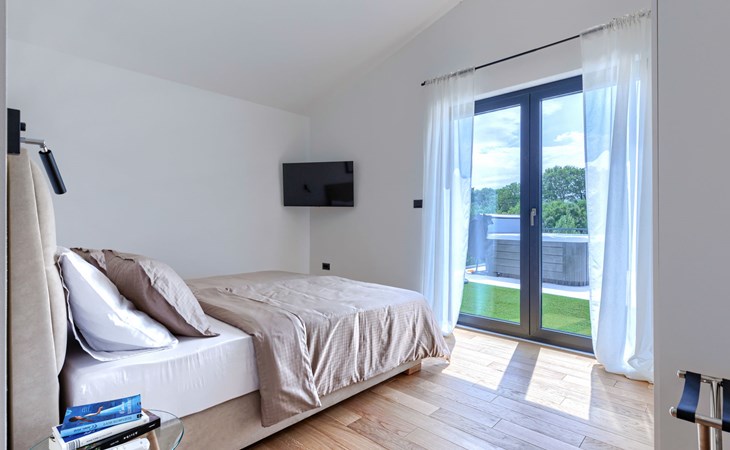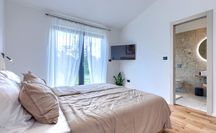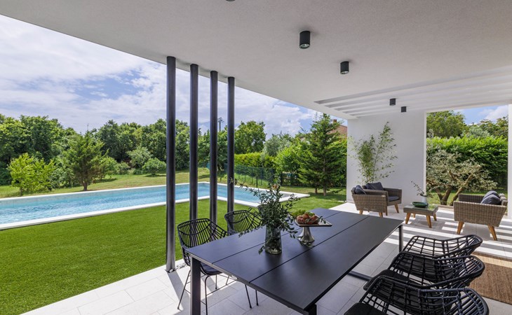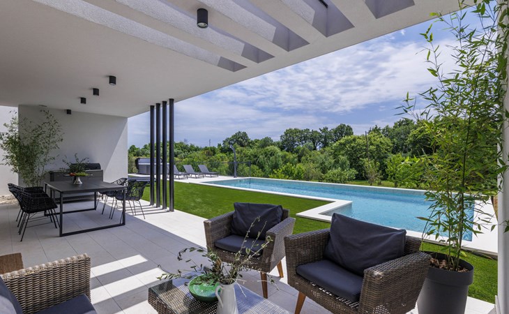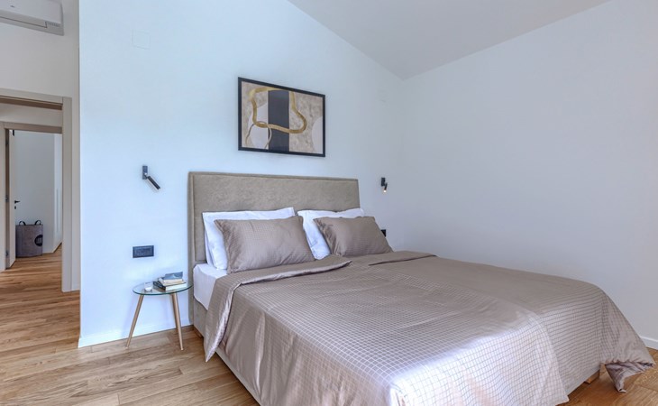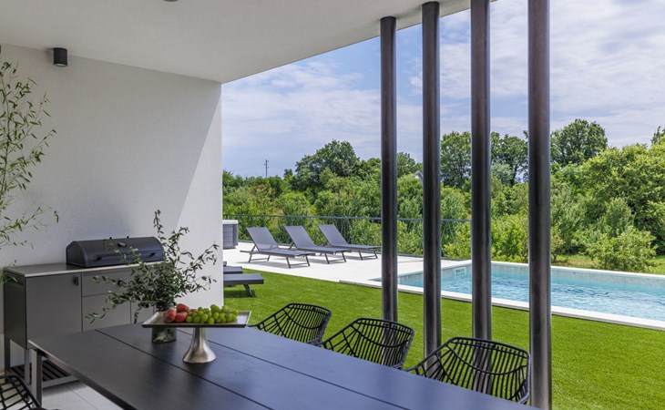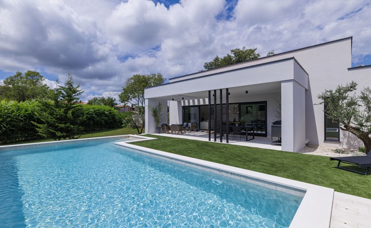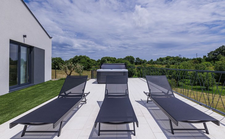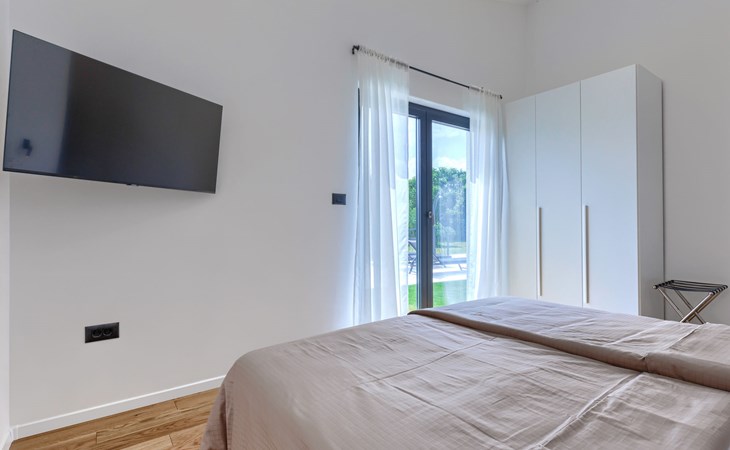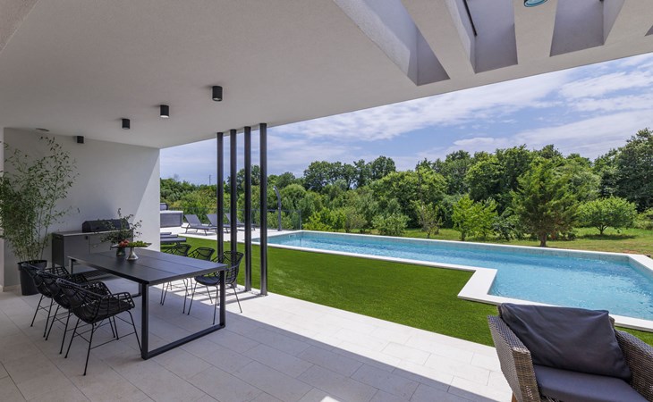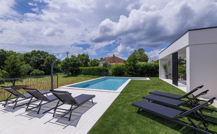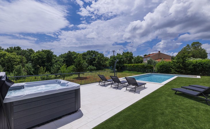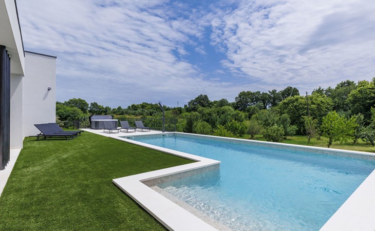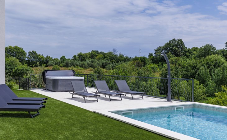 Marčana 11 km van Pula: Moderne, mooi eengezinswoning "Villa Valla". In het gehucht Veliki Vareški, 5 km van het centrum van Marčana, 18 km van het centrum van Pula, 4.5 km van zee, 4.5 km van het strand, te midden van groen. Voor alleengebruik: terrein 1.200 m2 (omheind), gazon 500 m2, openluchtzwembad hoekig (10 x 4 m, 40 m2, 140 cm diepte, seizoensgebonden beschikbaarheid: 04.Mei. - 19.Okt.) met trap en zout-elektrolyse. Buitendouche, hot tub, tafeltennis, volleybal, badminton, terras (6 m2), tuinmeubelen, barbecue (glijbaan, schommel). In het huis: internetaansluiting, air-conditioning, alarmsysteem, wasmachine. Parkeerplaats (voor 3 auto's) op het terrein. Winkel 3 km, restaurant 2.5 km, bushalte 5.1 km, kiezelstrand 4.5 km, rotsstrand 4.5 km.