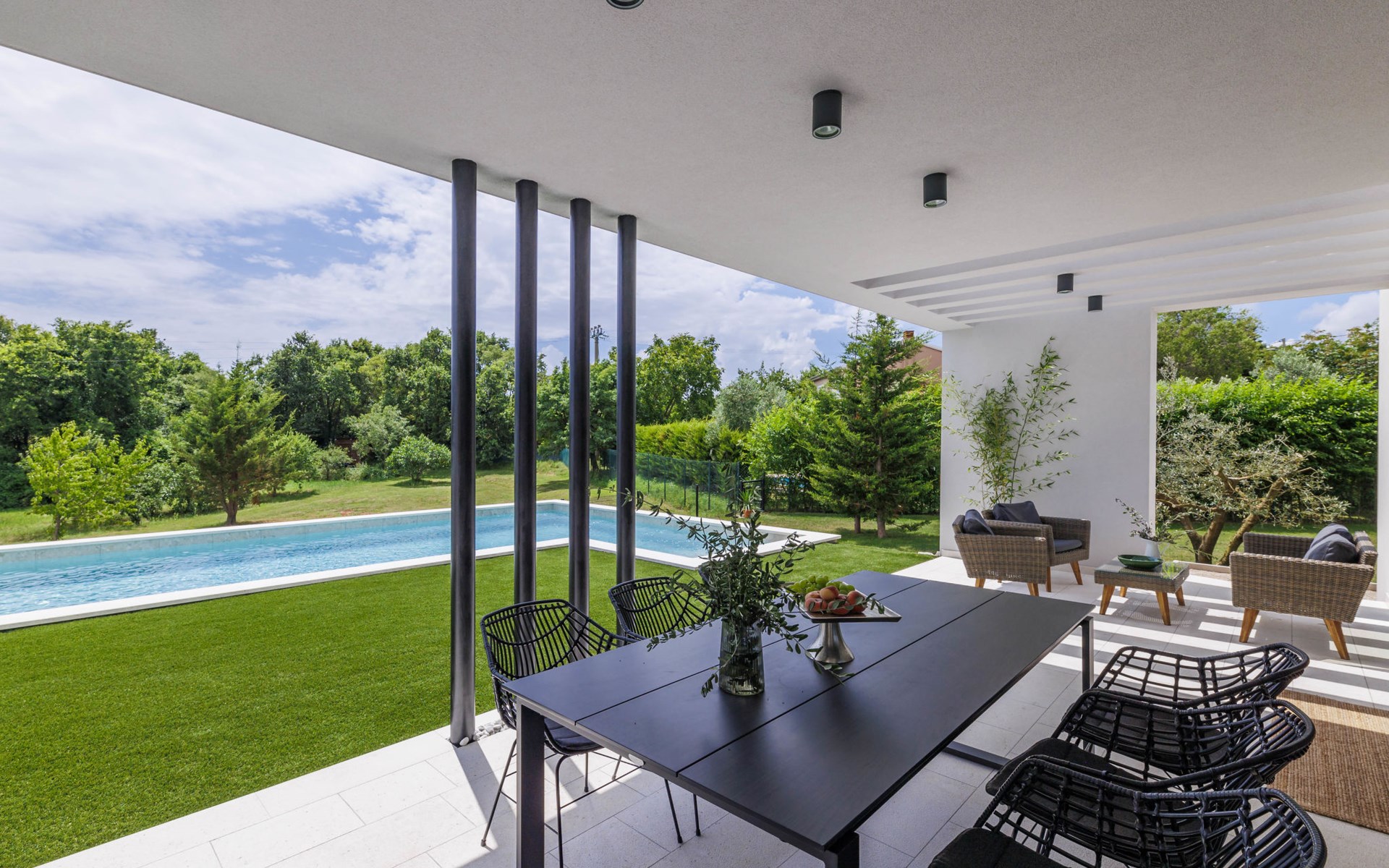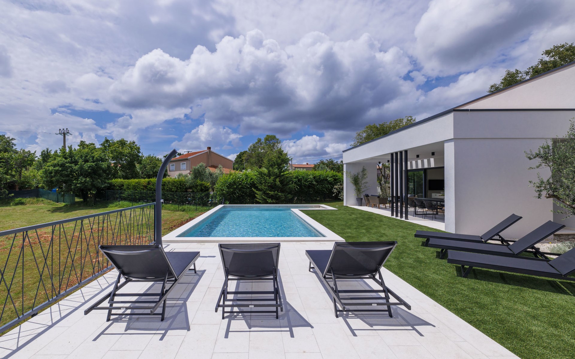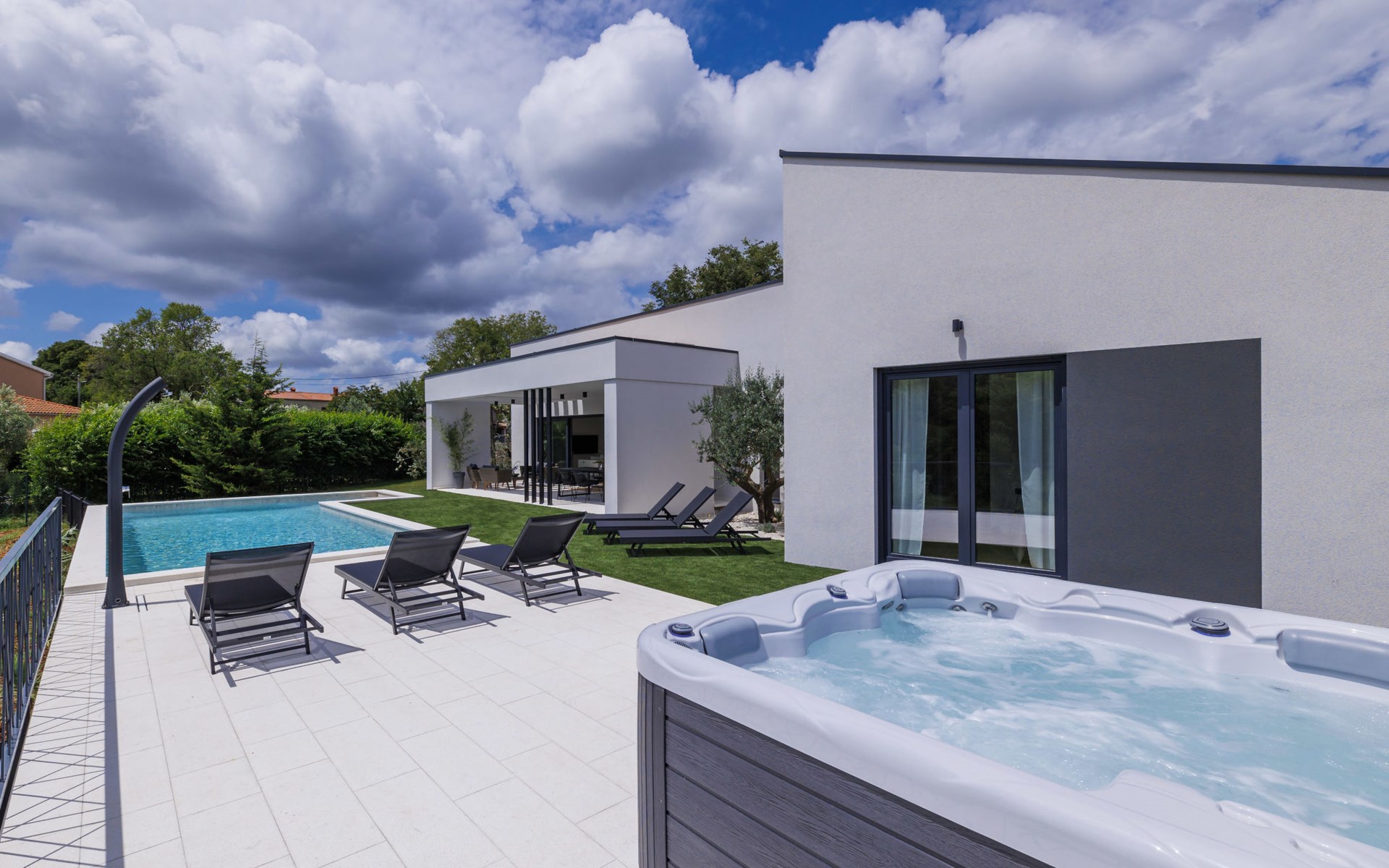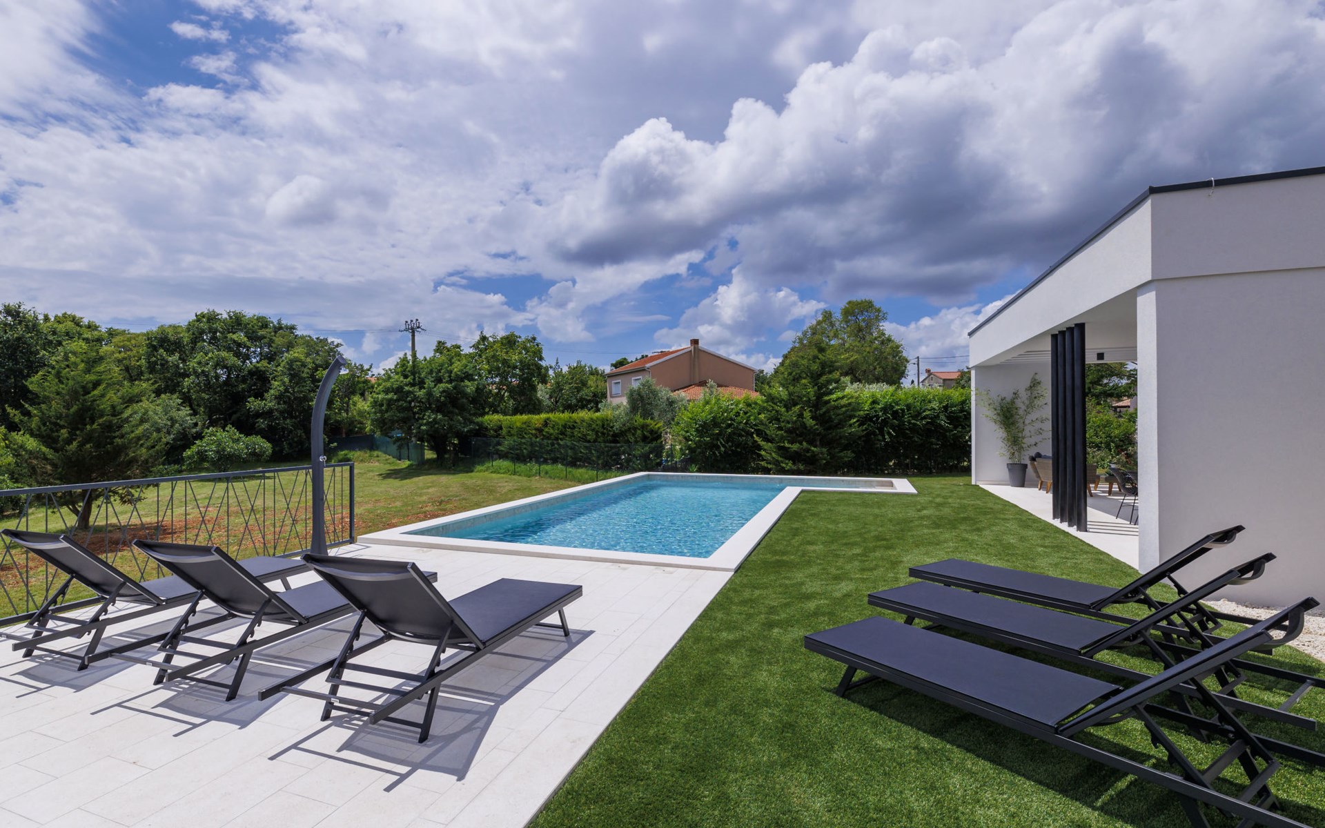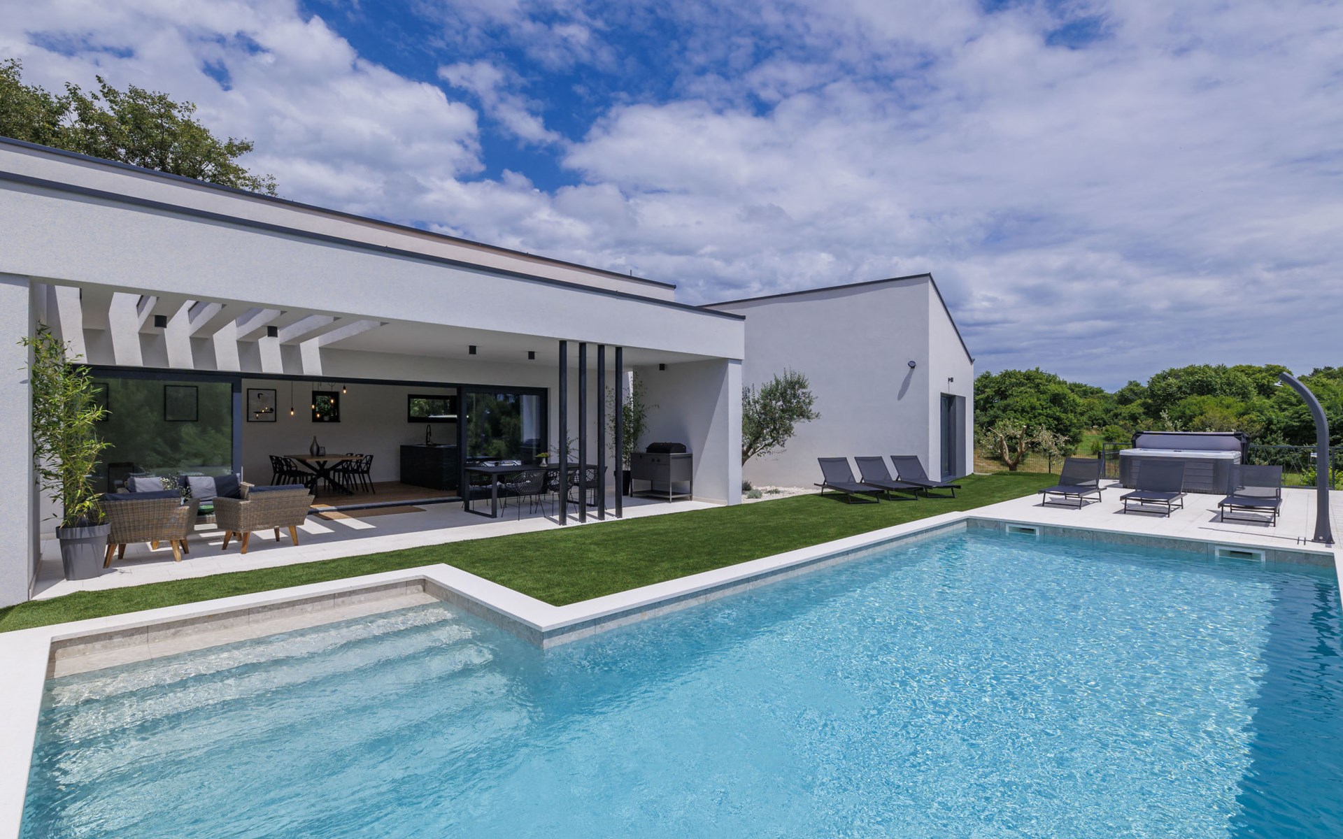 Marčana 11 km van Pula: Moderne, mooi eengezinswoning "Villa Valla". In het gehucht Veliki Vareški, 5 km van het centrum van Marčana, 18 km van het centrum van Pula, 4.5 km van zee, 4.5 km van het strand, te midden van groen. Voor alleengebruik: terrein 1.200 m2 (omheind), gazon 500 m2, openluchtzwembad hoekig (10 x 4 m, 40 m2, 140 cm diepte, seizoensgebonden beschikbaarheid: 04.Mei. - 19.Okt.) met trap en zout-elektrolyse. Buitendouche, hot tub, tafeltennis, volleybal, badminton, terras (6 m2), tuinmeubelen, barbecue (glijbaan, schommel). In het huis: internetaansluiting, air-conditioning, alarmsysteem, wasmachine. Parkeerplaats (voor 3 auto's) op het terrein. Winkel 3 km, restaurant 2.5 km, bushalte 5.1 km, kiezelstrand 4.5 km, rotsstrand 4.5 km.