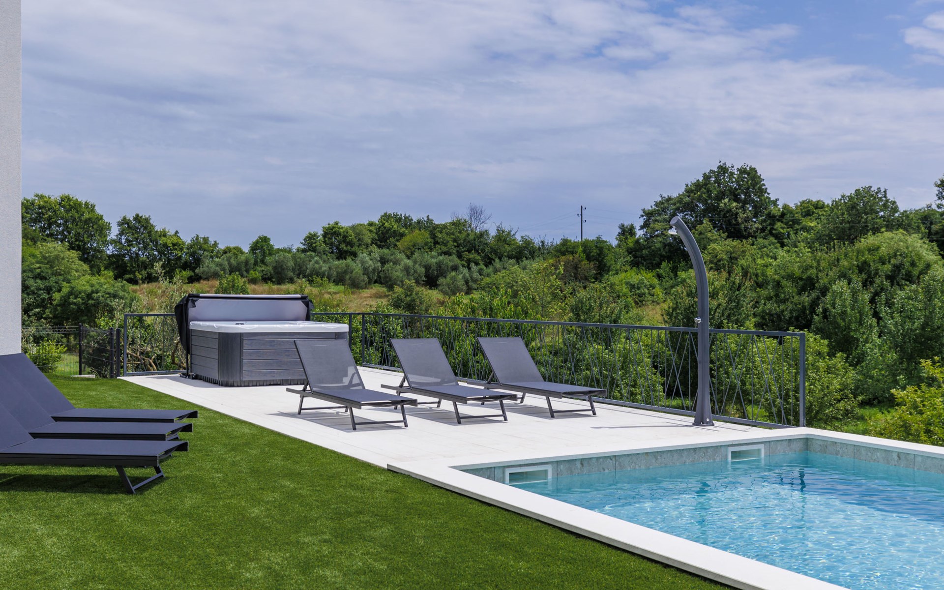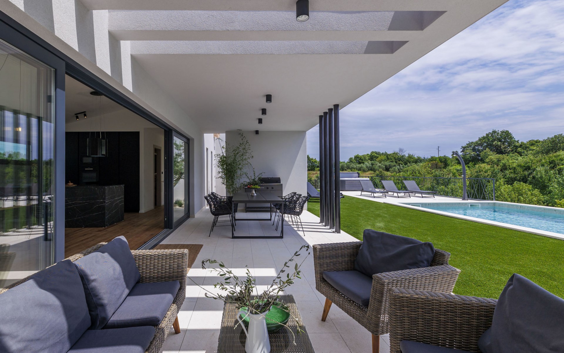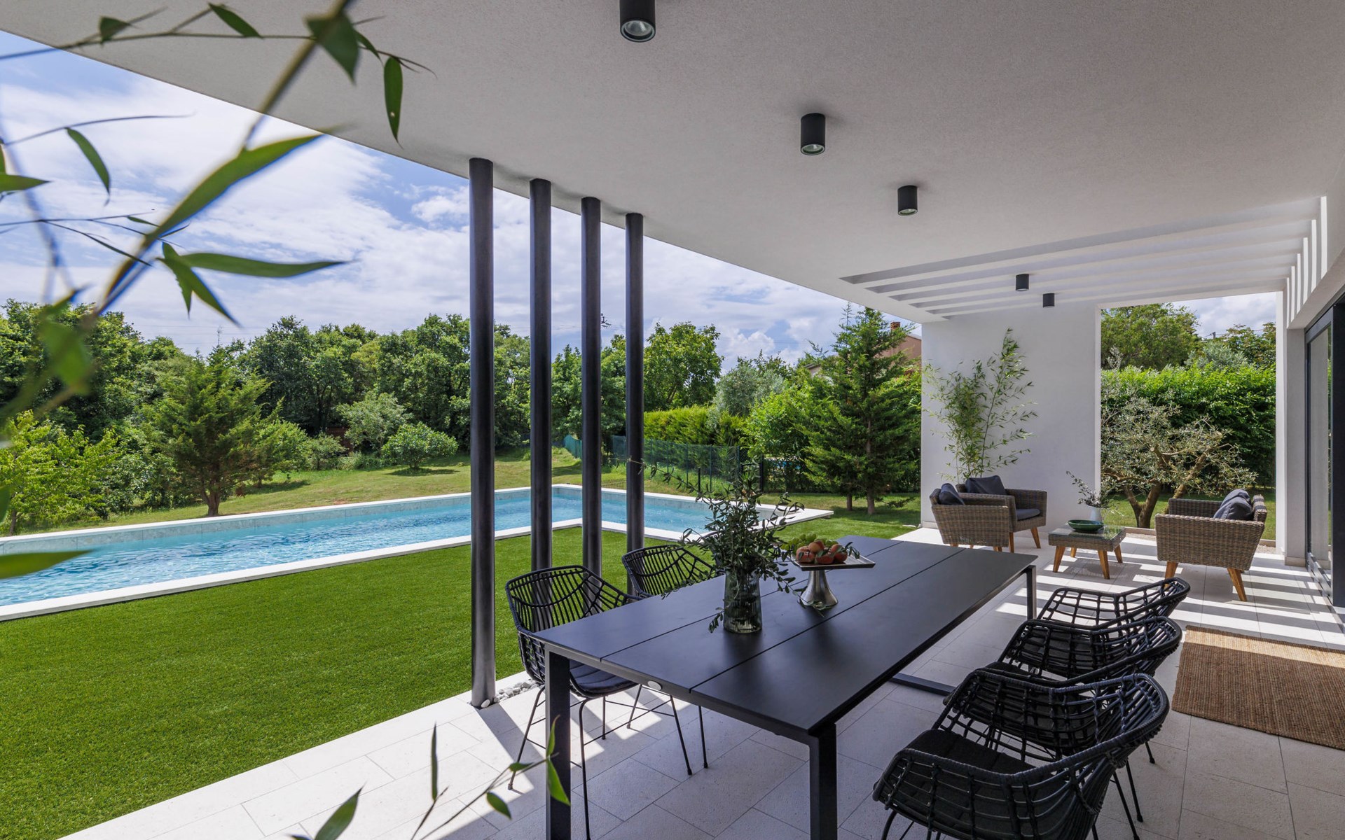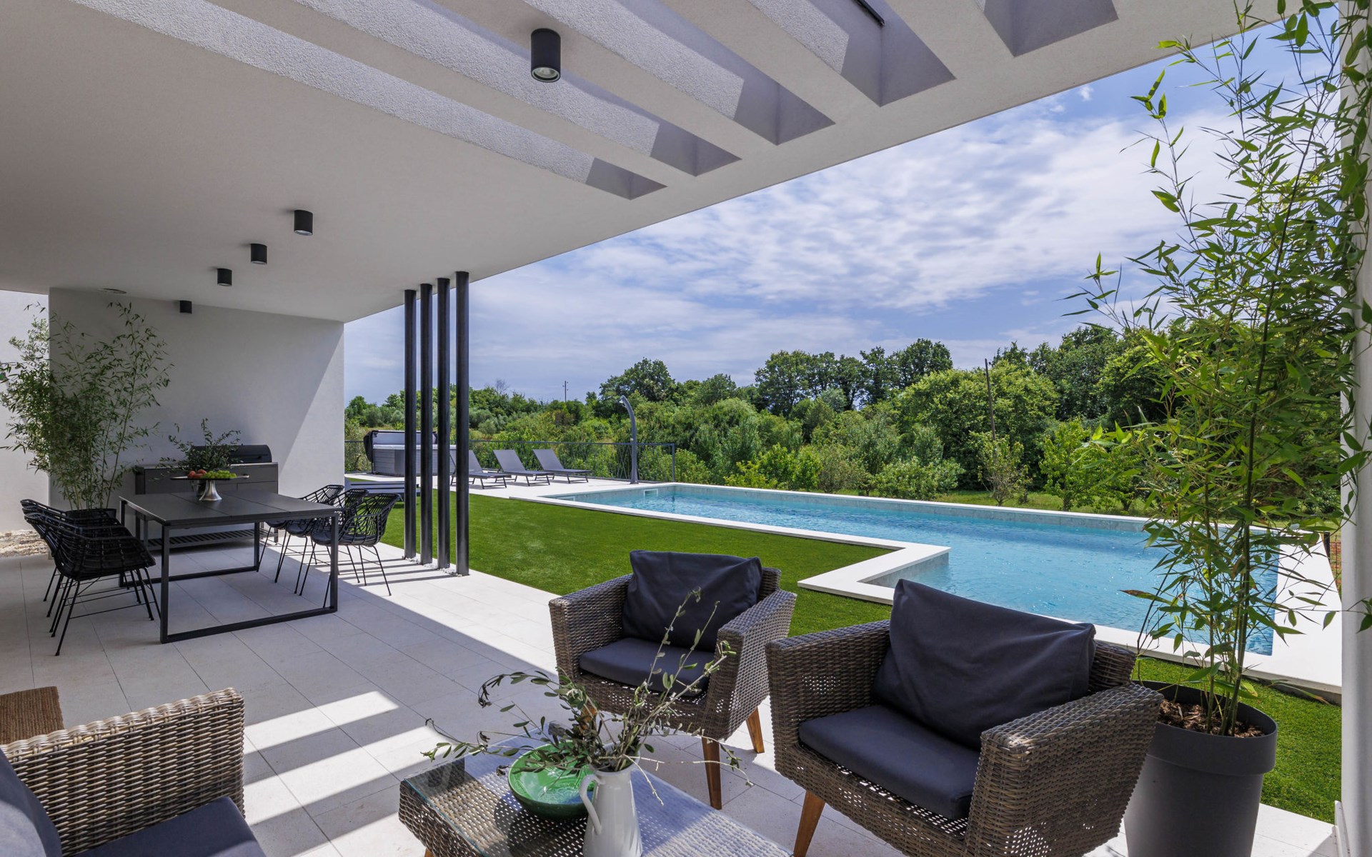 Marčana 11 km van Pula: Moderne, mooi eengezinswoning "Villa Valla". In het gehucht Veliki Vareški, 5 km van het centrum van Marčana, 18 km van het centrum van Pula, 4.5 km van zee, 4.5 km van het strand, te midden van groen. Voor alleengebruik: terrein 1.200 m2 (omheind), gazon 500 m2, openluchtzwembad hoekig (10 x 4 m, 40 m2, 140 cm diepte, seizoensgebonden beschikbaarheid: 04.Mei. - 19.Okt.) met trap en zout-elektrolyse. Buitendouche, hot tub, tafeltennis, volleybal, badminton, terras (6 m2), tuinmeubelen, barbecue (glijbaan, schommel). In het huis: internetaansluiting, air-conditioning, alarmsysteem, wasmachine. Parkeerplaats (voor 3 auto's) op het terrein. Winkel 3 km, restaurant 2.5 km, bushalte 5.1 km, kiezelstrand 4.5 km, rotsstrand 4.5 km.
