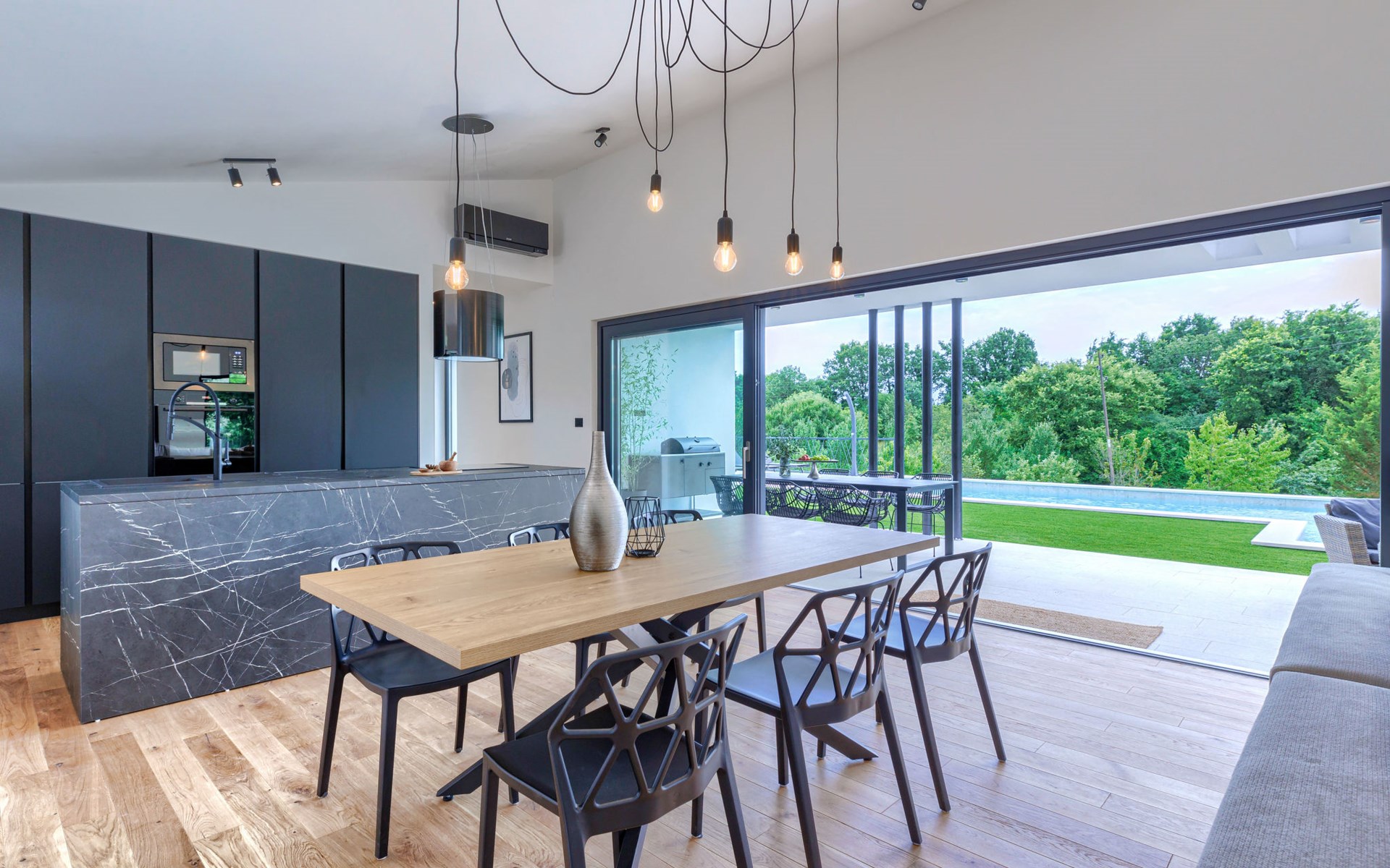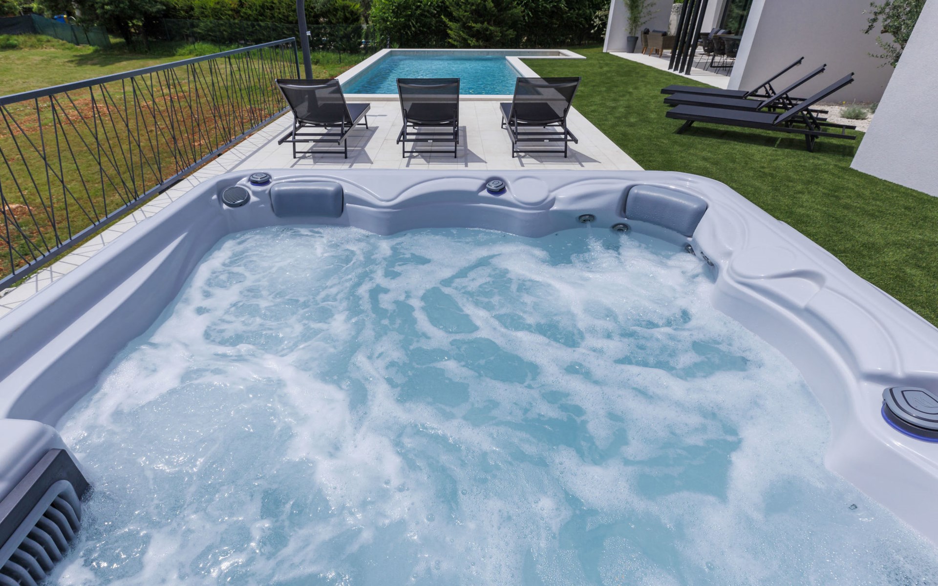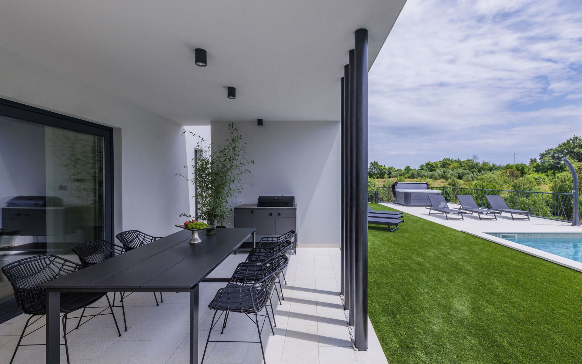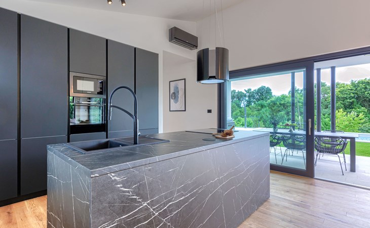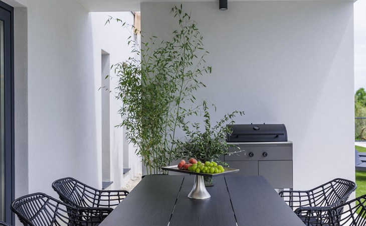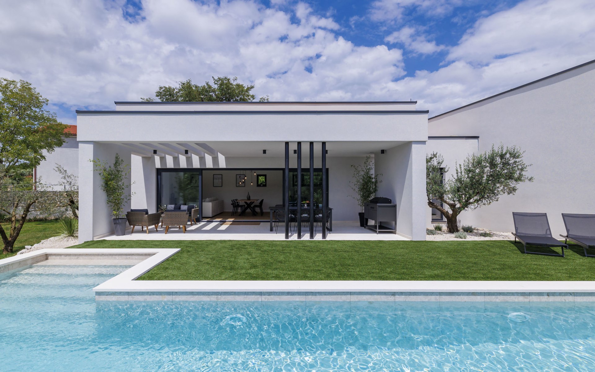 Marčana 11 km van Pula: Moderne, mooi eengezinswoning "Villa Valla". In het gehucht Veliki Vareški, 5 km van het centrum van Marčana, 18 km van het centrum van Pula, 4.5 km van zee, 4.5 km van het strand, te midden van groen. Voor alleengebruik: terrein 1.200 m2 (omheind), gazon 500 m2, openluchtzwembad hoekig (10 x 4 m, 40 m2, 140 cm diepte, seizoensgebonden beschikbaarheid: 04.Mei. - 19.Okt.) met trap en zout-elektrolyse. Buitendouche, hot tub, tafeltennis, volleybal, badminton, terras (6 m2), tuinmeubelen, barbecue (glijbaan, schommel). In het huis: internetaansluiting, air-conditioning, alarmsysteem, wasmachine. Parkeerplaats (voor 3 auto's) op het terrein. Winkel 3 km, restaurant 2.5 km, bushalte 5.1 km, kiezelstrand 4.5 km, rotsstrand 4.5 km.