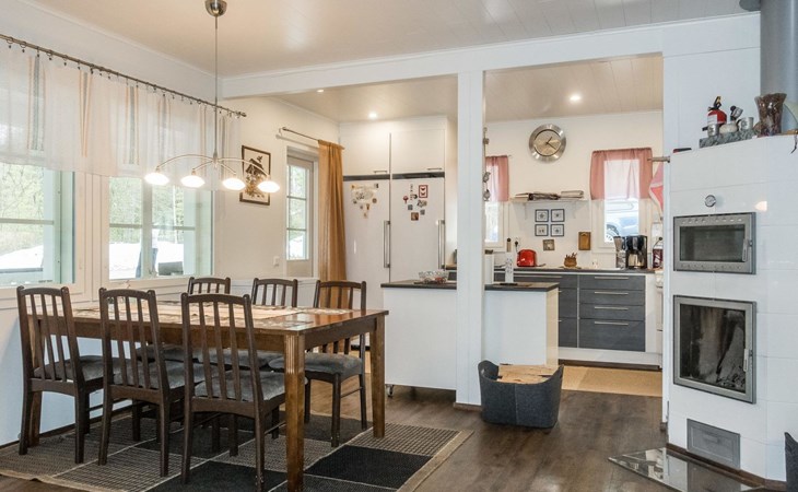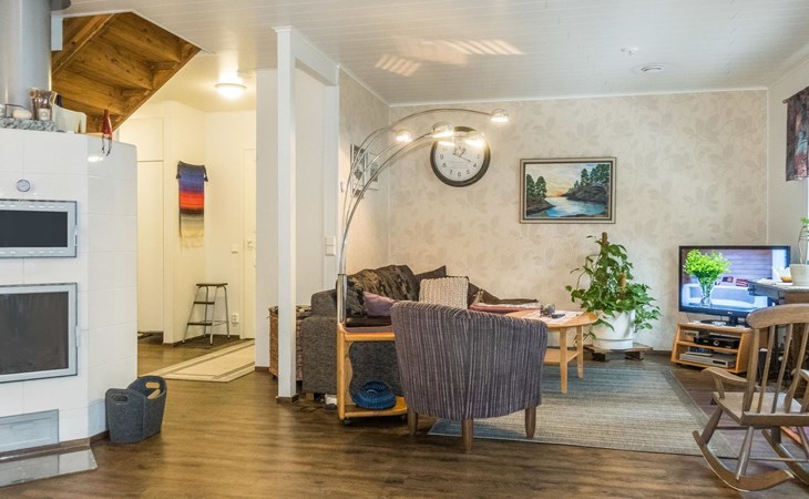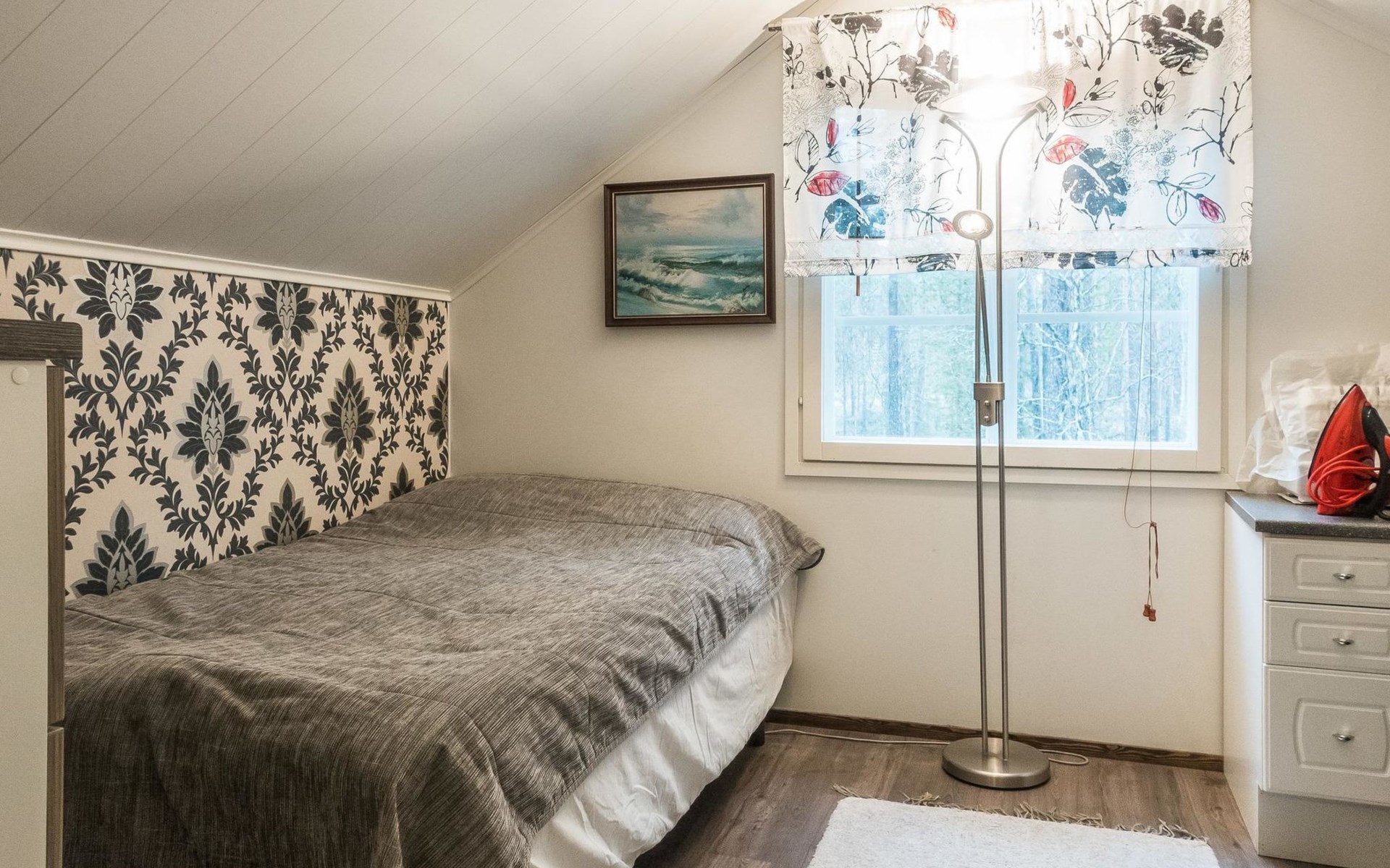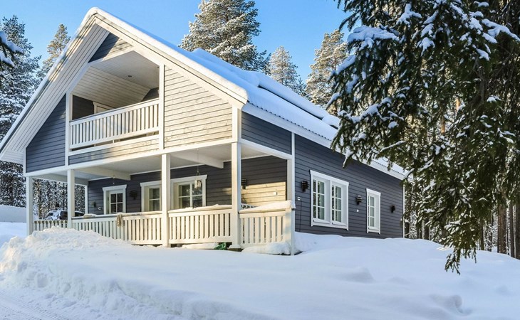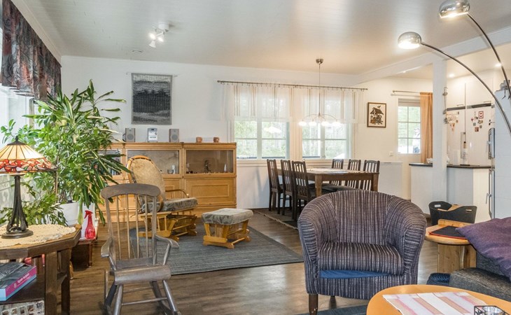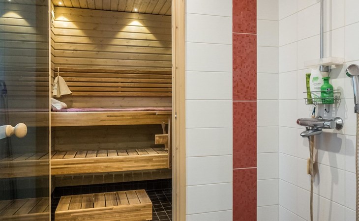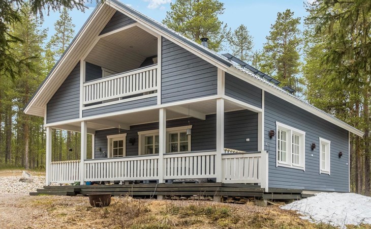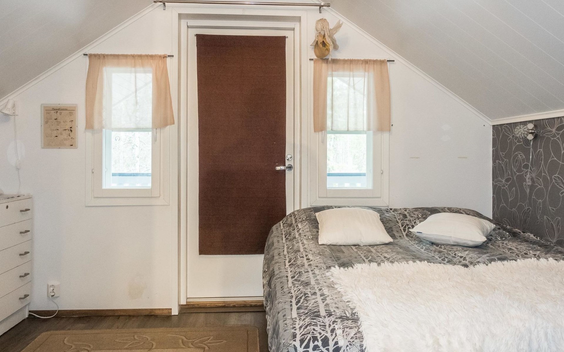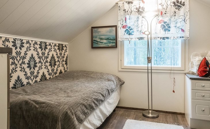 Wooden cabin, built in 2014. Downstairs living room/kitchen with sofa bed, sauna, washroom/toilet and a large, covered terrace. Upstairs, one bedroom has a double bed and the other has a 120 cm and 140 cm wide beds, WC and balcony. One movable mattress, which can be placed as needed.