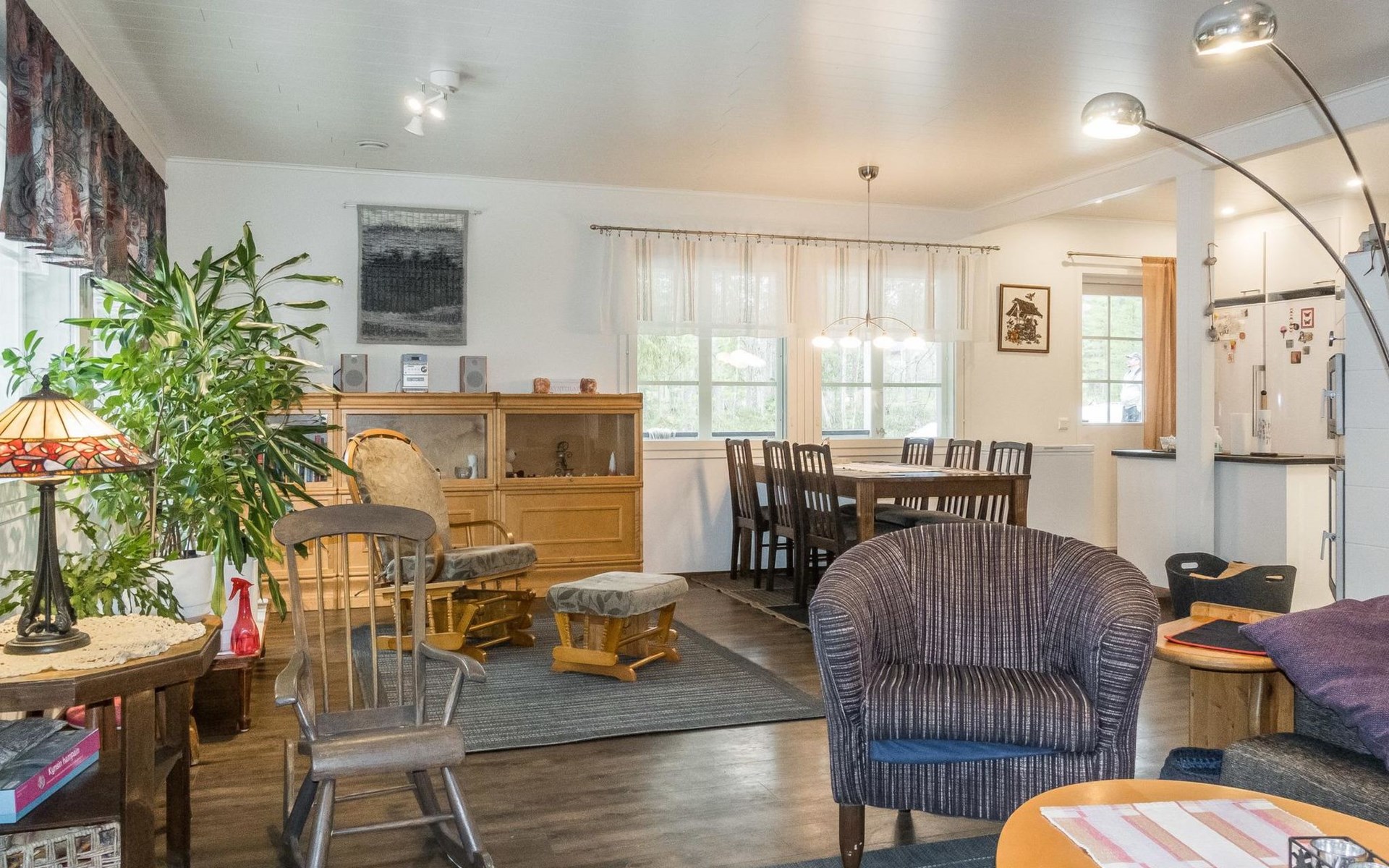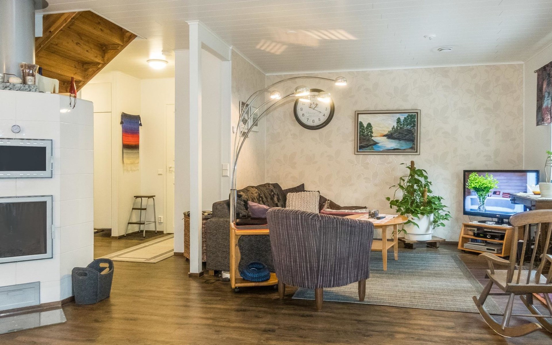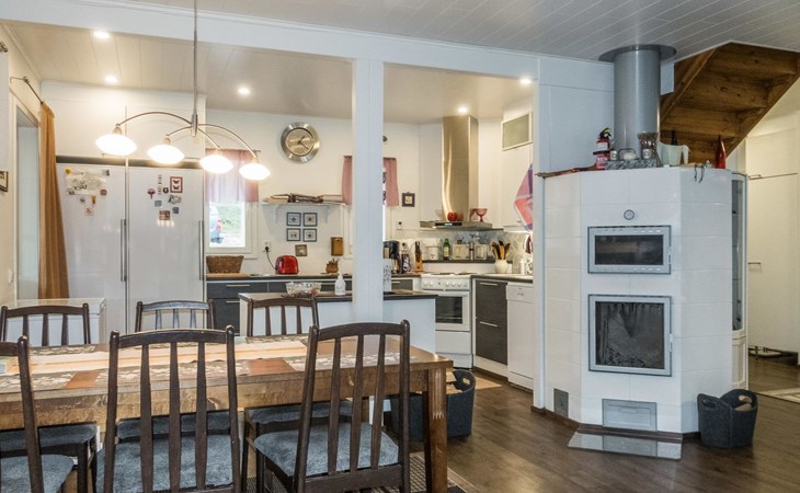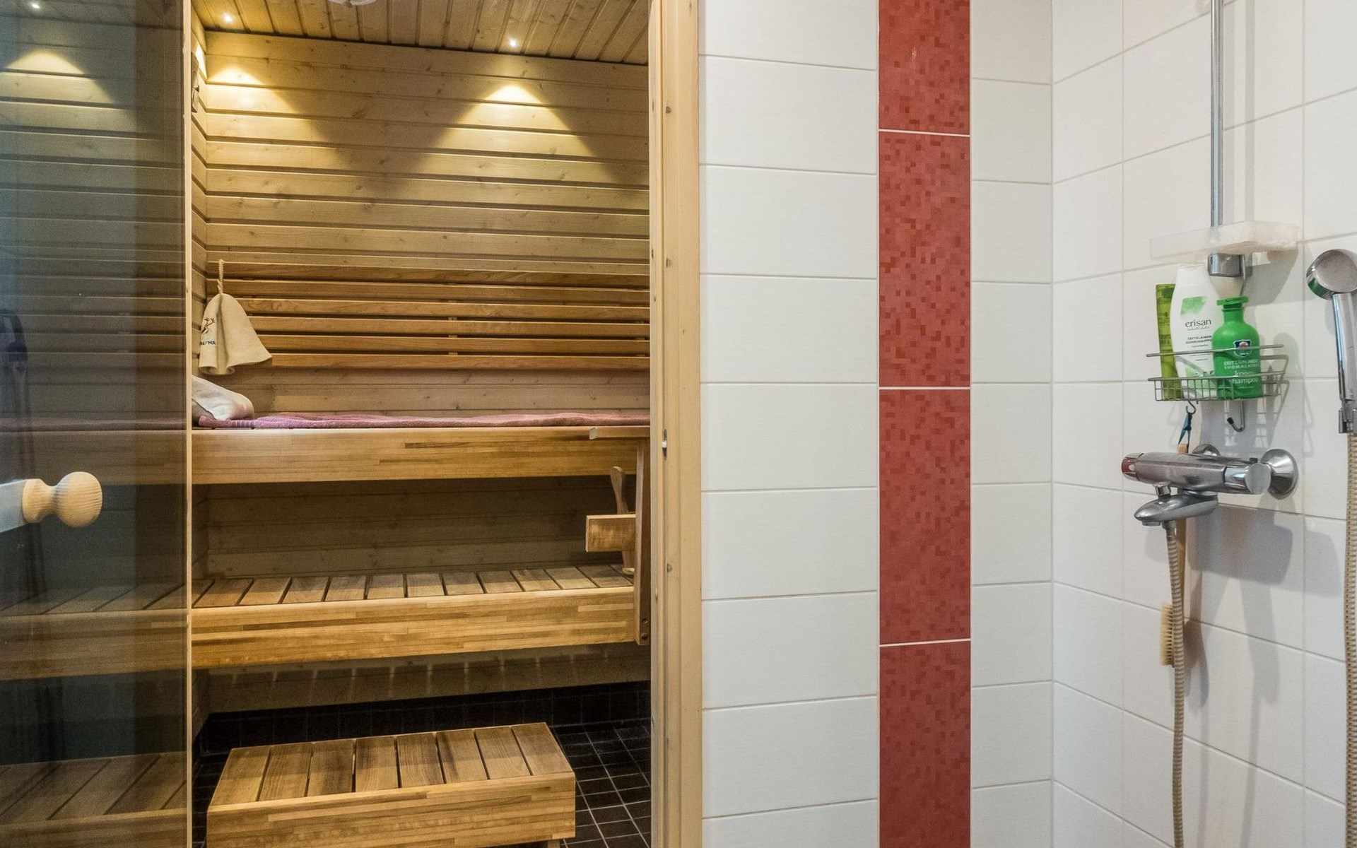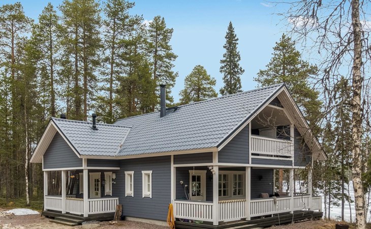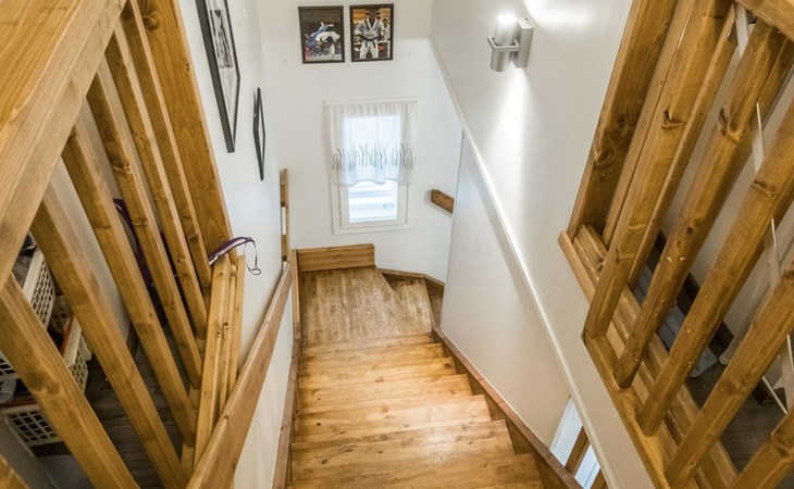 Wooden cabin, built in 2014. Downstairs living room/kitchen with sofa bed, sauna, washroom/toilet and a large, covered terrace. Upstairs, one bedroom has a double bed and the other has a 120 cm and 140 cm wide beds, WC and balcony. One movable mattress, which can be placed as needed.