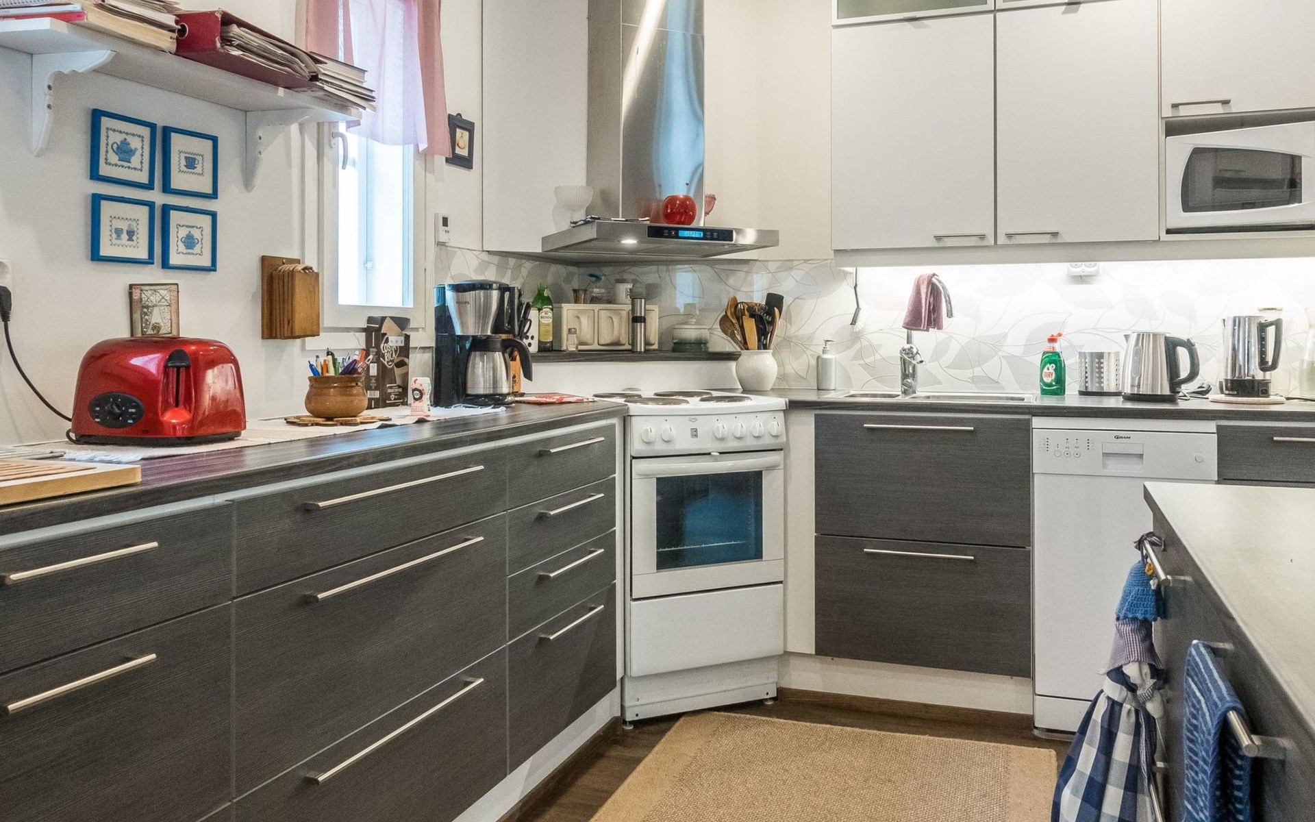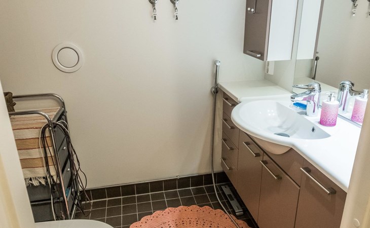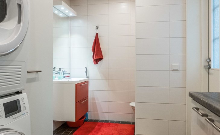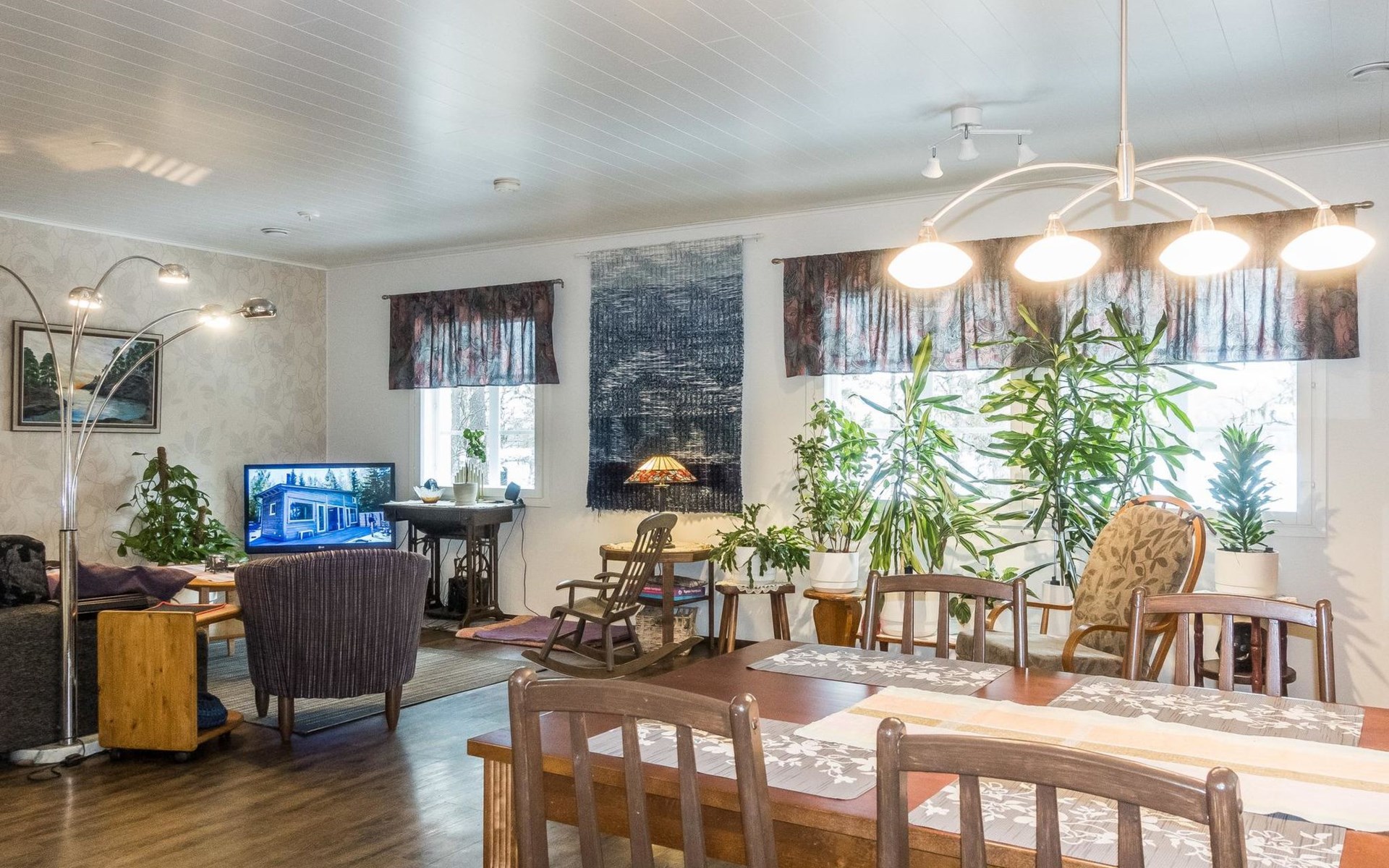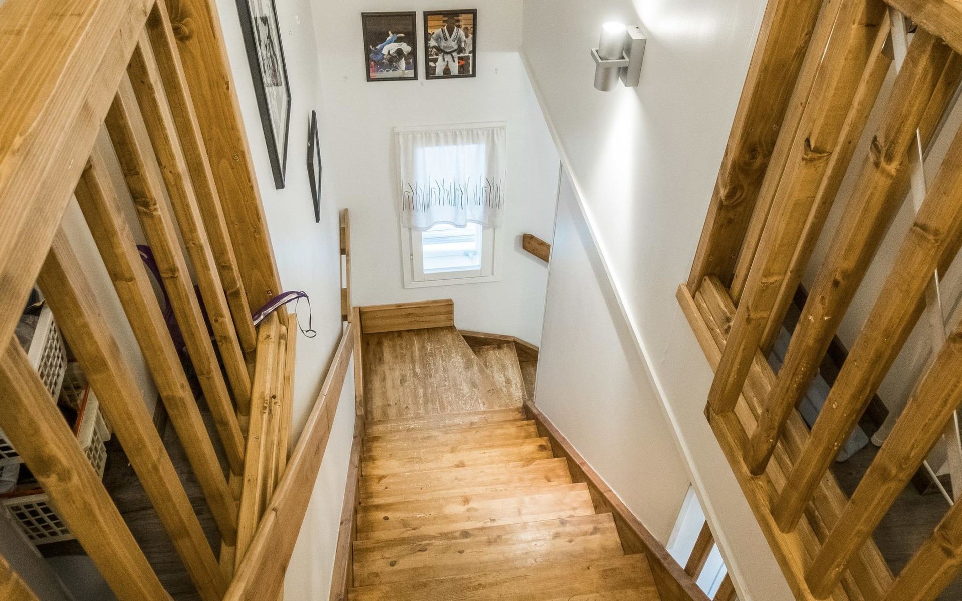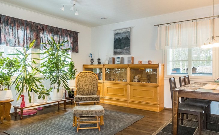 Wooden cabin, built in 2014. Downstairs living room/kitchen with sofa bed, sauna, washroom/toilet and a large, covered terrace. Upstairs, one bedroom has a double bed and the other has a 120 cm and 140 cm wide beds, WC and balcony. One movable mattress, which can be placed as needed.