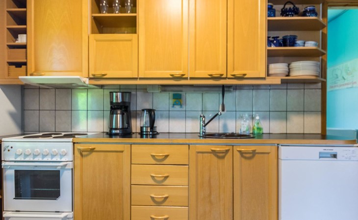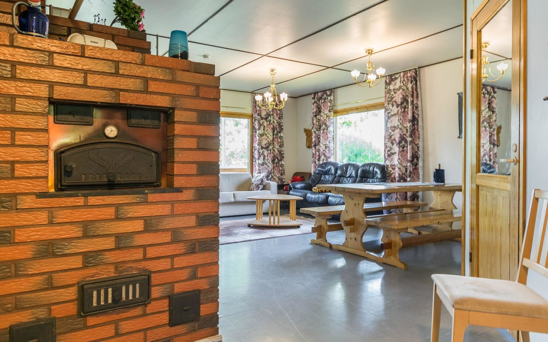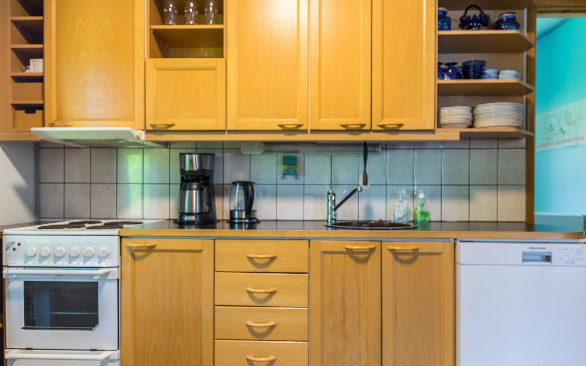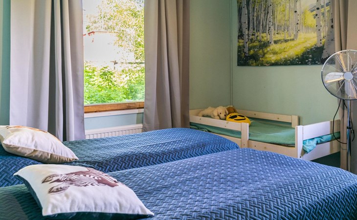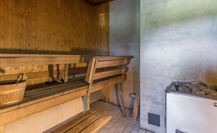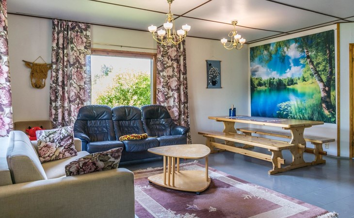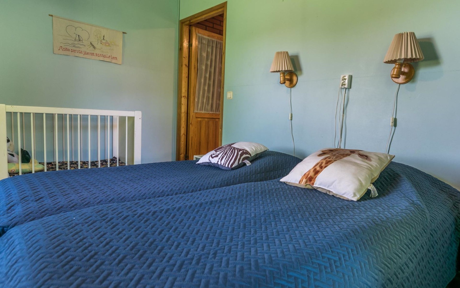 The wooden cabin, built in 1995. The ground floor features a living room with a sofa set, dining table, heat-storing fireplace, and TV. A kitchenette includes a stove, refrigerator and freezer, dishwasher, microwave, coffee maker, and kettle. Two bedrooms — one with two beds plus an extendable children’s bed and a crib, and the other with two beds. Separate WC, sauna with wood-burning stove, shower, and dressing room.