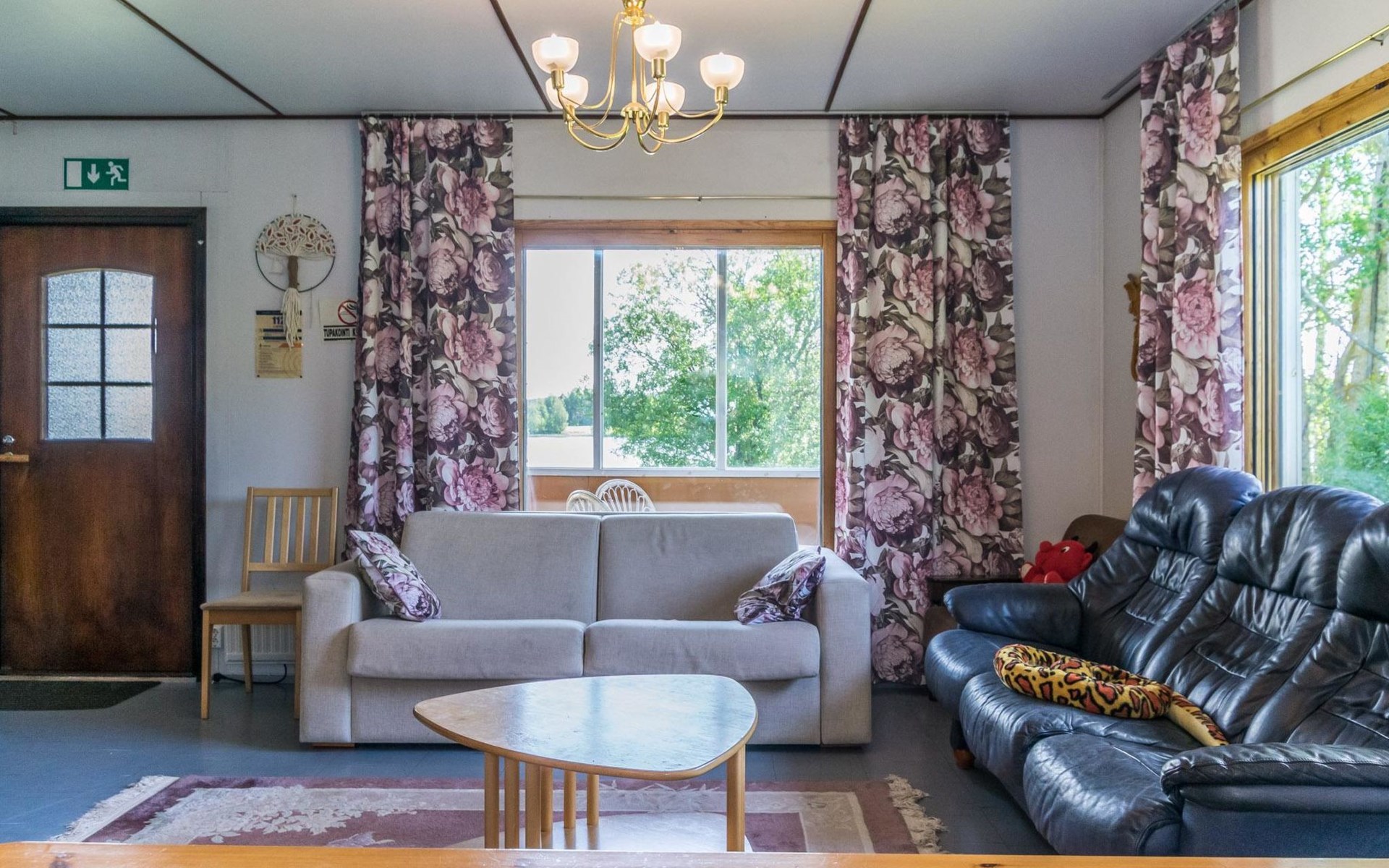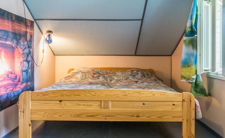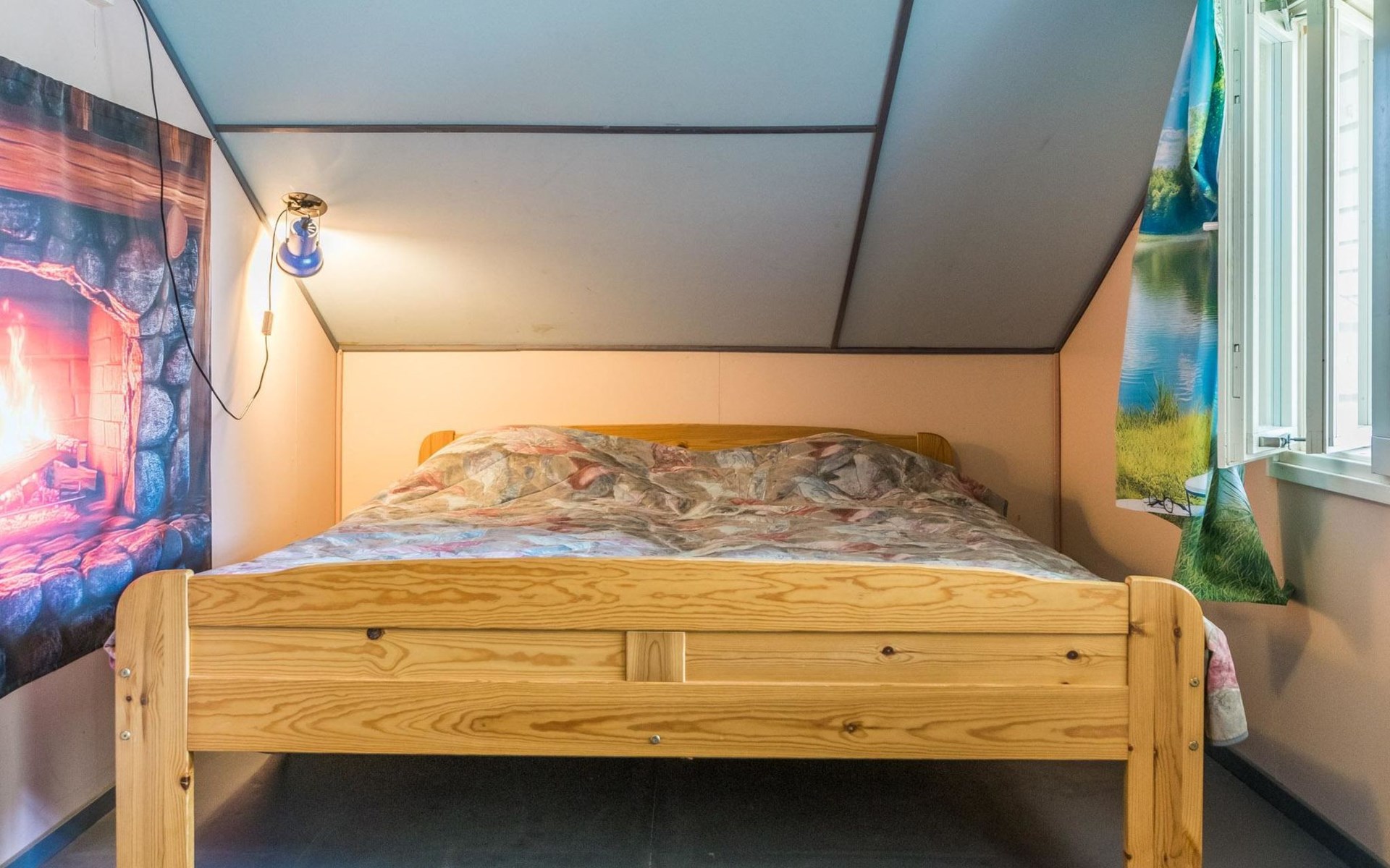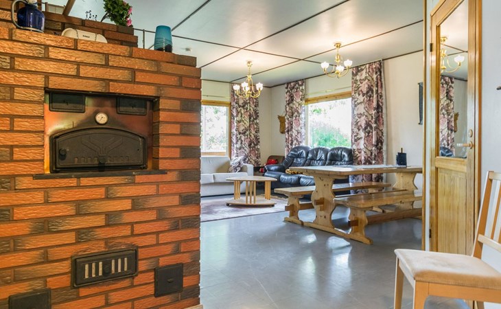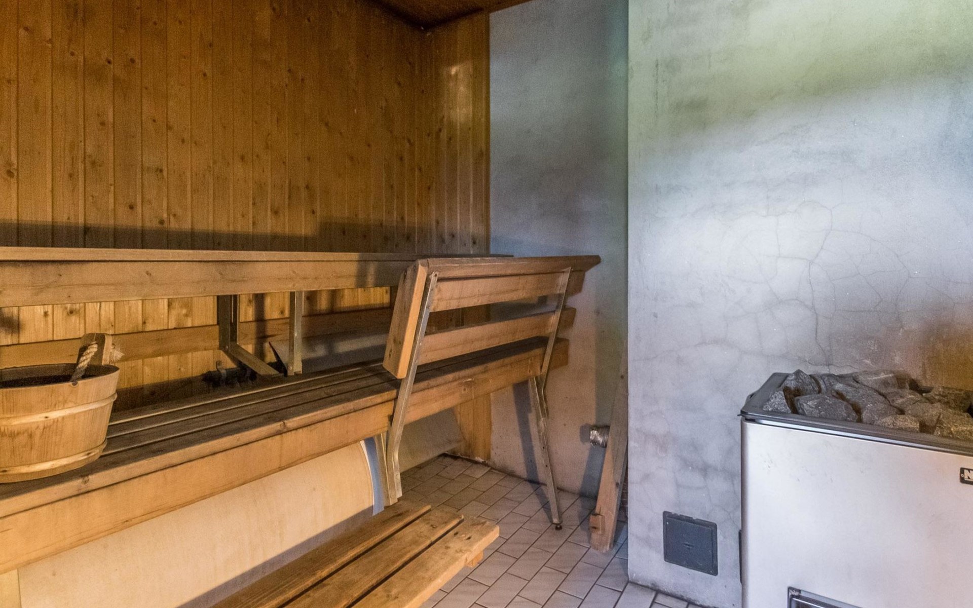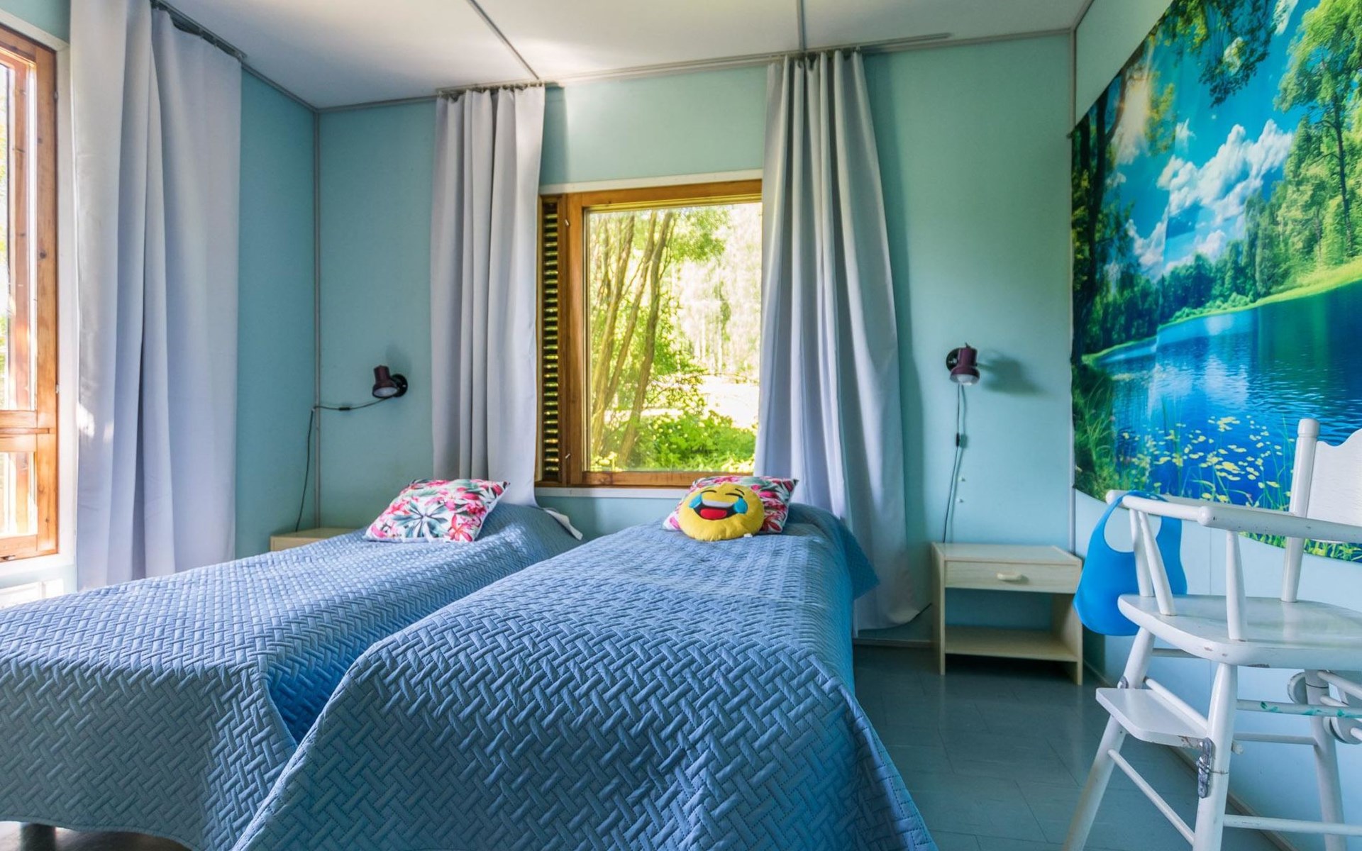 The wooden cabin, built in 1995. The ground floor features a living room with a sofa set, dining table, heat-storing fireplace, and TV. A kitchenette includes a stove, refrigerator and freezer, dishwasher, microwave, coffee maker, and kettle. Two bedrooms — one with two beds plus an extendable children’s bed and a crib, and the other with two beds. Separate WC, sauna with wood-burning stove, shower, and dressing room.