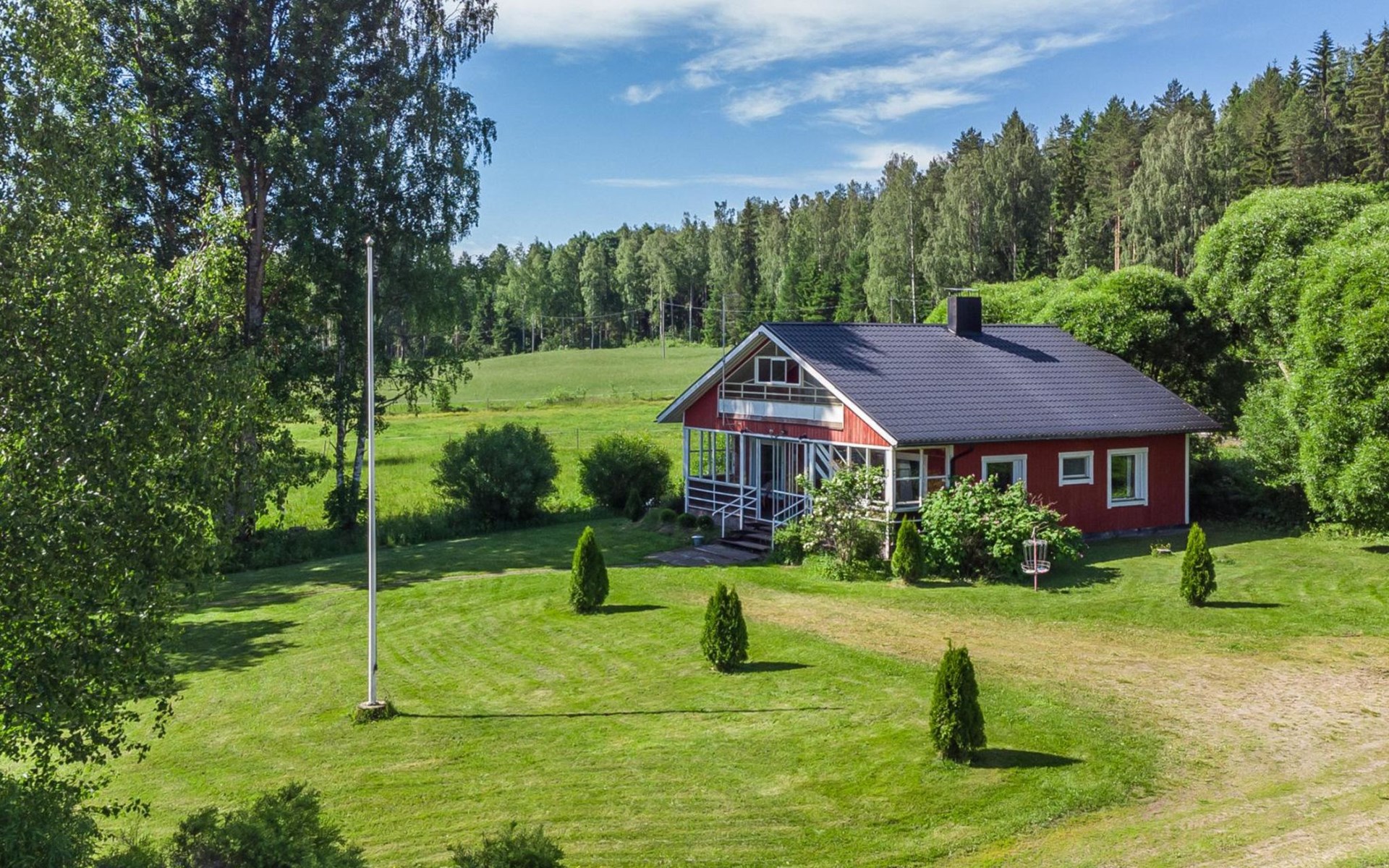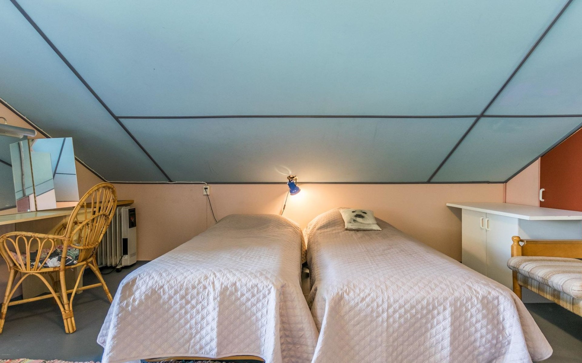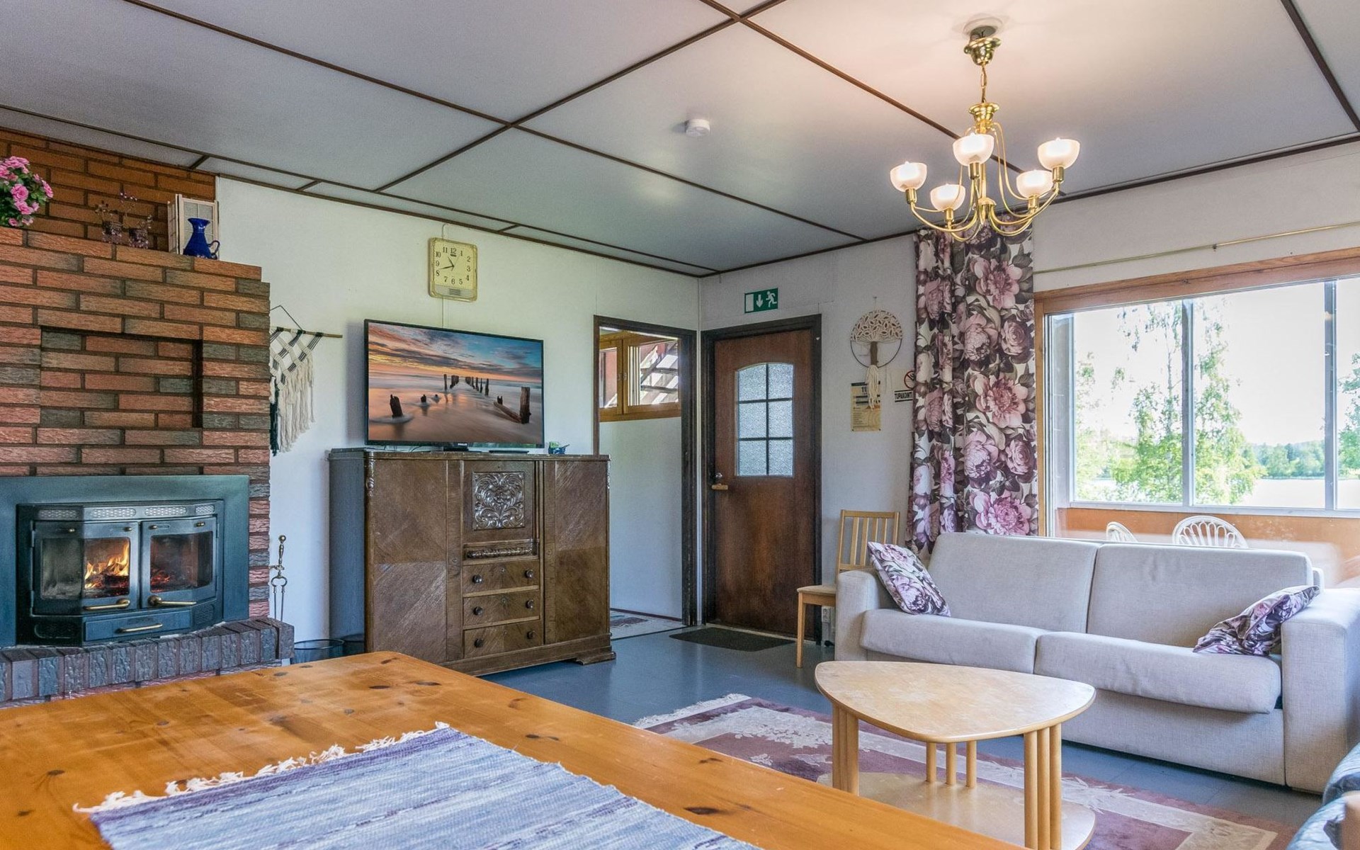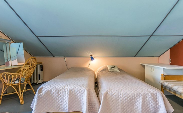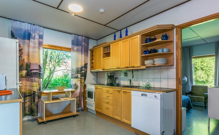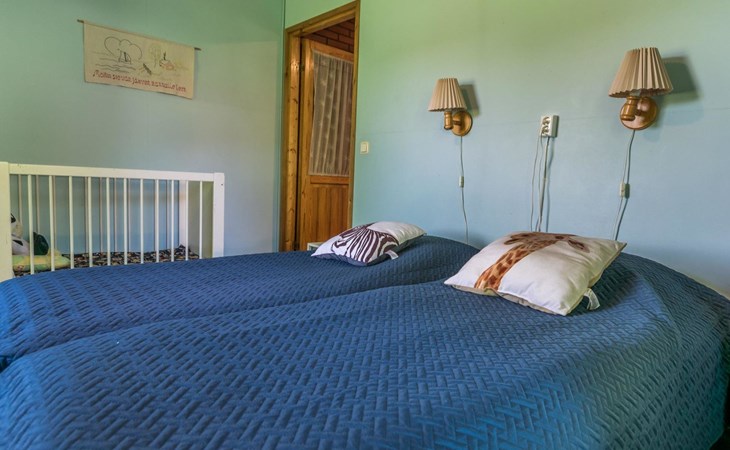The wooden cabin, built in 1995. The ground floor features a living room with a sofa set, dining table, heat-storing fireplace, and TV. A kitchenette includes a stove, refrigerator and freezer, dishwasher, microwave, coffee maker, and kettle. Two bedrooms — one with two beds plus an extendable children’s bed and a crib, and the other with two beds. Separate WC, sauna with wood-burning stove, shower, and dressing room.