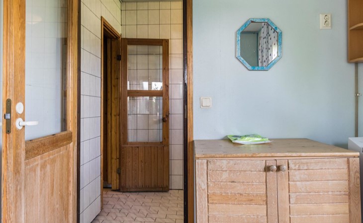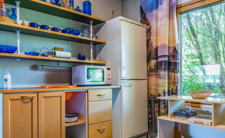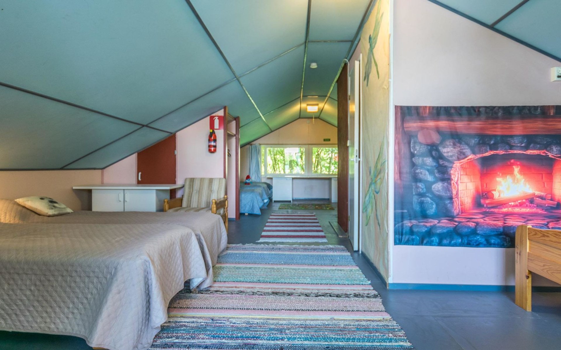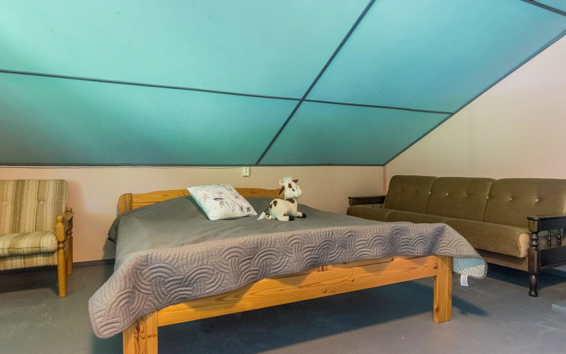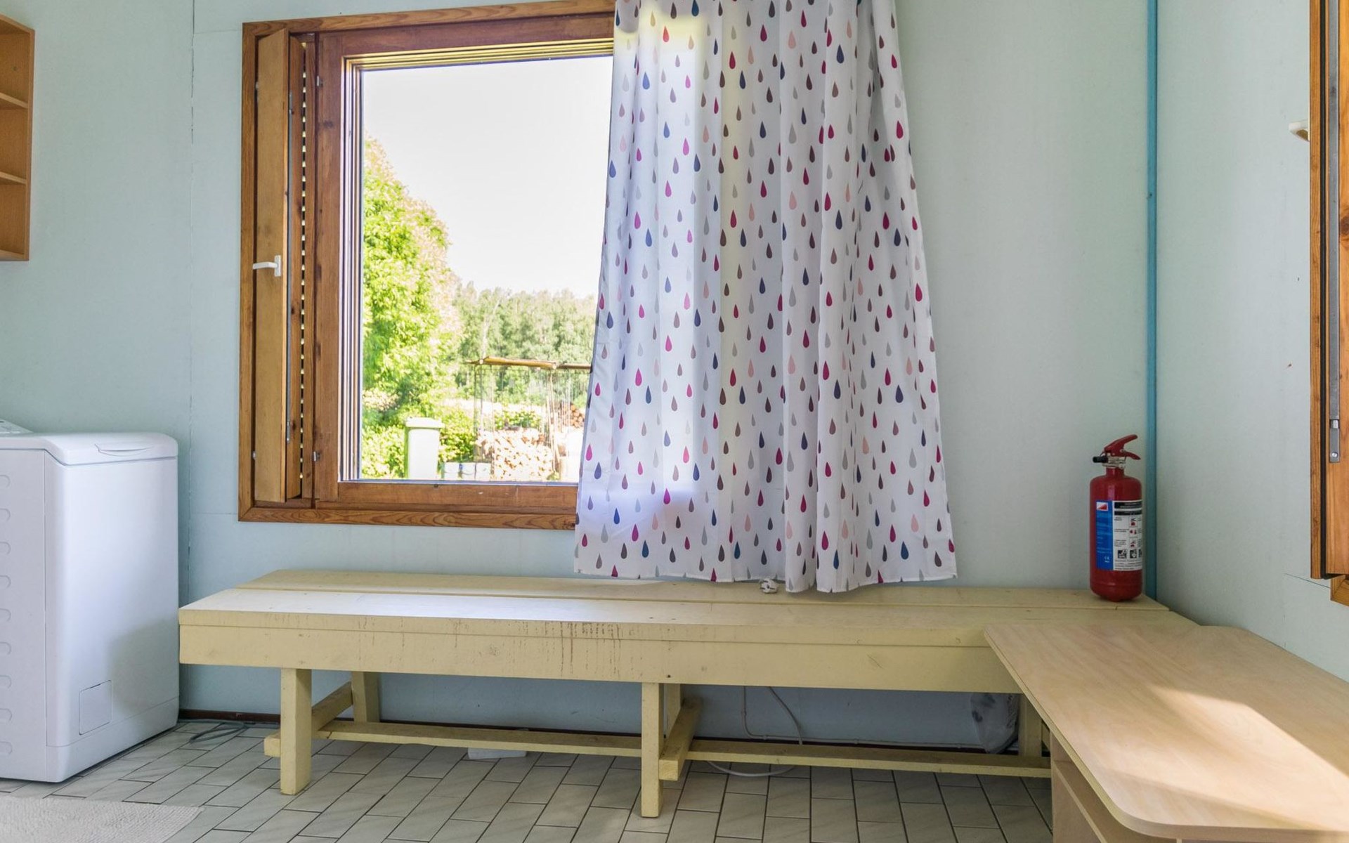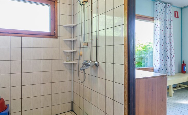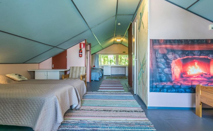 The wooden cabin, built in 1995. The ground floor features a living room with a sofa set, dining table, heat-storing fireplace, and TV. A kitchenette includes a stove, refrigerator and freezer, dishwasher, microwave, coffee maker, and kettle. Two bedrooms — one with two beds plus an extendable children’s bed and a crib, and the other with two beds. Separate WC, sauna with wood-burning stove, shower, and dressing room.