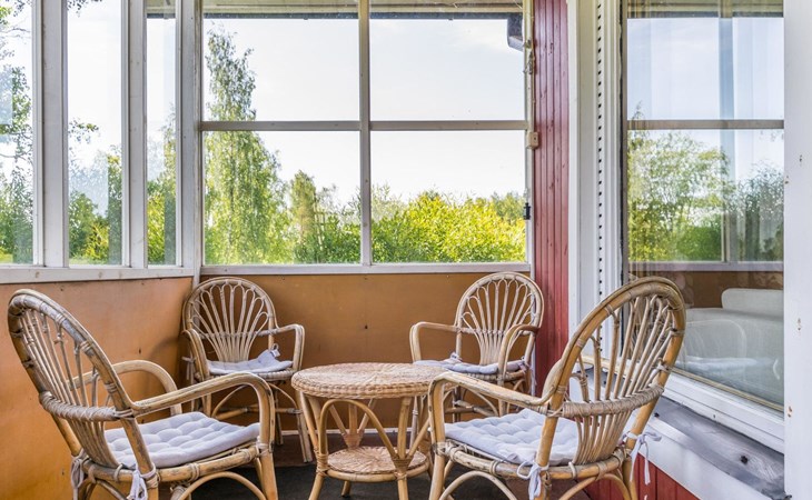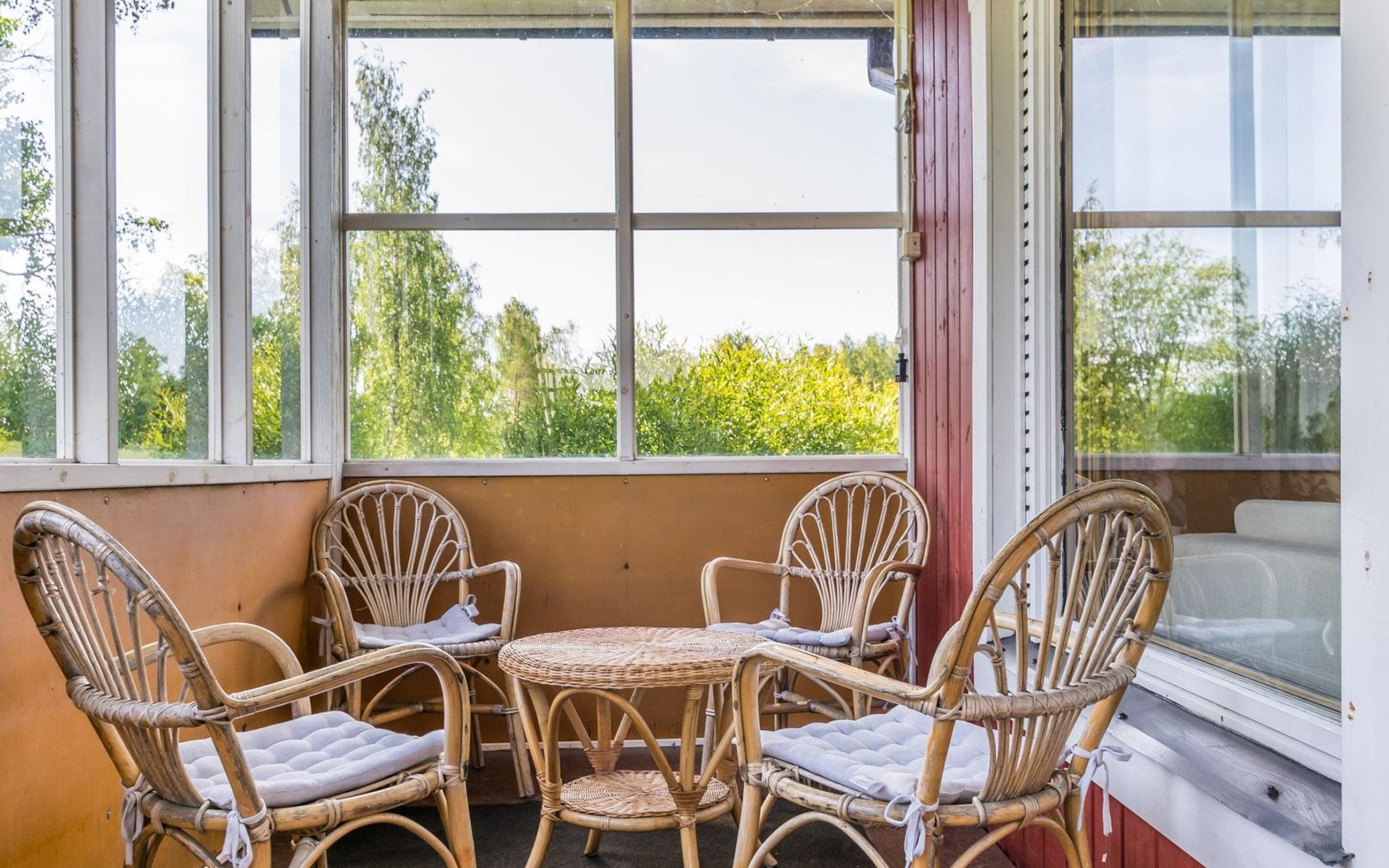 The upper floor (accessed via exterior stairs from the terrace) has two double beds, five single beds, and a separate WC. The terrace is glazed and furnished with garden furniture. A charcoal kettle grill is available — guests bring their own charcoal and lighter fluid.