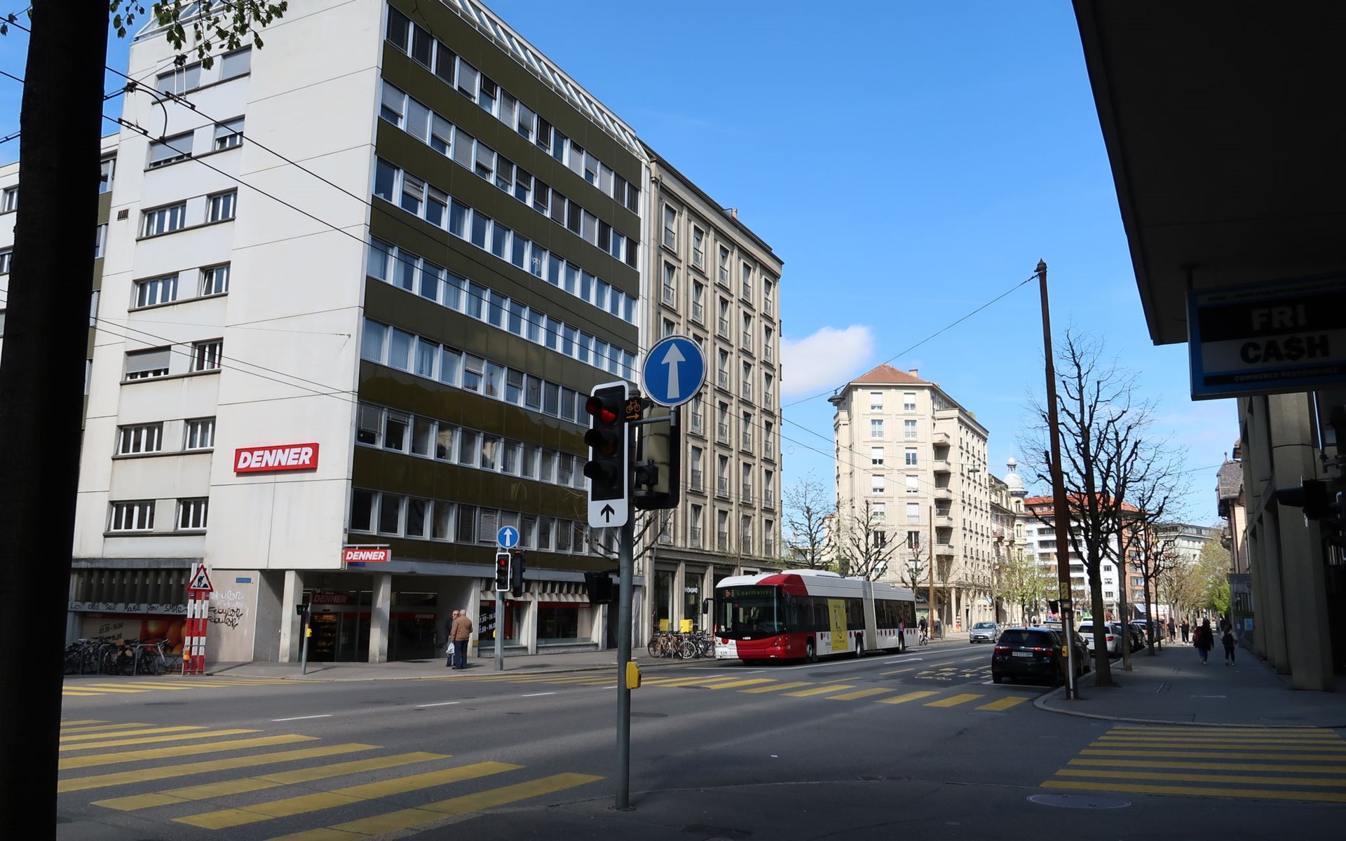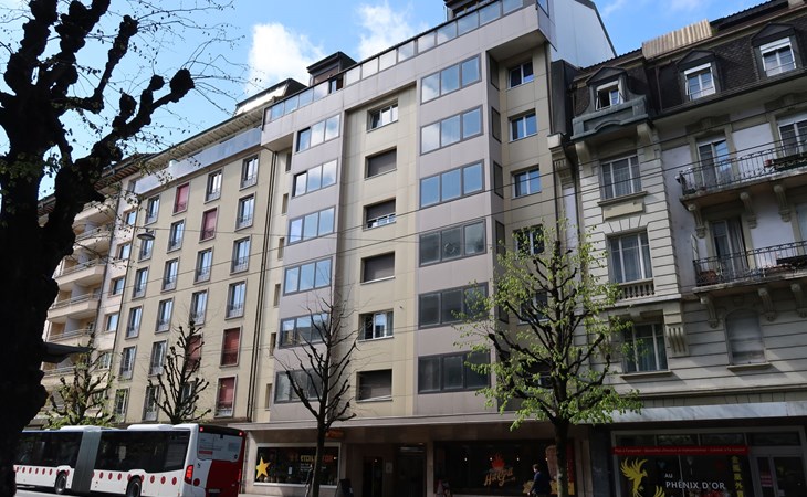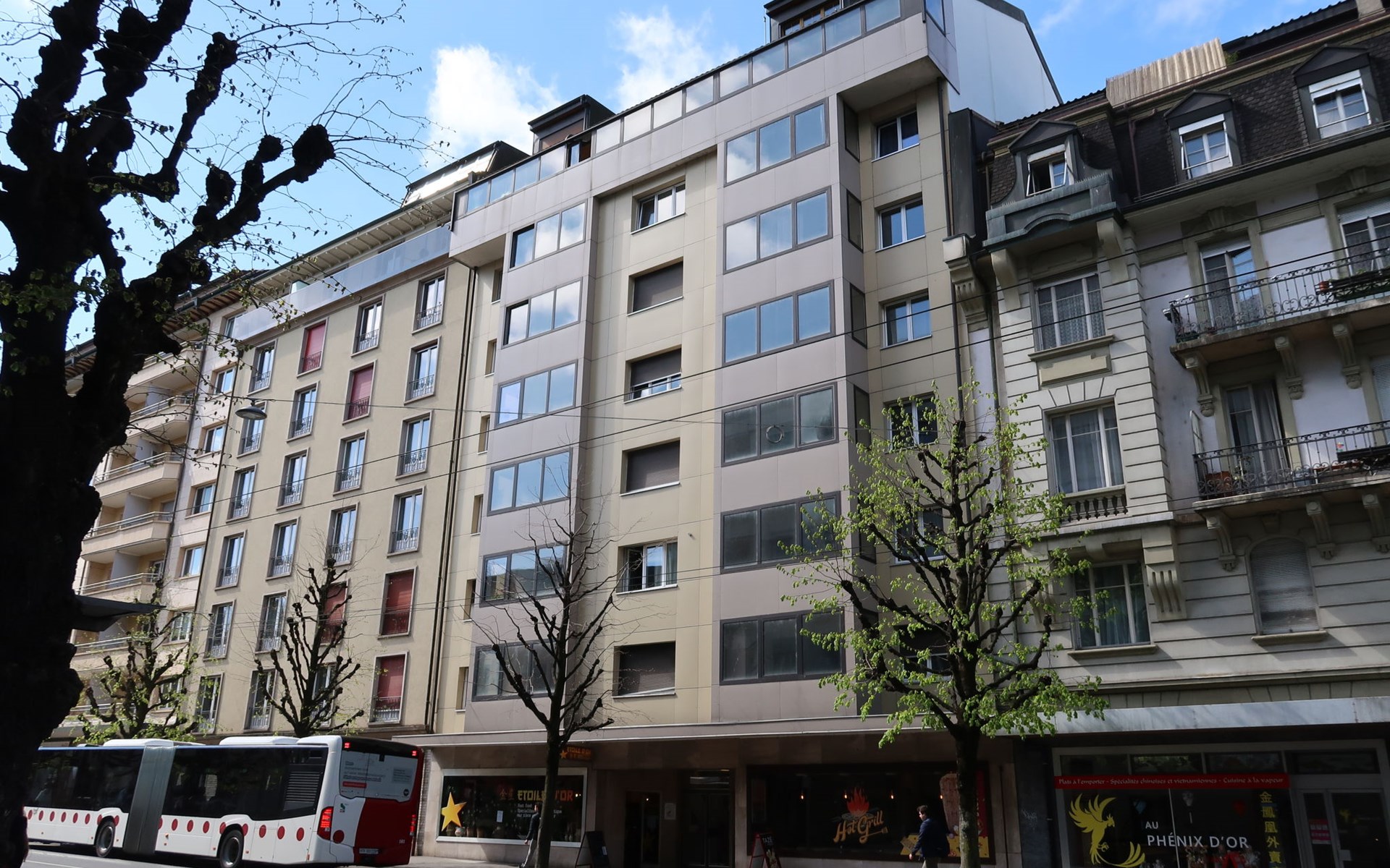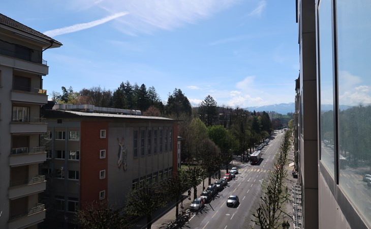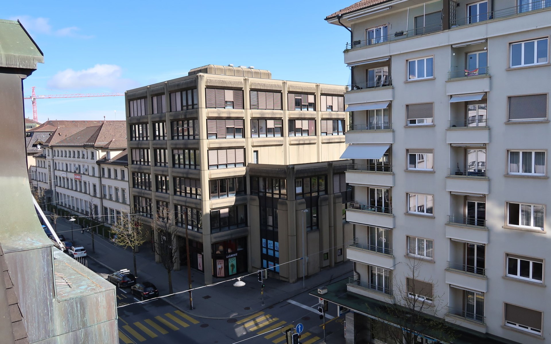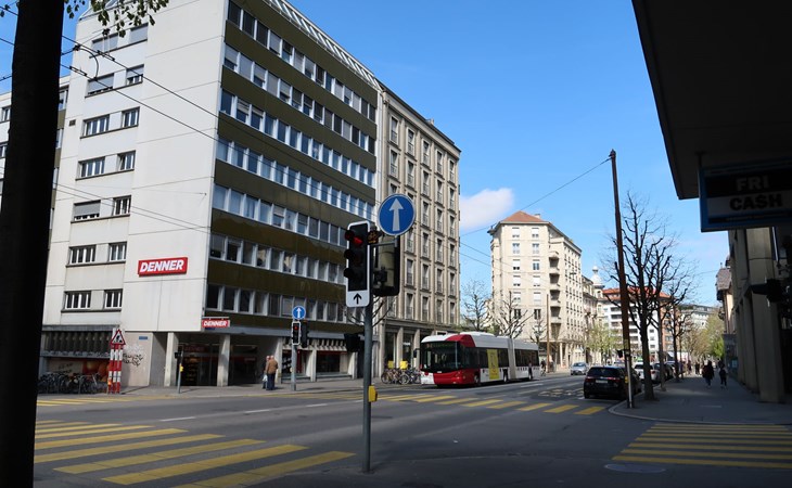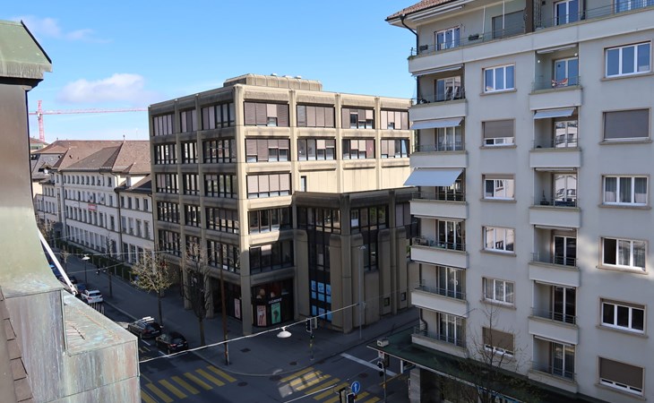 Appartementencomplex "Pérolles", van 7 verdiepingen. In de plaats, centrale ligging. In het huis: centrale verwarming. Openbare parkeerplaatsen in de straat extra.