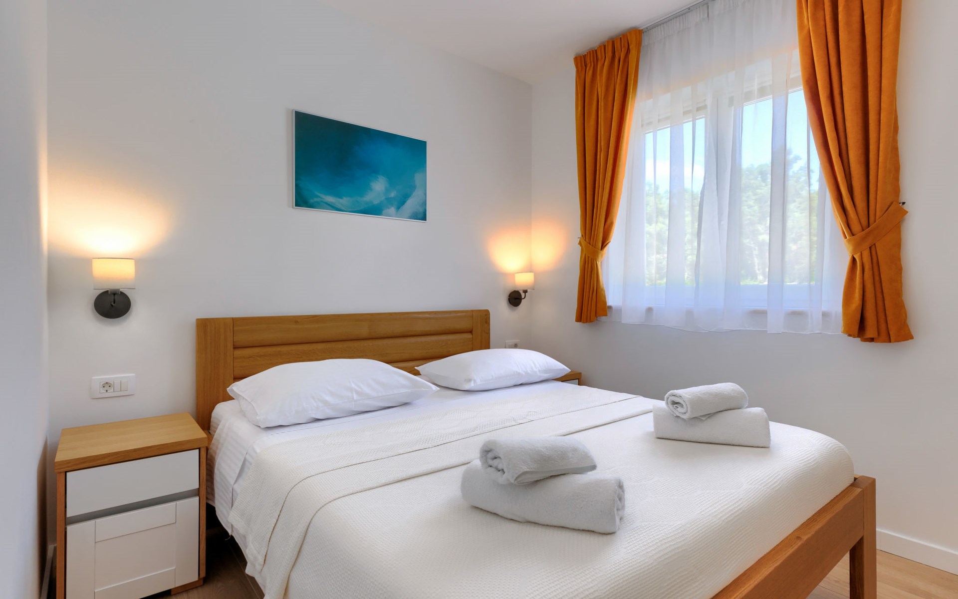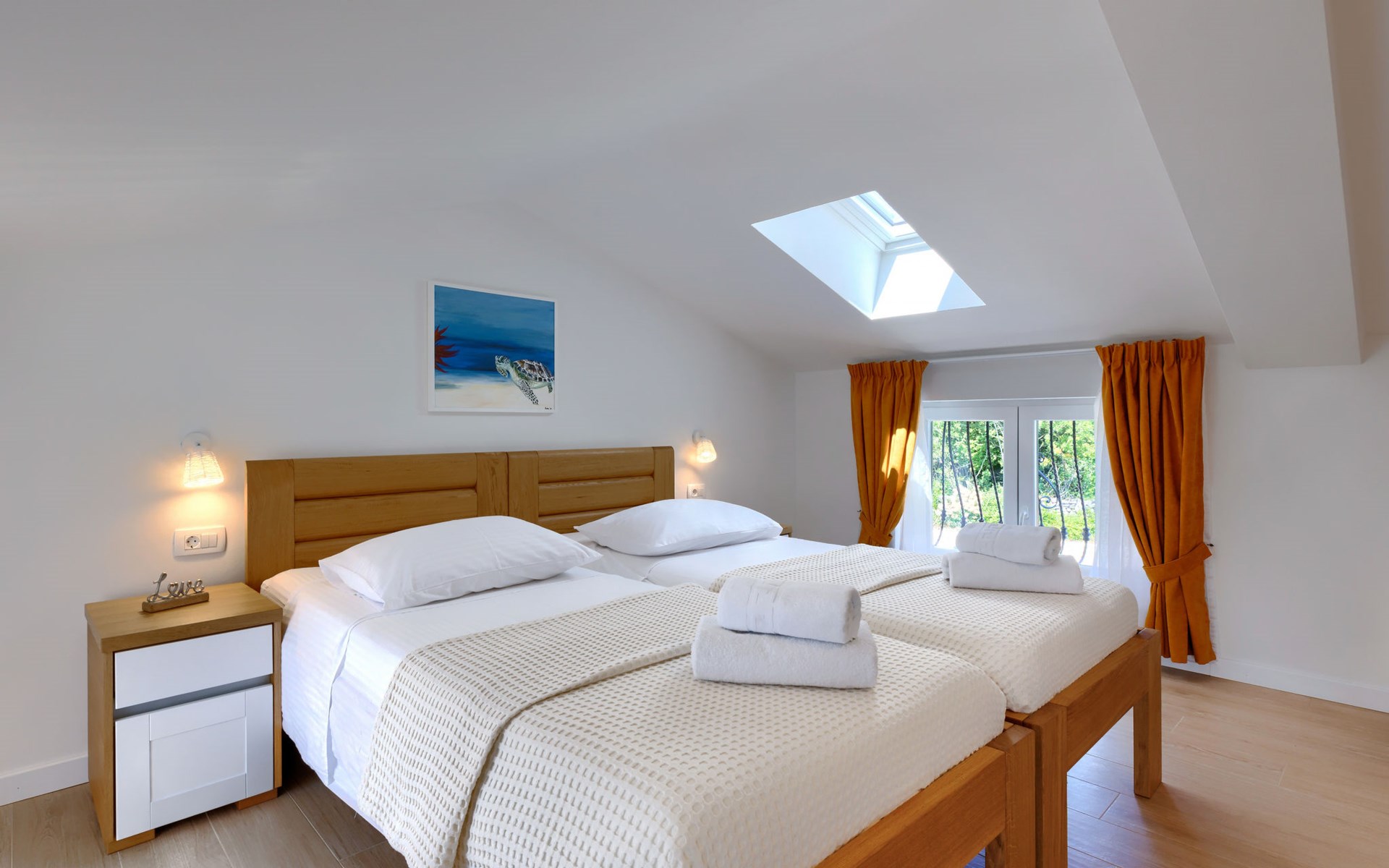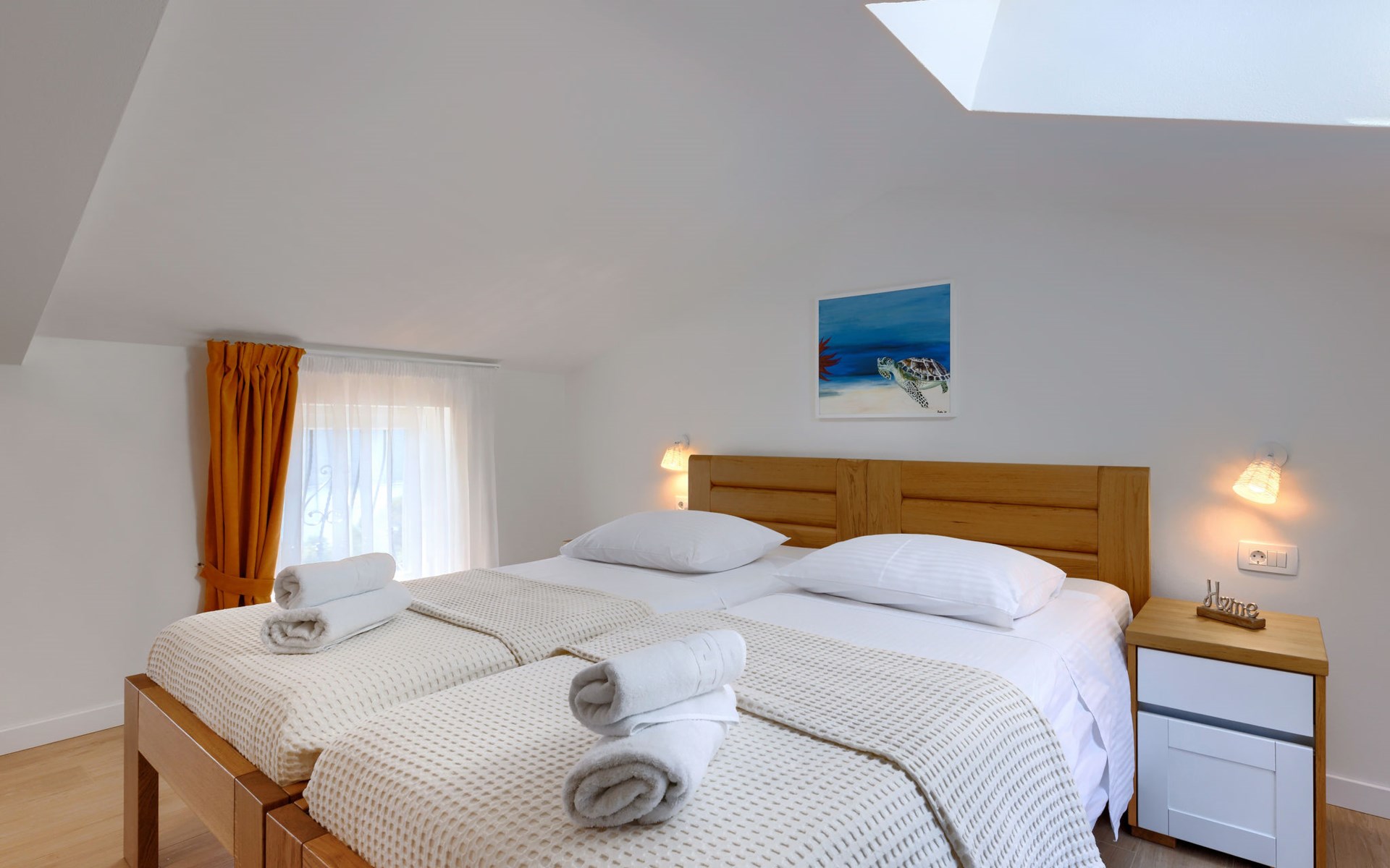 Mooi eengezinswoning "Villa Camellia", van 3 verdiepingen. 1.1 km van het centrum van Trget, buiten de plaats, rustige, zonnige, verhoogde ligging, 900 m van zee, 900 m van het strand. Voor alleengebruik: terrein 700 m2 (omheind), openluchtzwembad hoekig (8 x 4 m, 150 cm diepte, seizoensgebonden beschikbaarheid: 05.Apr. - 12.Okt.) met trap. Buitendouche, terras (13 m2), barbecue, onderhoud zwembad door de eigenaar/tuinman. In het huis: internetaansluiting, wasmachine. Parkeerplaats bij het huis op het terrein. Winkel 1.1 km, supermarkt 10 km, restaurant 600 m, bushalte 6.6 km, kiezelstrand 900 m. De eigenaar accepteert geen jeugdgroepen. Vliegveld 55 km van het huis.