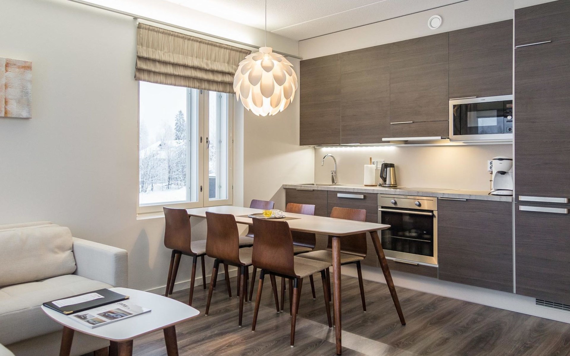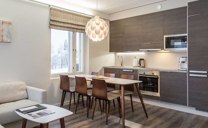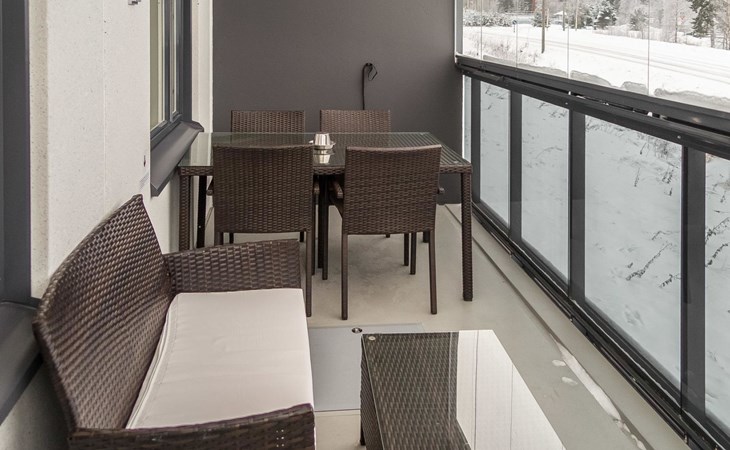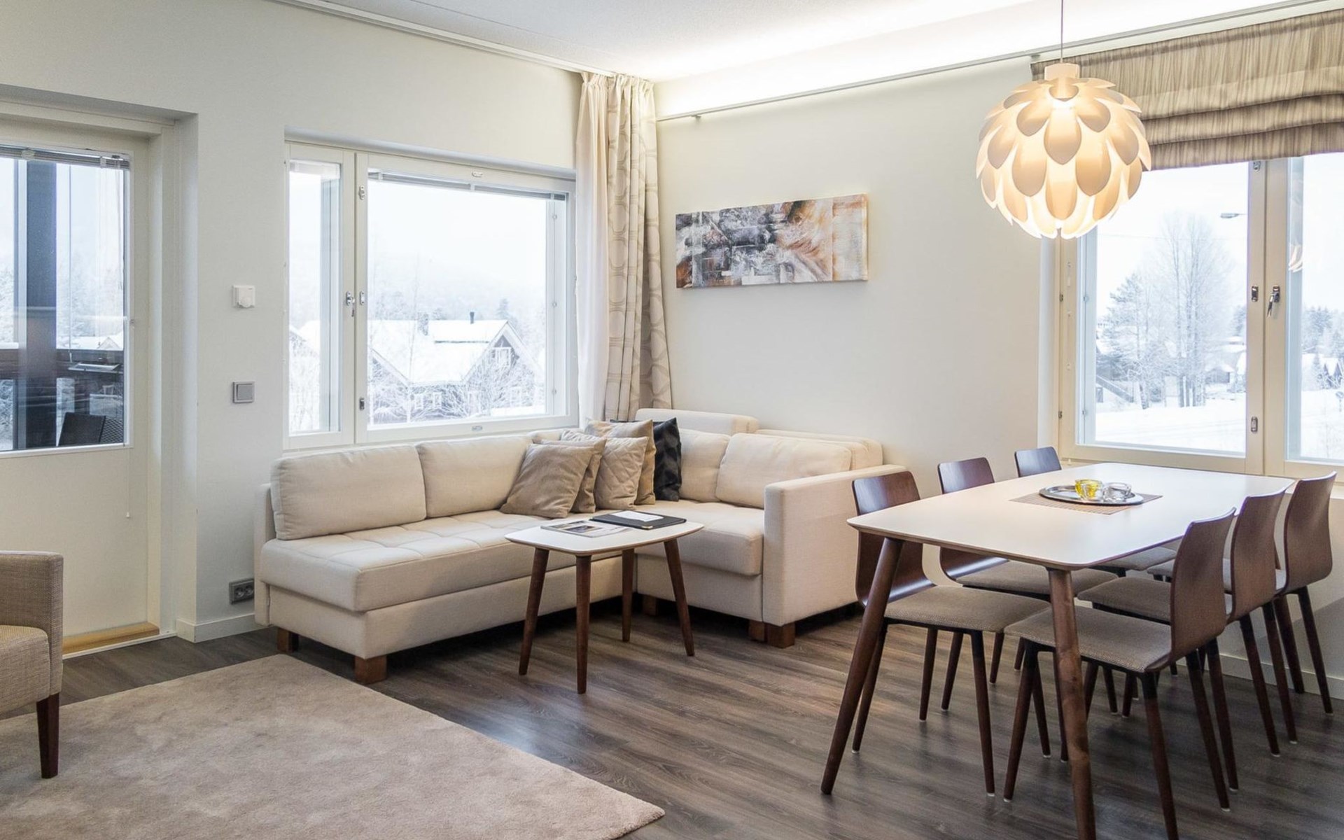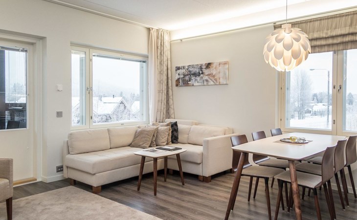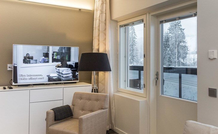 Note! Normal price included 4 persons accommodation. If persons rate are 5-6 extra beds must be booked at an additional cost from 15.8.2024. Tahko Spa Red apartment hotel offers a total of 23 apartments. View to the slopes from living room and from balcony.