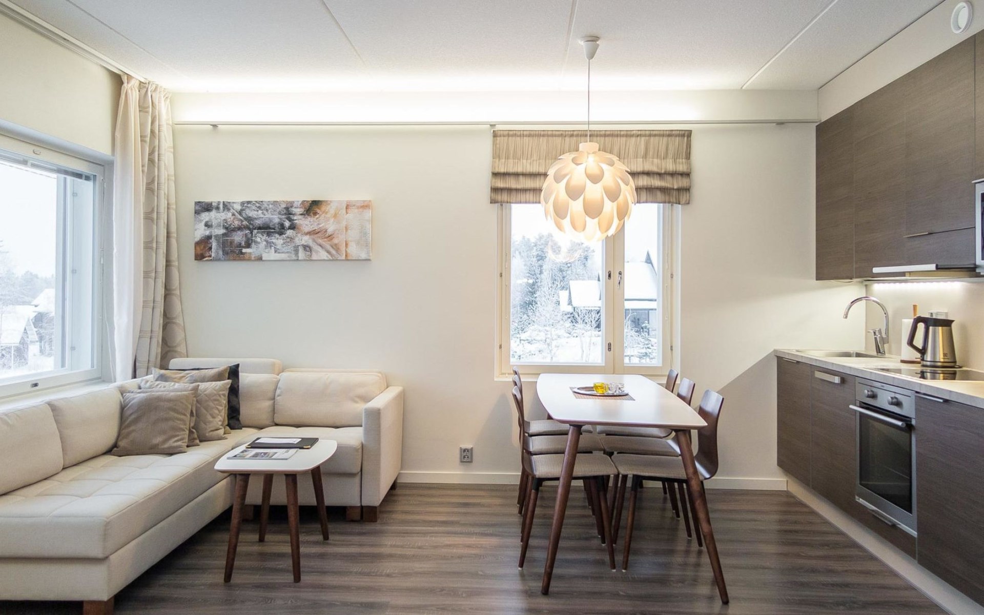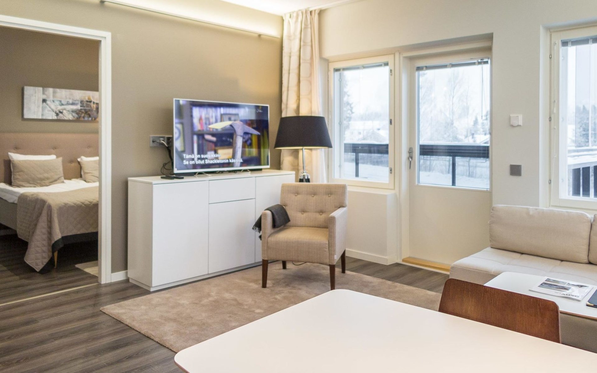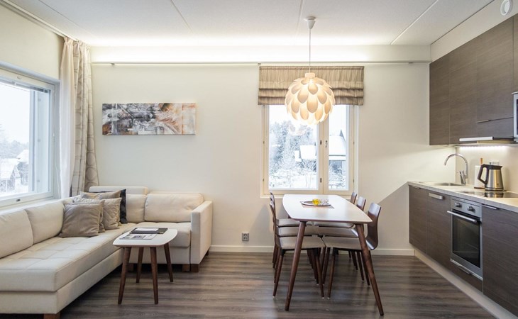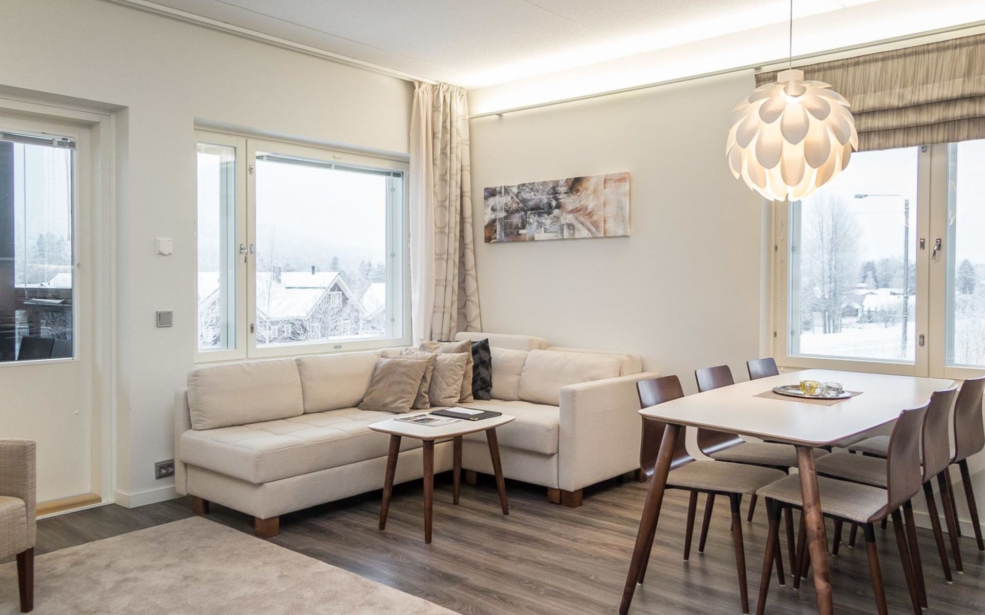 Note! Normal price included 4 persons accommodation. If persons rate are 5-6 extra beds must be booked at an additional cost from 15.8.2024. Tahko Spa Red apartment hotel offers a total of 23 apartments. View to the slopes from living room and from balcony.