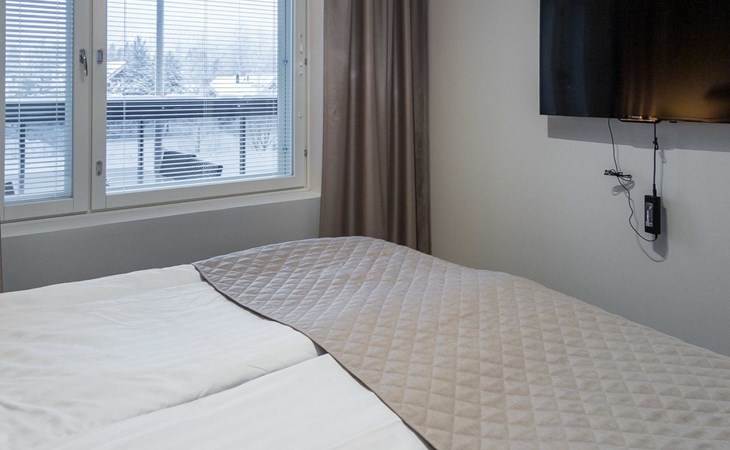 High standard apartment situated in the heart of Tahko center, kitchen-living room sofa bed 2 extra beds, bedroom with double bed, bedroom with 2 beds, shower room, WC, sauna (electric stove), glazed balcony. 2 TVs, one in the living room and another in the bigger bedroom. Air-conditioning and wireless Internet. In smaller bedroom there might not be window.