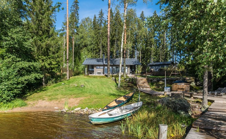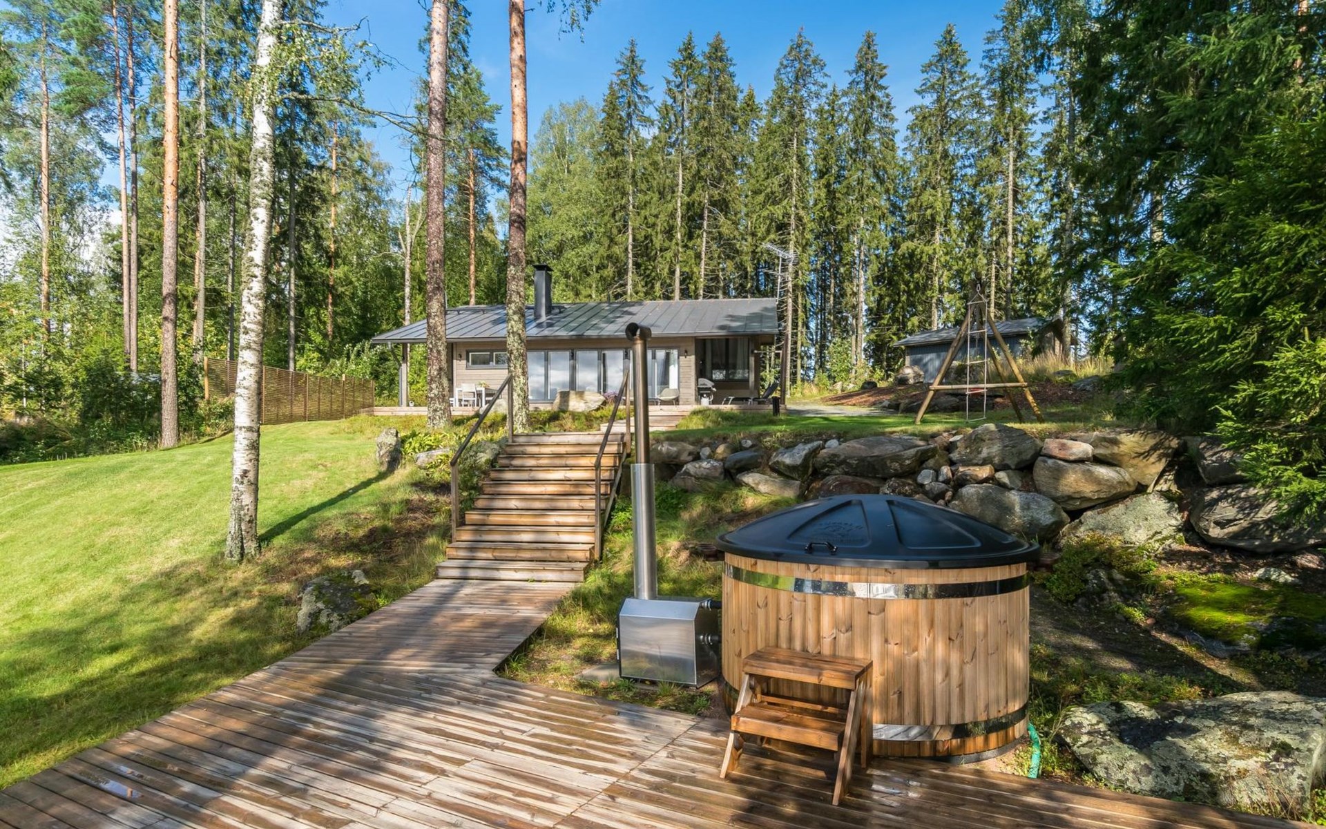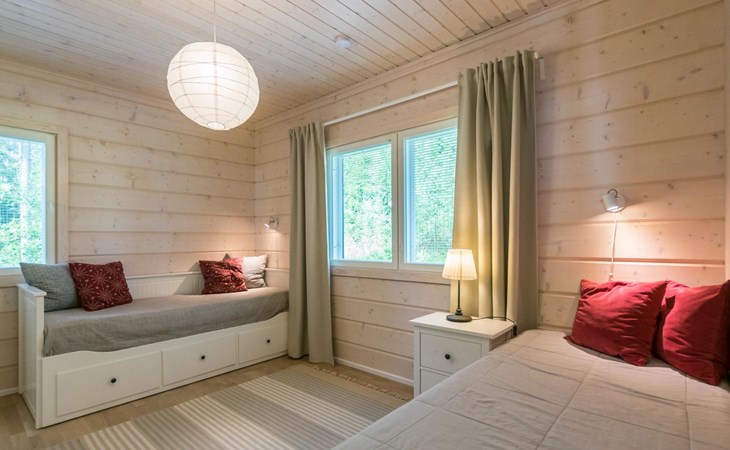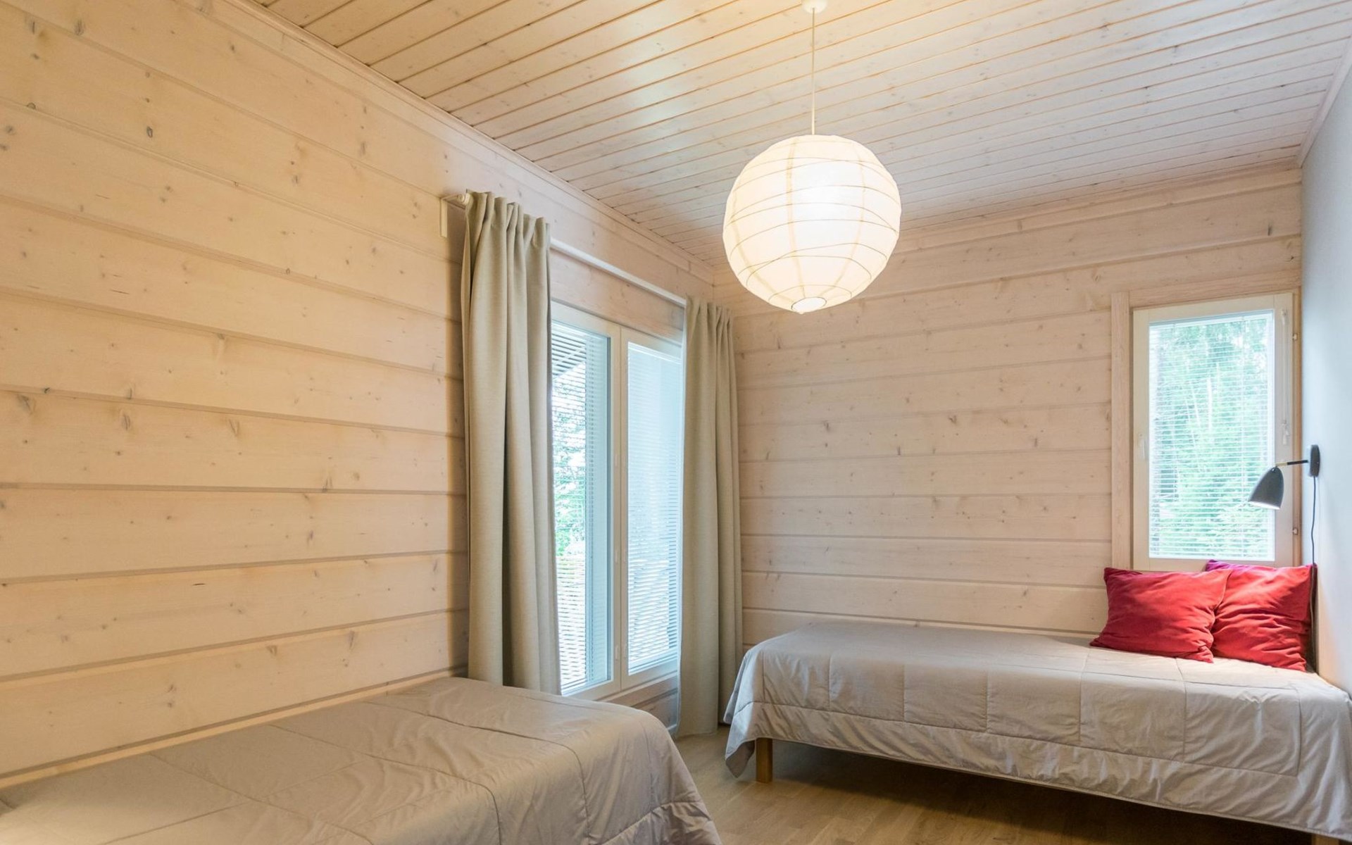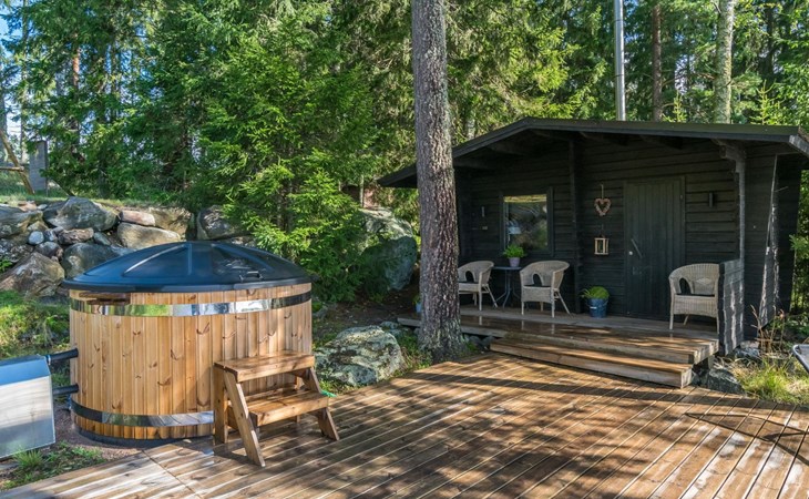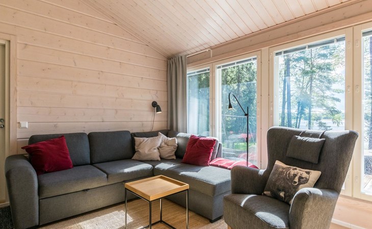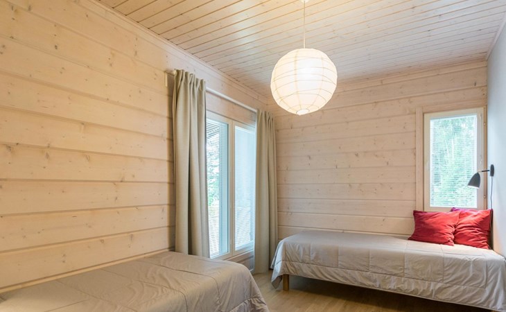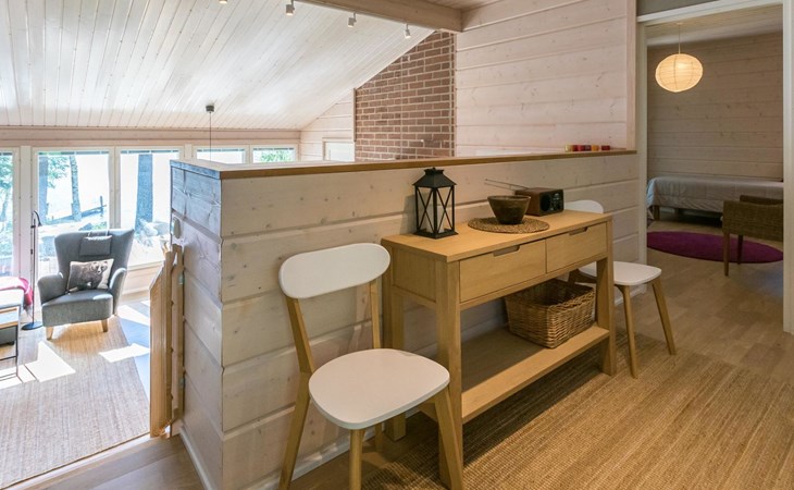 Wooden villa 2016, large kitchen-living room (sofa bed), bedroom 2 beds, bedroom 2 beds, bedroom with one bed and sofa bed. Washroom (2 showers), sauna with views of the lake (wood stove), separate toilet. Extensive partly covered terrace spaces.