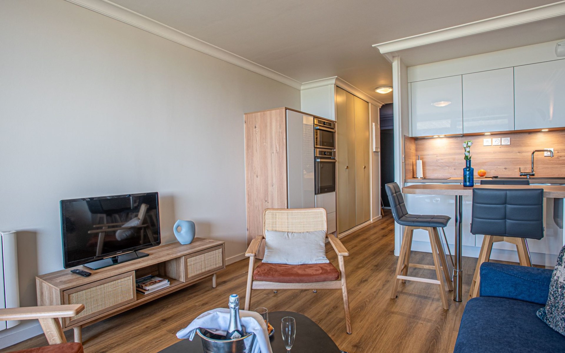 Residentie "Le Britannia", van 5 verdiepingen. In het centrum van Carnac Plage, van zee, 20 m van het strand. Voor alleengebruik: terras, tuinmeubelen. In het complex: bergruimte voor fietsen. Winkel 150 m, supermarkt 900 m, bakkerij 150 m, centrum te voet bereikbaar in 5 minuten, zandstrand "Grande Plage de Carnac Plage", overdekt zwembad, thermaalbad "Thalassothérapie de Carnac" 800 m. Golfterrein (18 holes) 15 km, surfschool 8 km, zeilschool 1.5 km. Attracties in de buurt: Les Alignements de Carnac 3 km, La Trinité sur Mer 4 km, Presqu'île de Quiberon 15 km, Auray 15 km, Vannes 35 km, Lorient 55 km. Wandelgebied Le Golfe du Morbihan.
