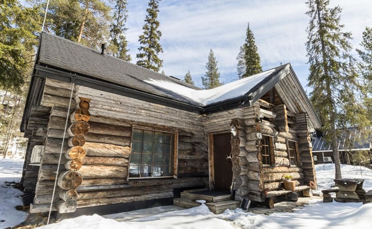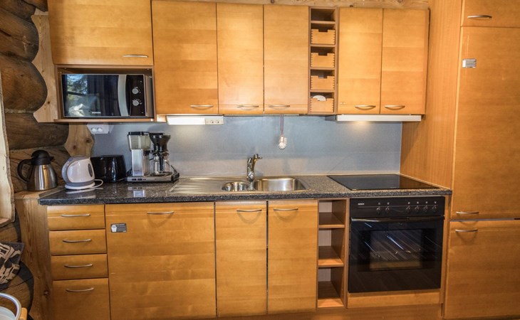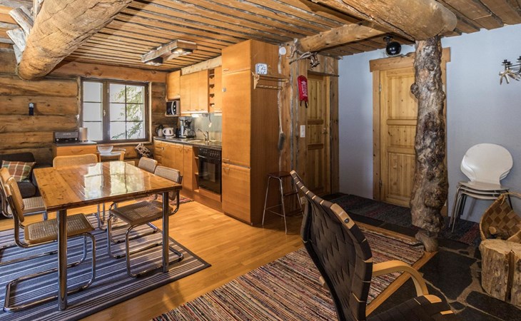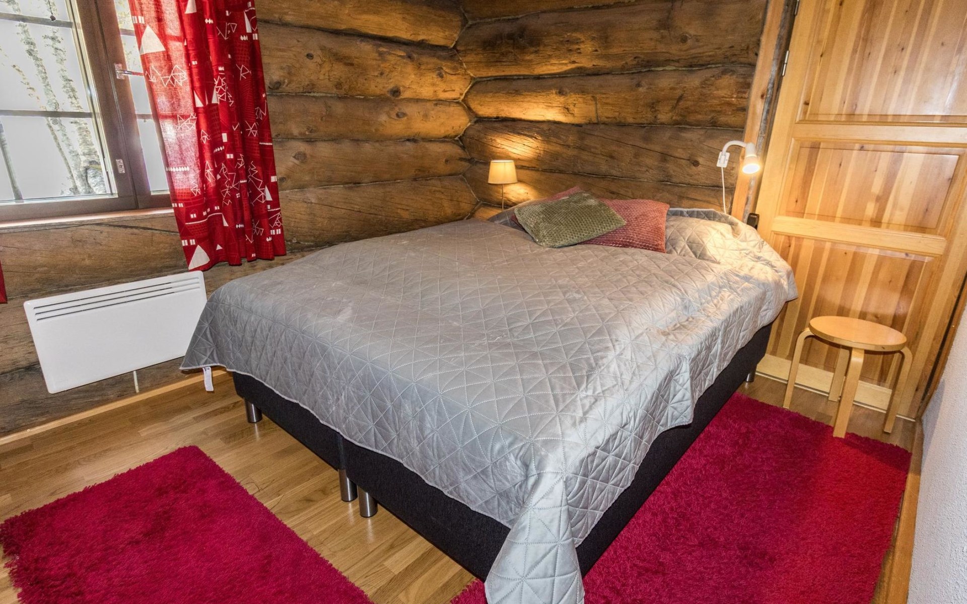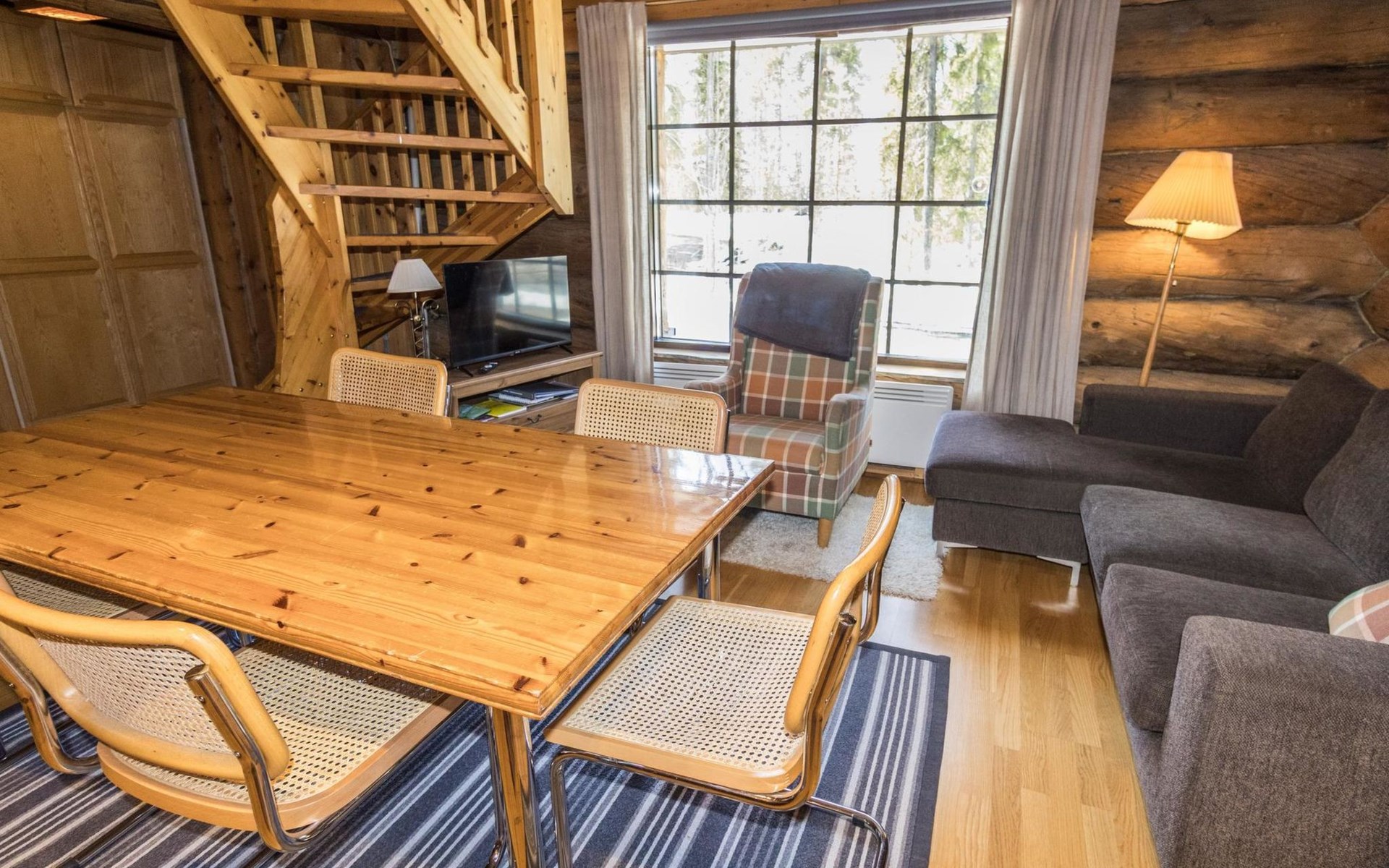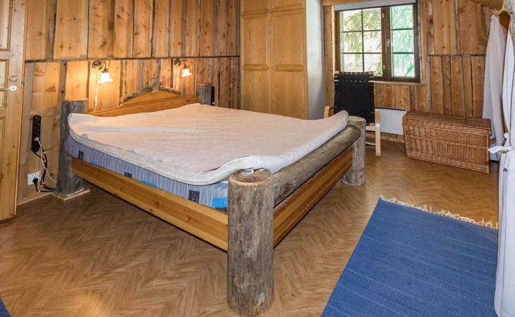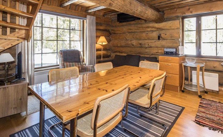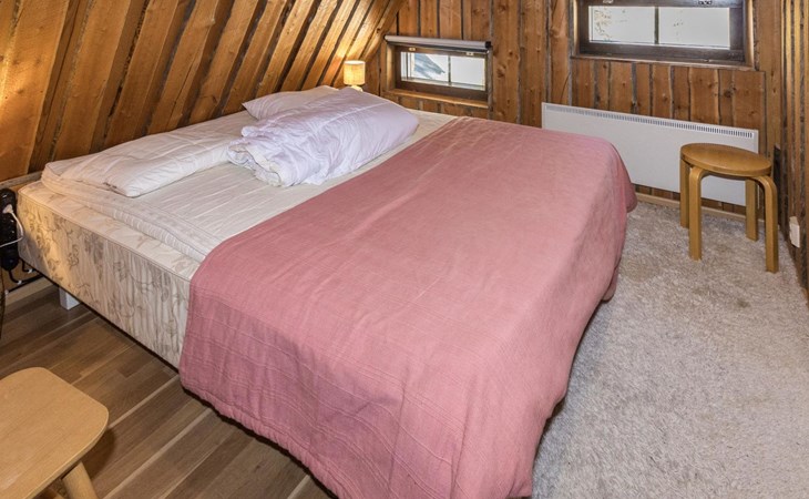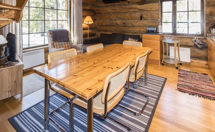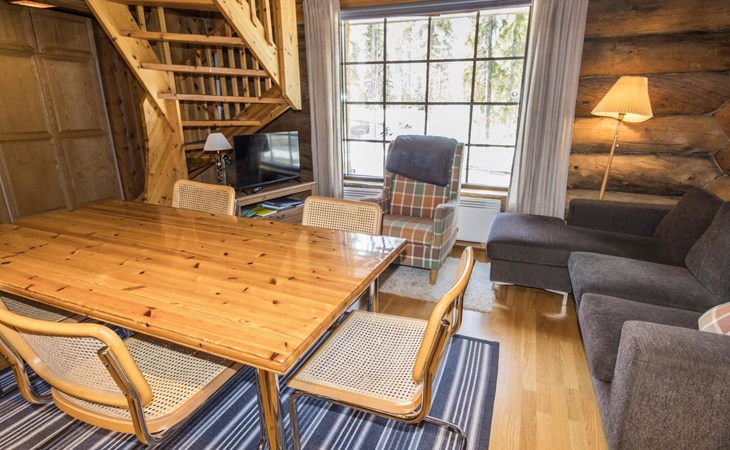 One half (apartment) of semi-detached silverlog house unit 1991, living room/kitchen convertible sofa/bed, bedroom double bed, upstairs 2 bedrooms with double bed in each, 2 alcoves to bedroom, both with mattresses, sauna, washroom, WC also upstairs, balcony. 2 mattresses provided as extra beds.
