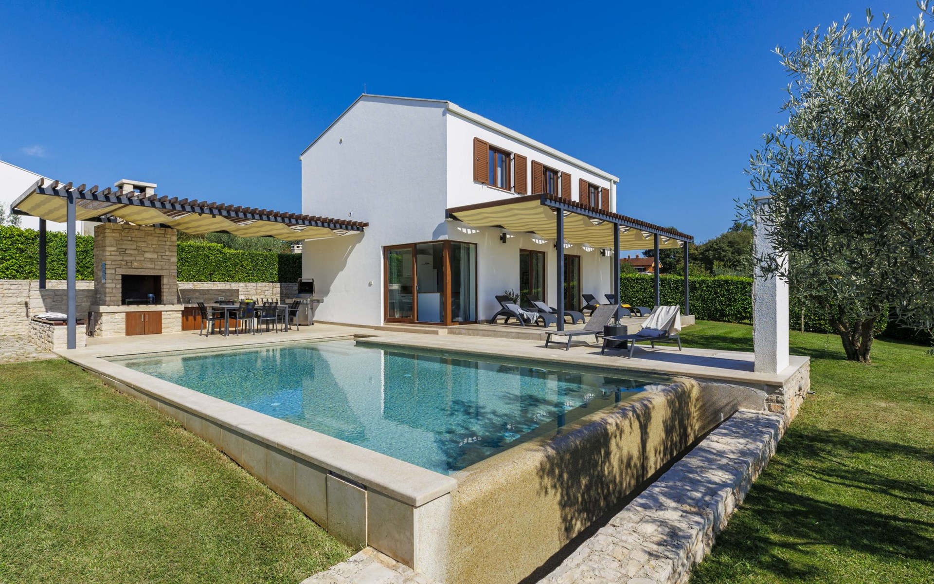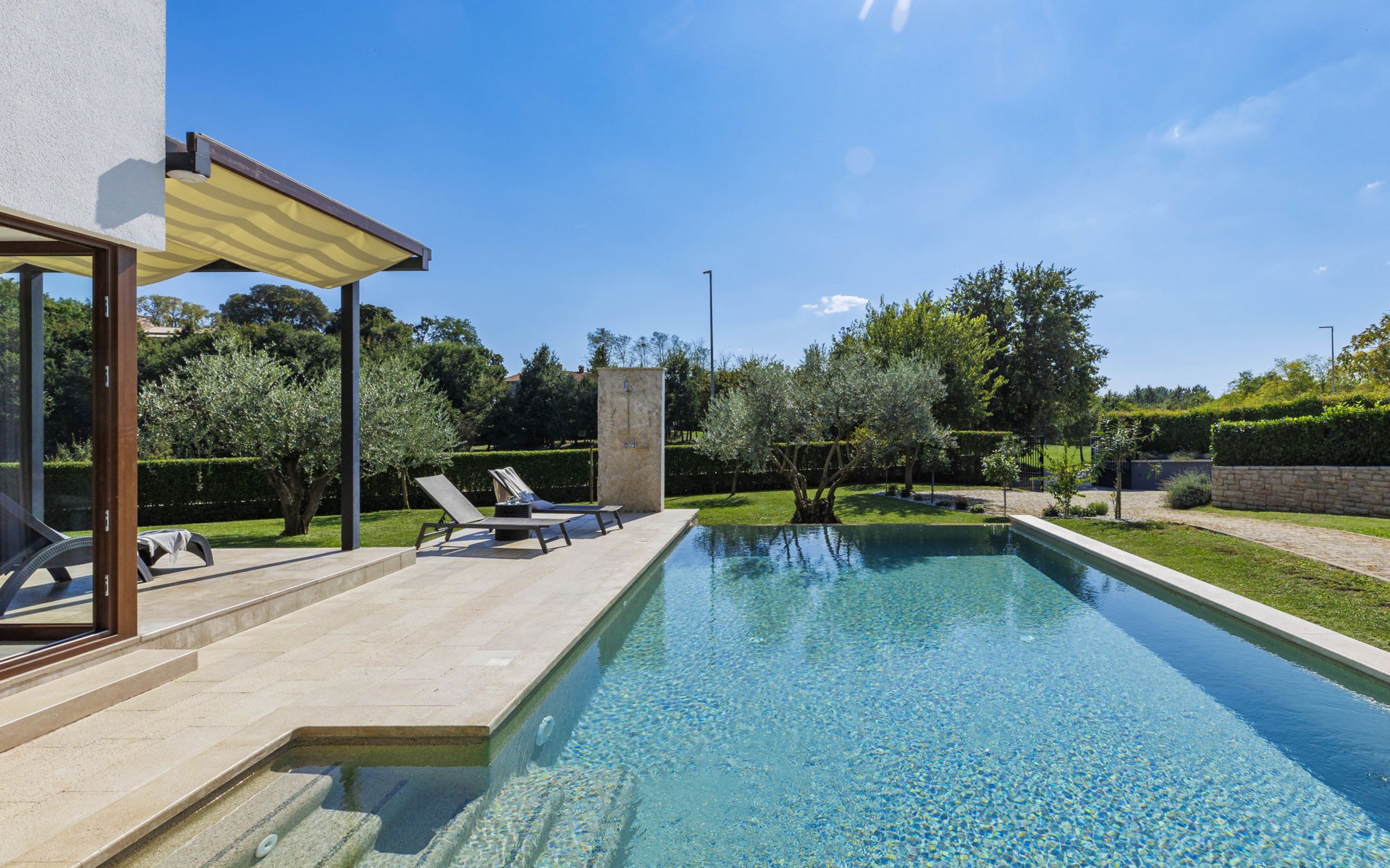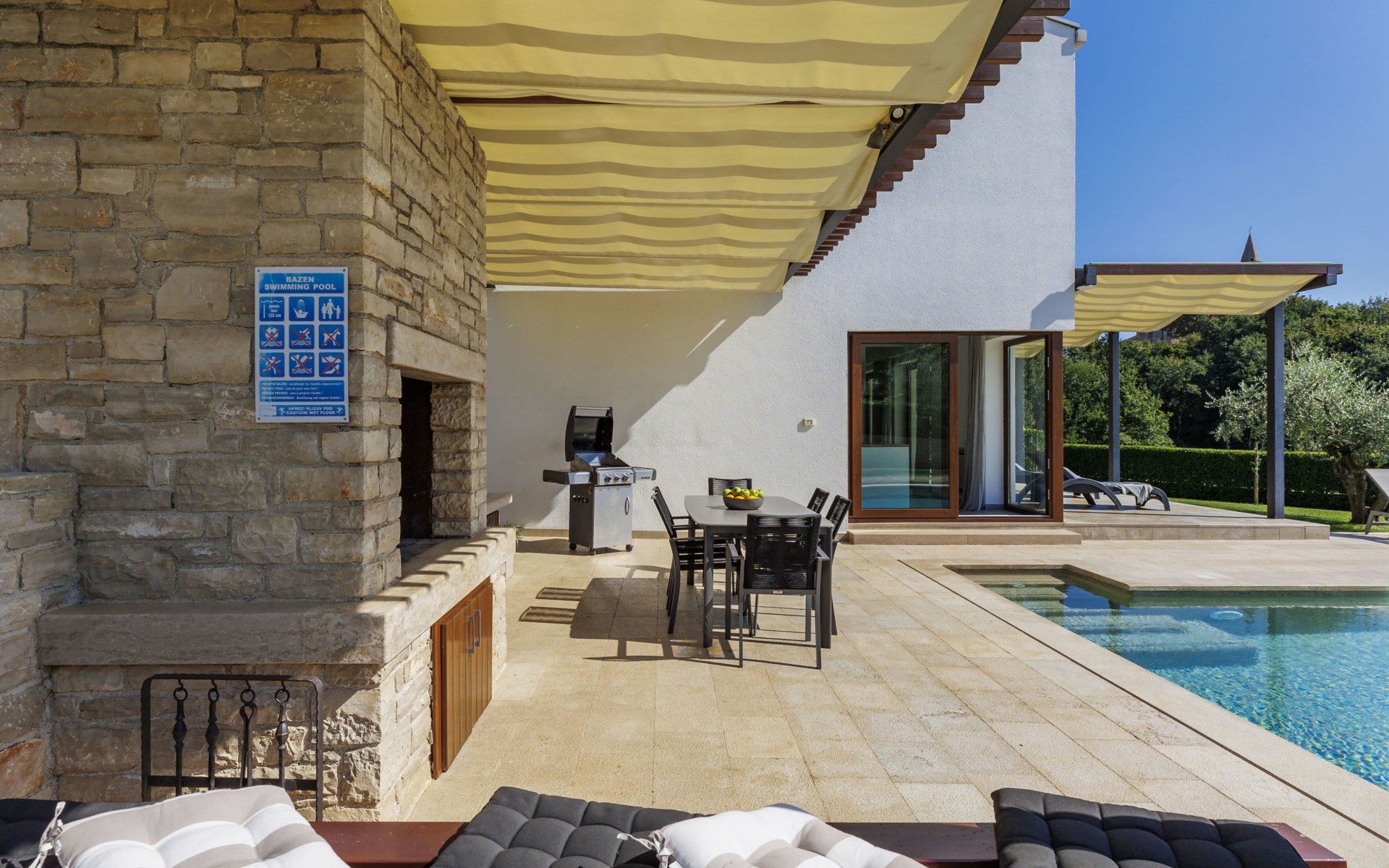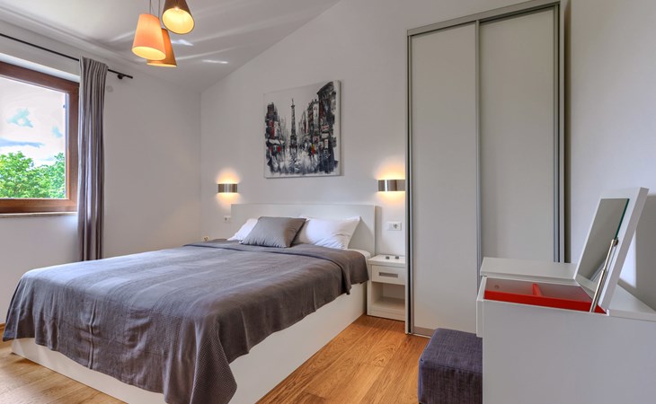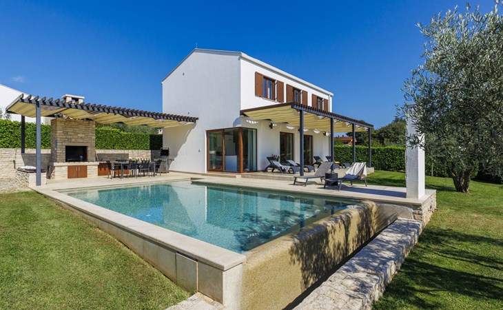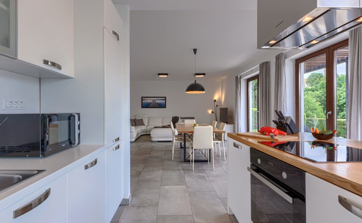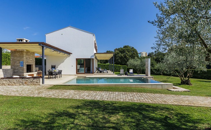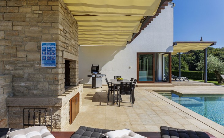 Moderne villa "Luna Nera", van 2 verdiepingen. 6 km van het centrum van Žminj, 13 km van het centrum van Pazin, rustige, zonnige ligging, 27 km van zee. Voor alleengebruik: terrein 1.000 m2, mooie, verzorgde tuin met gazon en planten, openluchtzwembad hoekig (10 x 5 m, 140 cm diepte, seizoensgebonden beschikbaarheid: 01.Jan. - 31.Dec.) met trap. Buitendouche, prieel (30 m2), tuinmeubelen, barbecue. In het huis: internetaansluiting, wasmachine, droger. Parkeerplaats bij het huis op het terrein. Winkel 600 m, supermarkt 6 km, restaurant 1 km, café 400 m, bushalte 6.6 km, treinstation 500 m, kiezelstrand 27 km. Manege 7 km, wandelroutes 1 km vanaf het huis, fietspad 1 km. Groepen jongeren uitsluitend op aanvraag.