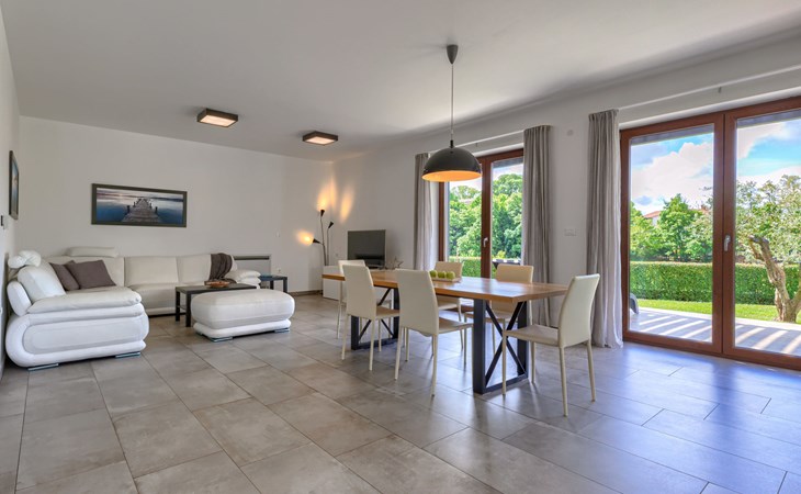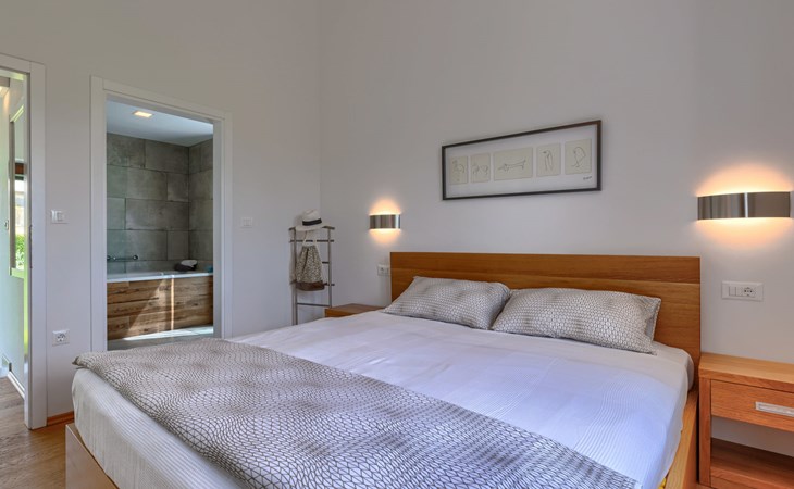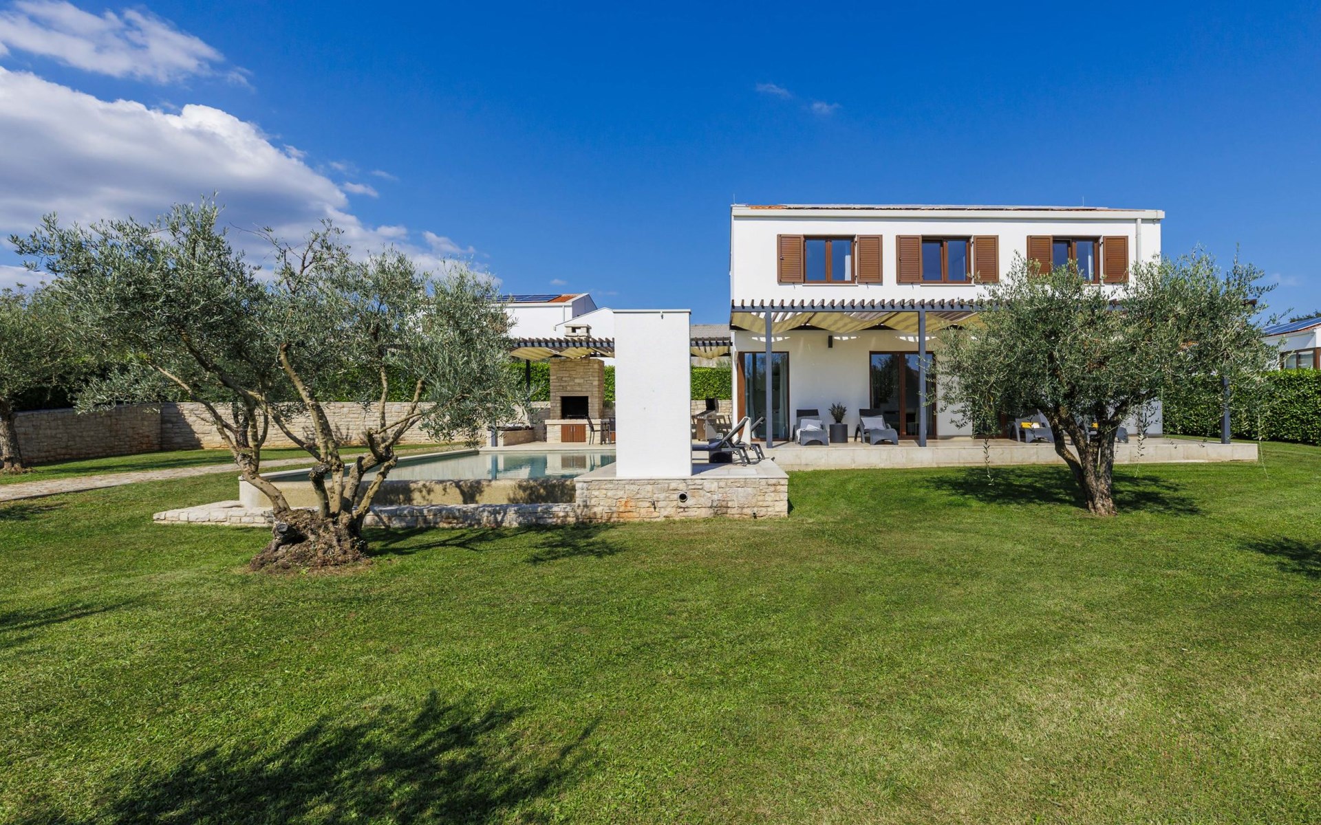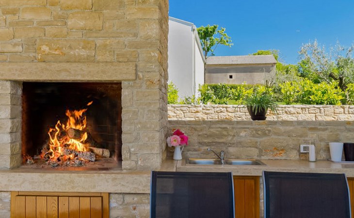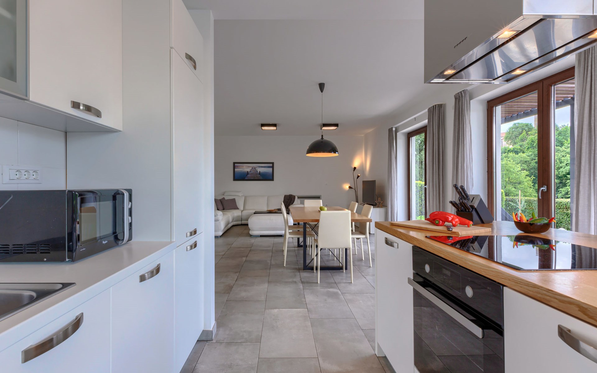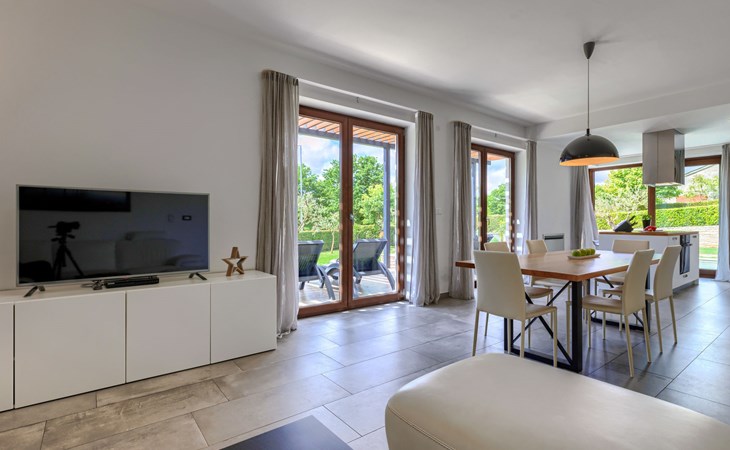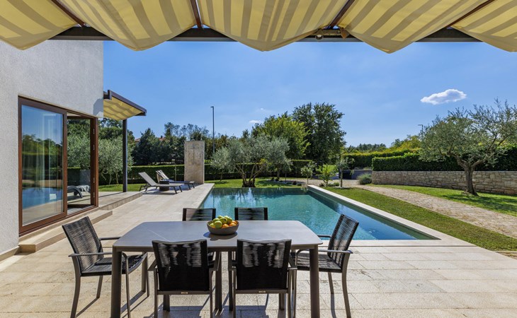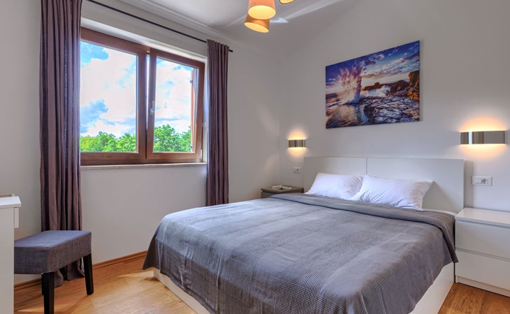 Moderne villa "Luna Nera", van 2 verdiepingen. 6 km van het centrum van Žminj, 13 km van het centrum van Pazin, rustige, zonnige ligging, 27 km van zee. Voor alleengebruik: terrein 1.000 m2, mooie, verzorgde tuin met gazon en planten, openluchtzwembad hoekig (10 x 5 m, 140 cm diepte, seizoensgebonden beschikbaarheid: 01.Jan. - 31.Dec.) met trap. Buitendouche, prieel (30 m2), tuinmeubelen, barbecue. In het huis: internetaansluiting, wasmachine, droger. Parkeerplaats bij het huis op het terrein. Winkel 600 m, supermarkt 6 km, restaurant 1 km, café 400 m, bushalte 6.6 km, treinstation 500 m, kiezelstrand 27 km. Manege 7 km, wandelroutes 1 km vanaf het huis, fietspad 1 km. Groepen jongeren uitsluitend op aanvraag.