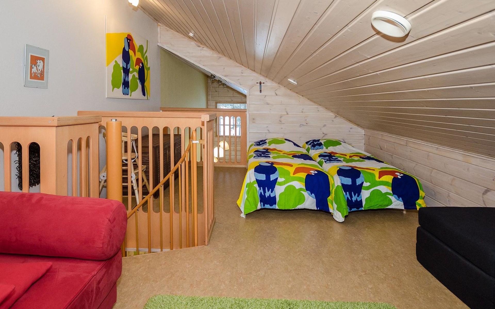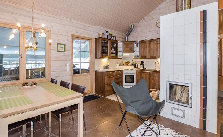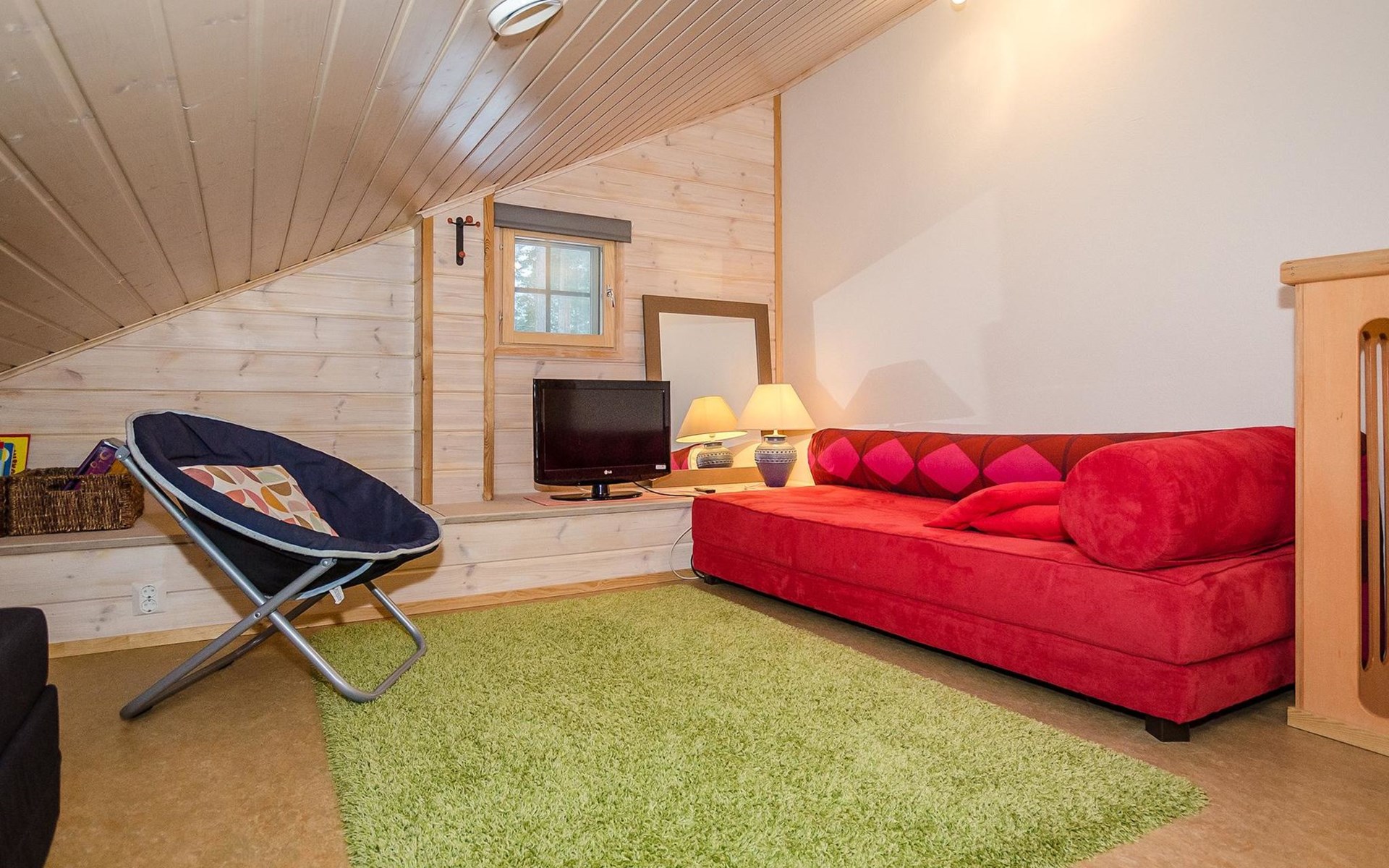 Living room, kitchen, one bedroom with double bed, sleeping gallery with 2 beds and sofa bed for 1-2 persons, washroom, sauna (elec. stove), terrace, carport.