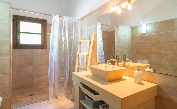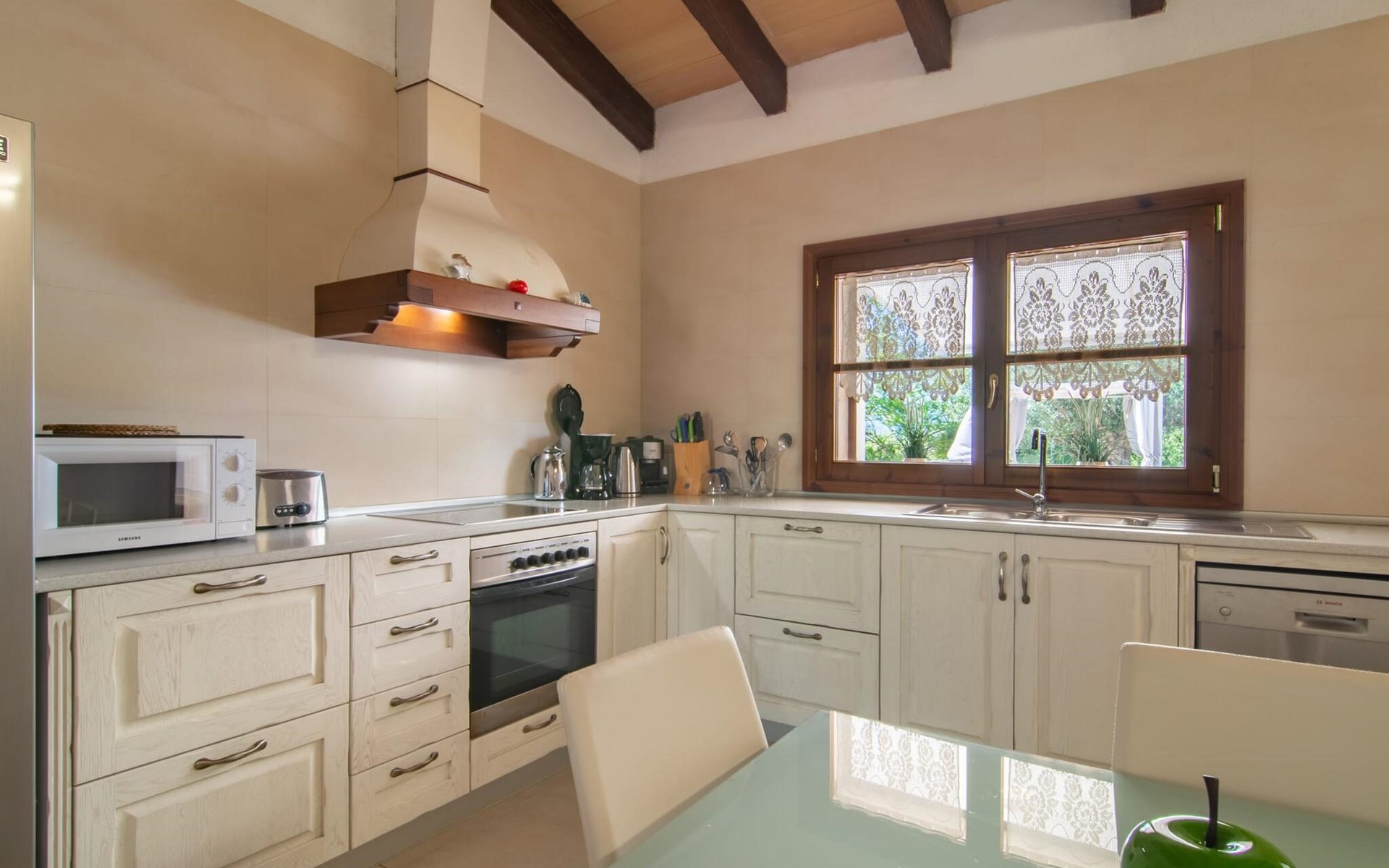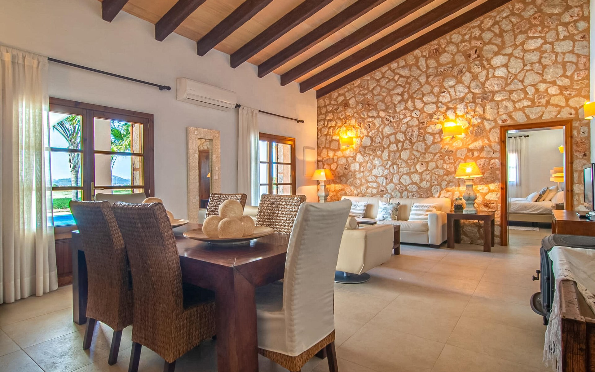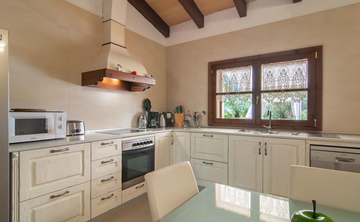 En hetzelfde geldt voor de inrichting: aankomen en je goed voelen is hier het vakantiemotto. Het interieur is consequent ontworpen in een lichte, frisse en klassieke stijl. Witte en crèmekleurige muren worden afgewisseld met rustieke natuurstenen muren, aangevuld met prachtige donkerbruine houten balken aan de plafonds. Een bijzonder hoogtepunt van deze zeer goed onderhouden villa is het feit dat het gelijkvloers is gebouwd. Niemand hoeft hier trappen te lopen, wat een enorme opluchting kan zijn, vooral met kinderen, maar ook voor alle anderen. In de open en ruime eet- en woonruimte kun je ofwel aan de strakke, moderne houten tafel met chique stoelen zitten en samen genieten van een ontspannen maaltijd, ofwel neerstrijken in de elegante leren fauteuils of de bijpassende bank en genieten van een thriller op tv met een glas wijn. Je kunt ook plaatsnemen aan de stijlvolle glazen tafel met de gedeeltelijk doorzichtige stoelen in de keuken, die is uitgerust met hoogwaardige apparatuur en een grote koelkast. En als je moe bent, kun je je gewoon terugtrekken in een van de drie stijlvolle tweepersoonsslaapkamers, waarvan er een een eigen badkamer heeft. De bewoners van de andere twee slaapkamers delen een andere ruime badkamer.