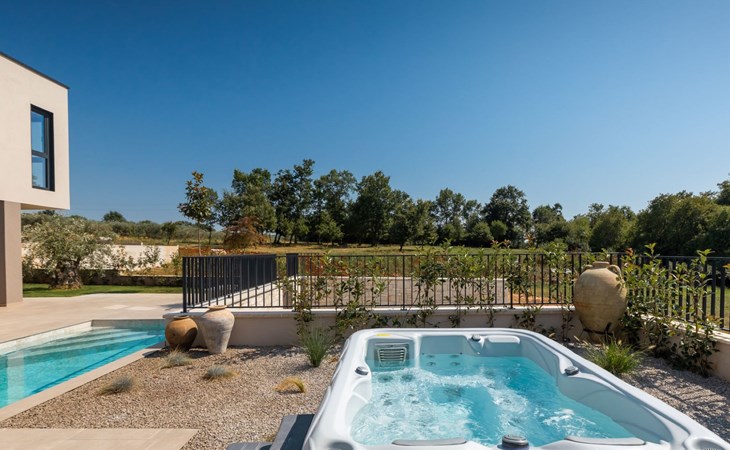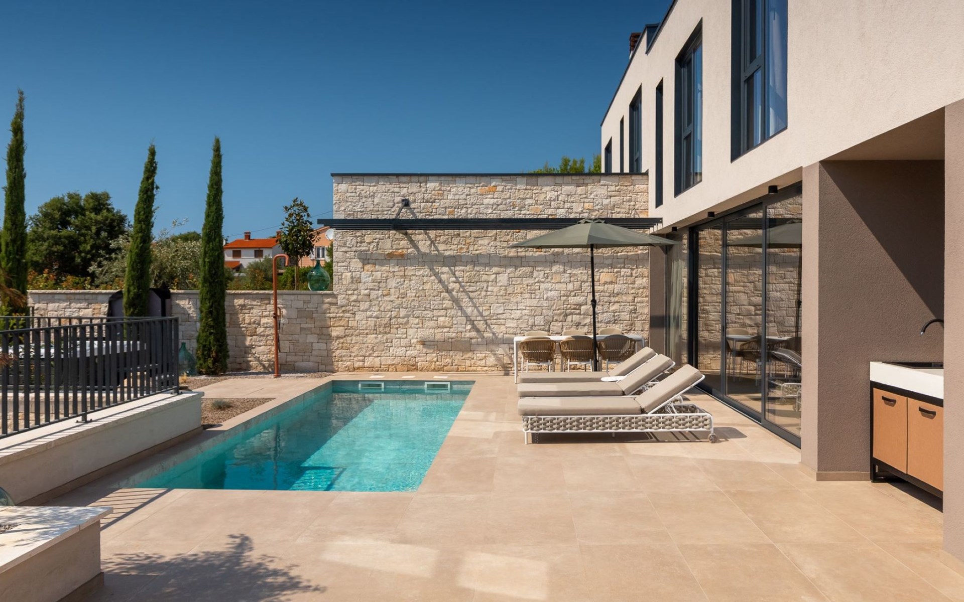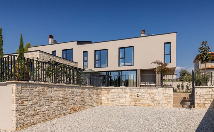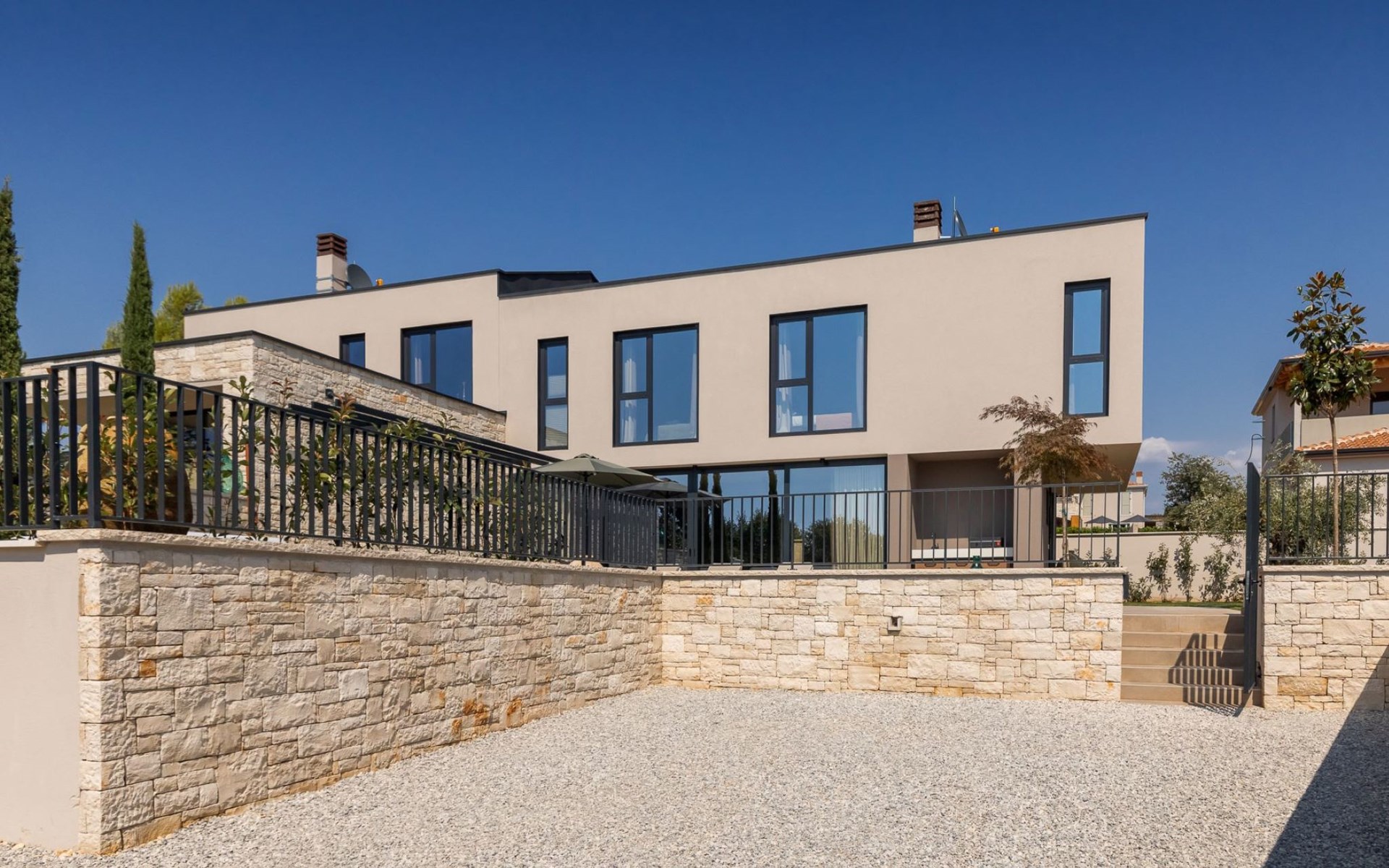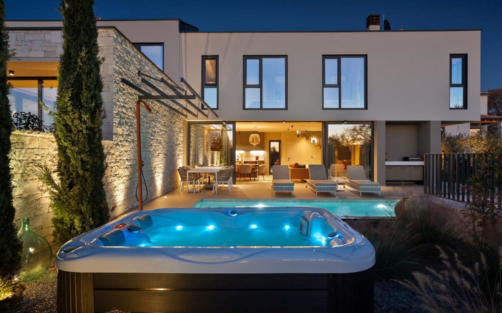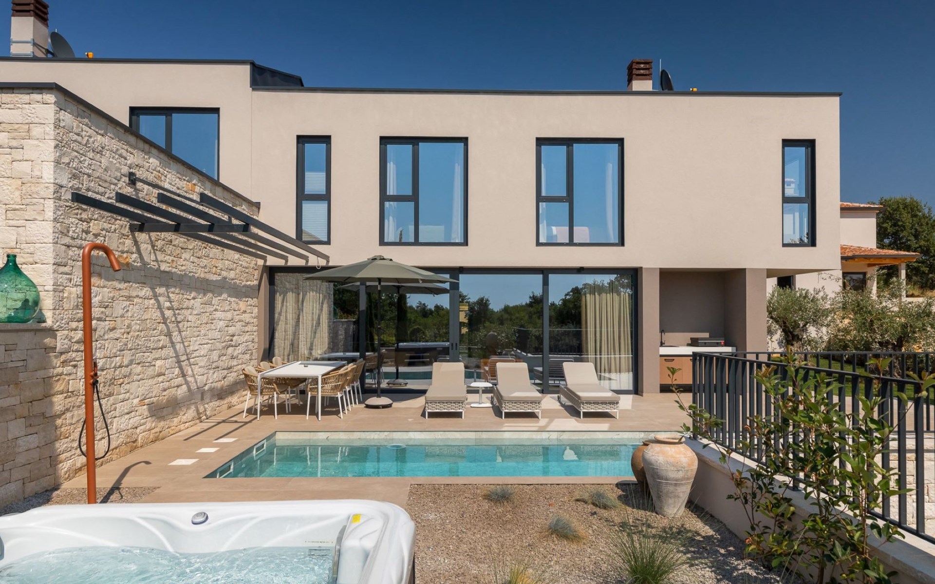 Zeer mooi twee onder één kap woning "Tia 2", van 2 verdiepingen, bouwjaar 2024. In het gehucht Mihatovići, 1 km van het centrum van Nova Vas, 5 km van het centrum van Poreč, 4.5 km van zee, 4.5 km van het strand. Voor alleengebruik: terrein 400 m2 (omheind), tuin met gazon, openluchtzwembad hoekig, verwarmd (7 x 3 m, 21 m2, 140 cm diepte, seizoensgebonden beschikbaarheid: 01.Apr. - 01.Nov.) met trap en zout-elektrolyse. Buitendouche, terras (20 m2), barbecue. In het huis: internetaansluiting, sauna, hot tub, wasmachine. Parkeerplaats (voor 2 auto's) bij het huis op het terrein. Winkel 1.5 km, winkelcentrum 3 km, restaurant 70 m, café 1.5 km, bushalte 2.8 km, kiezelstrand 4.5 km, rotsstrand 4.5 km. Attracties in de buurt: Aquapark 9 km. Groepen jongeren uitsluitend op aanvraag. Vliegveld 46 m van het huis.