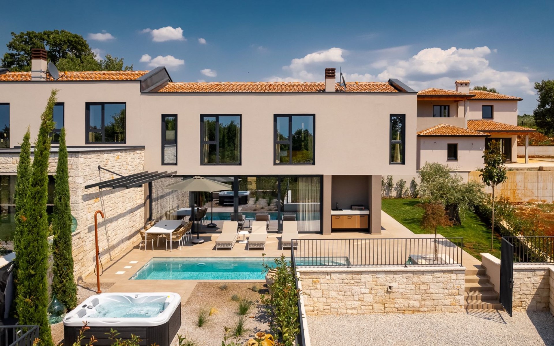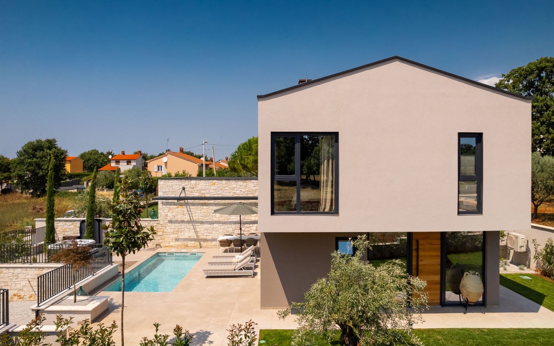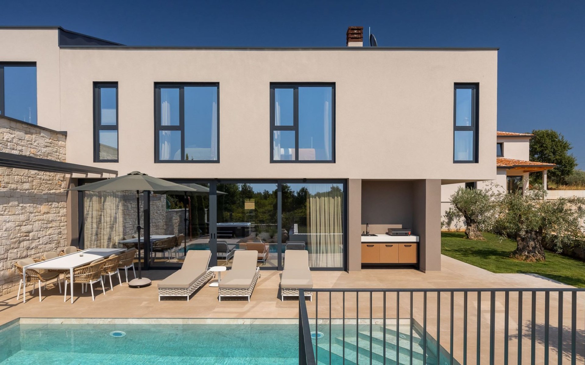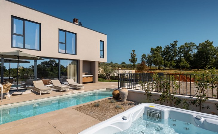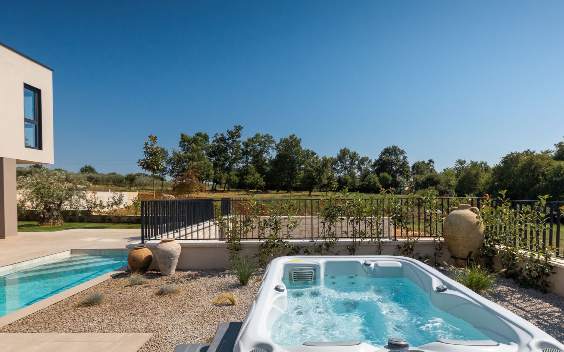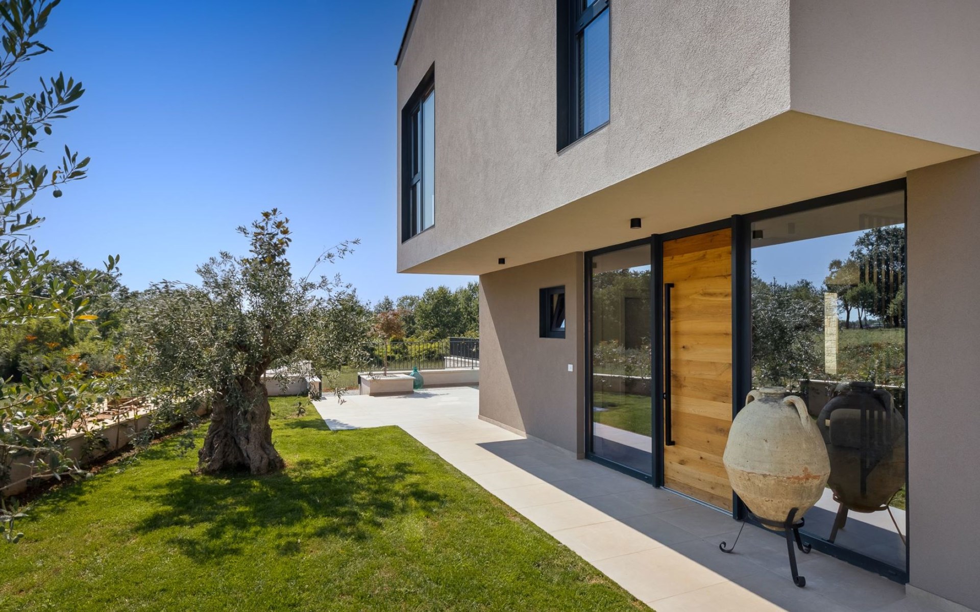Zeer mooi twee onder één kap woning "Tia 2", van 2 verdiepingen, bouwjaar 2024. In het gehucht Mihatovići, 1 km van het centrum van Nova Vas, 5 km van het centrum van Poreč, 4.5 km van zee, 4.5 km van het strand. Voor alleengebruik: terrein 400 m2 (omheind), tuin met gazon, openluchtzwembad hoekig, verwarmd (7 x 3 m, 21 m2, 140 cm diepte, seizoensgebonden beschikbaarheid: 01.Apr. - 01.Nov.) met trap en zout-elektrolyse. Buitendouche, terras (20 m2), barbecue. In het huis: internetaansluiting, sauna, hot tub, wasmachine. Parkeerplaats (voor 2 auto's) bij het huis op het terrein. Winkel 1.5 km, winkelcentrum 3 km, restaurant 70 m, café 1.5 km, bushalte 2.8 km, kiezelstrand 4.5 km, rotsstrand 4.5 km. Attracties in de buurt: Aquapark 9 km. Groepen jongeren uitsluitend op aanvraag. Vliegveld 46 m van het huis.