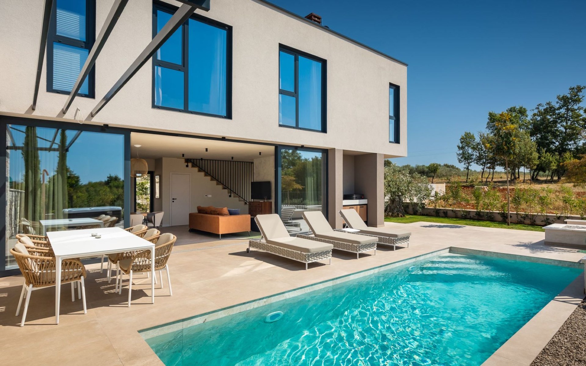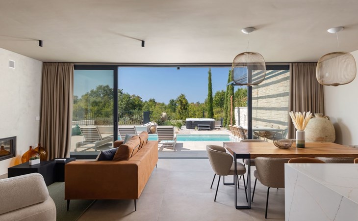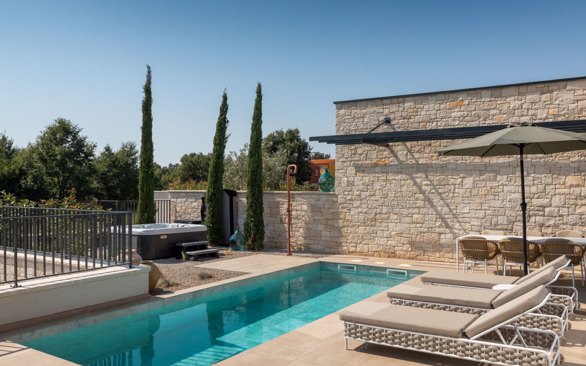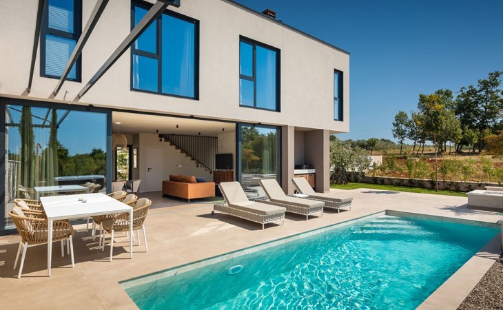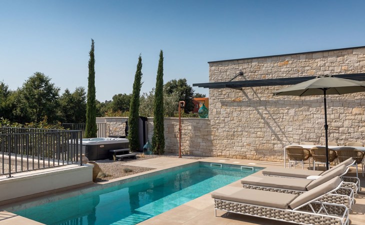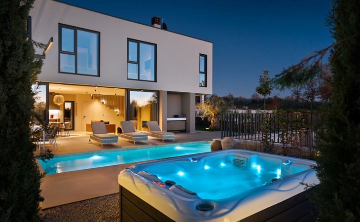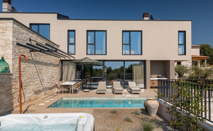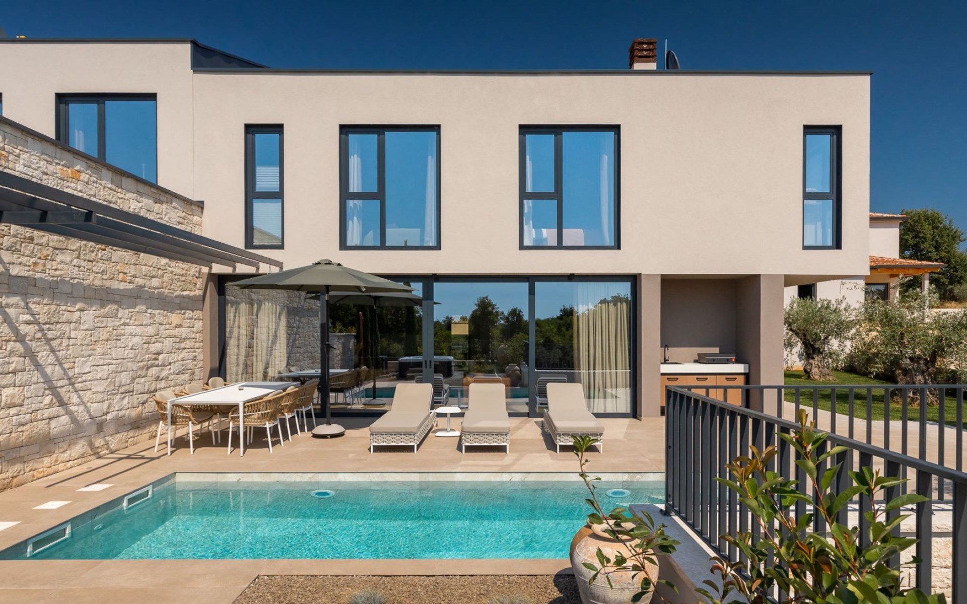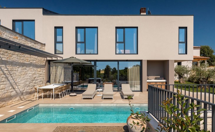 Zeer mooi twee onder één kap woning "Tia 2", van 2 verdiepingen, bouwjaar 2024. In het gehucht Mihatovići, 1 km van het centrum van Nova Vas, 5 km van het centrum van Poreč, 4.5 km van zee, 4.5 km van het strand. Voor alleengebruik: terrein 400 m2 (omheind), tuin met gazon, openluchtzwembad hoekig, verwarmd (7 x 3 m, 21 m2, 140 cm diepte, seizoensgebonden beschikbaarheid: 01.Apr. - 01.Nov.) met trap en zout-elektrolyse. Buitendouche, terras (20 m2), barbecue. In het huis: internetaansluiting, sauna, hot tub, wasmachine. Parkeerplaats (voor 2 auto's) bij het huis op het terrein. Winkel 1.5 km, winkelcentrum 3 km, restaurant 70 m, café 1.5 km, bushalte 2.8 km, kiezelstrand 4.5 km, rotsstrand 4.5 km. Attracties in de buurt: Aquapark 9 km. Groepen jongeren uitsluitend op aanvraag. Vliegveld 46 m van het huis.
