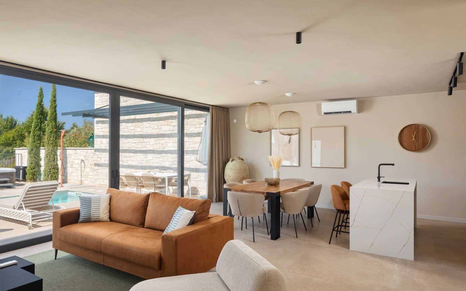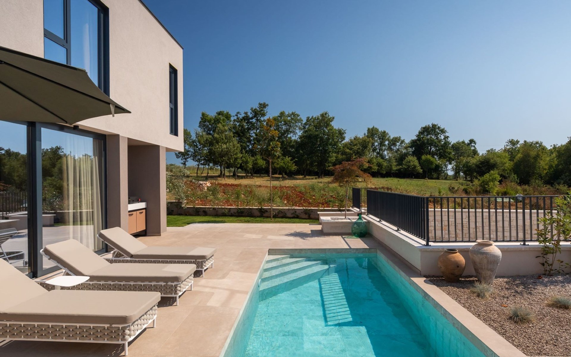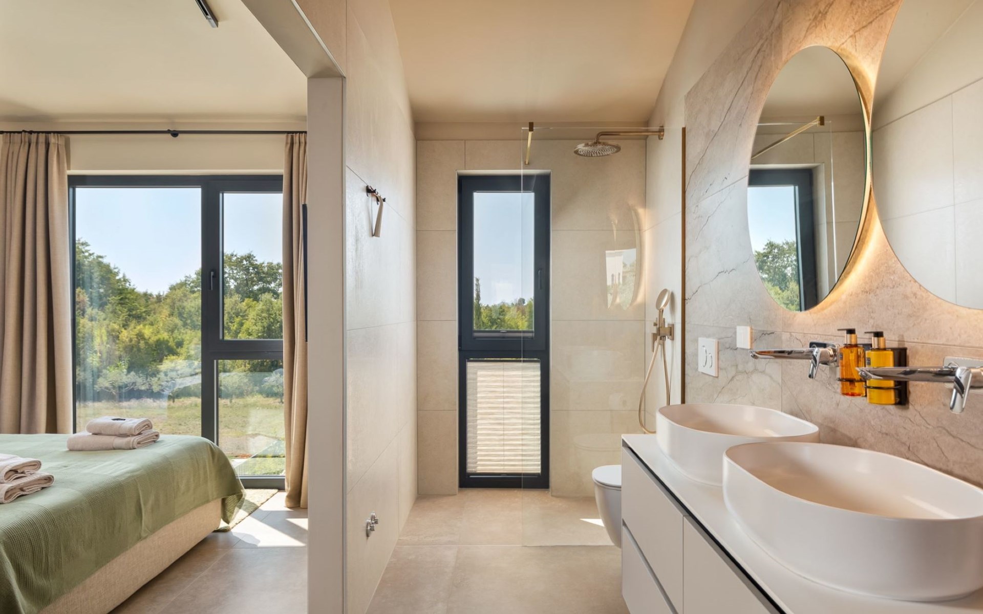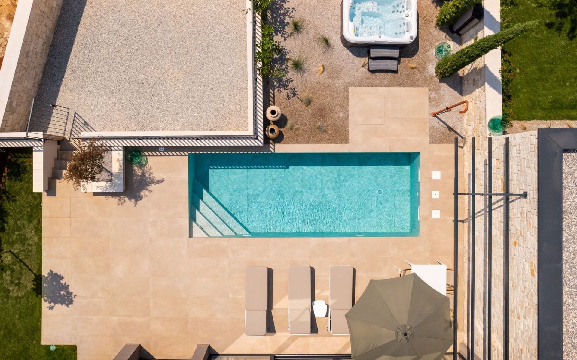 Zeer mooi twee onder één kap woning "Tia 2", van 2 verdiepingen, bouwjaar 2024. In het gehucht Mihatovići, 1 km van het centrum van Nova Vas, 5 km van het centrum van Poreč, 4.5 km van zee, 4.5 km van het strand. Voor alleengebruik: terrein 400 m2 (omheind), tuin met gazon, openluchtzwembad hoekig, verwarmd (7 x 3 m, 21 m2, 140 cm diepte, seizoensgebonden beschikbaarheid: 01.Apr. - 01.Nov.) met trap en zout-elektrolyse. Buitendouche, terras (20 m2), barbecue. In het huis: internetaansluiting, sauna, hot tub, wasmachine. Parkeerplaats (voor 2 auto's) bij het huis op het terrein. Winkel 1.5 km, winkelcentrum 3 km, restaurant 70 m, café 1.5 km, bushalte 2.8 km, kiezelstrand 4.5 km, rotsstrand 4.5 km. Attracties in de buurt: Aquapark 9 km. Groepen jongeren uitsluitend op aanvraag. Vliegveld 46 m van het huis.