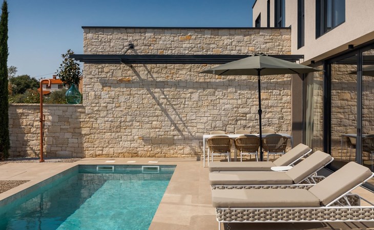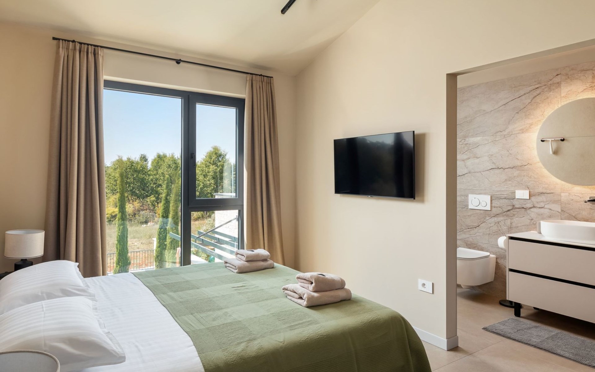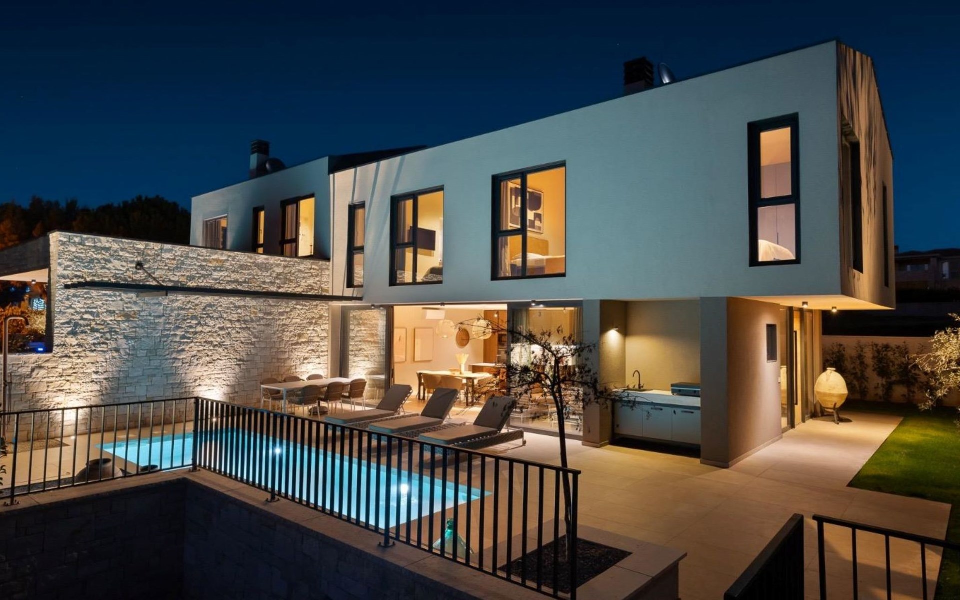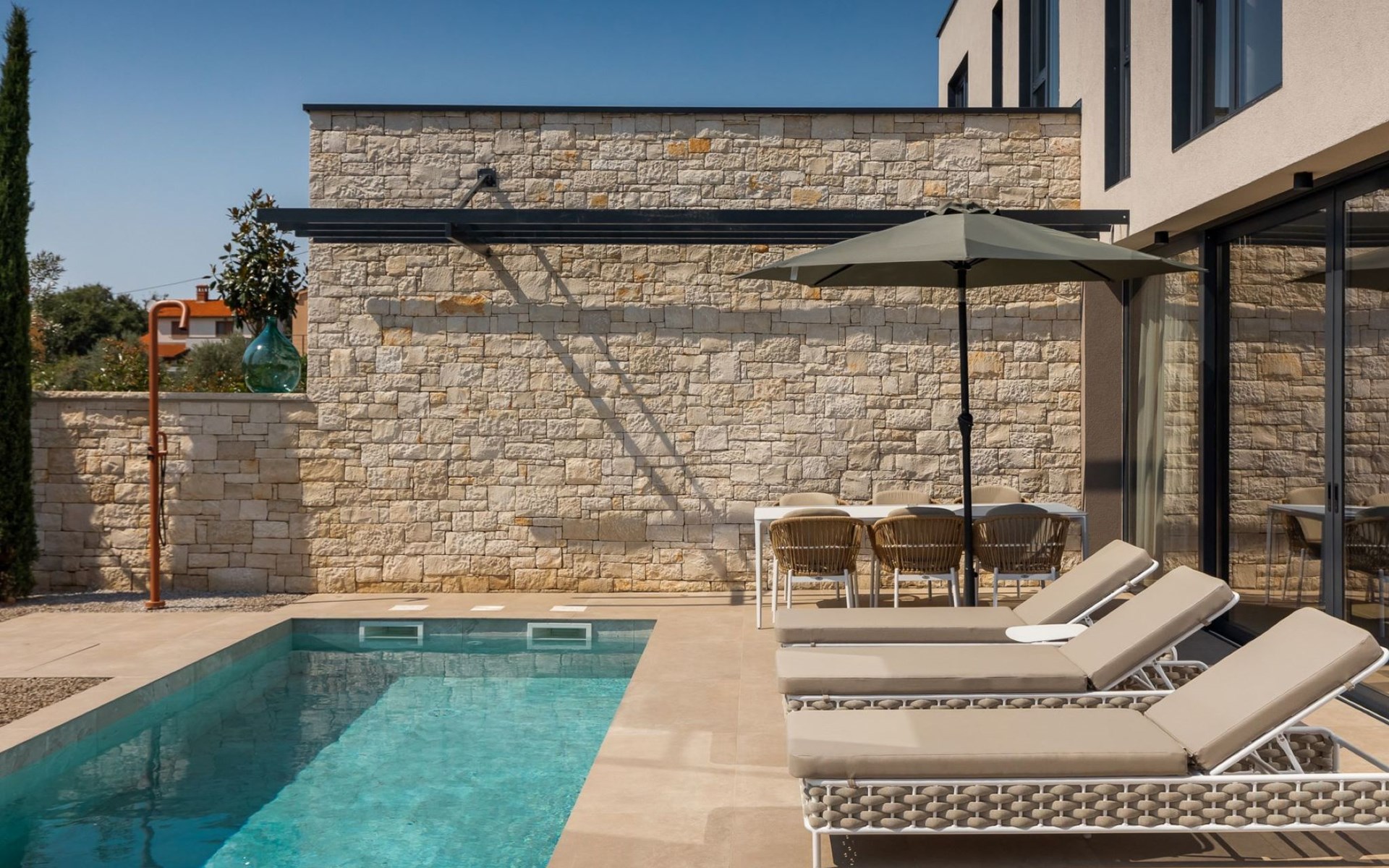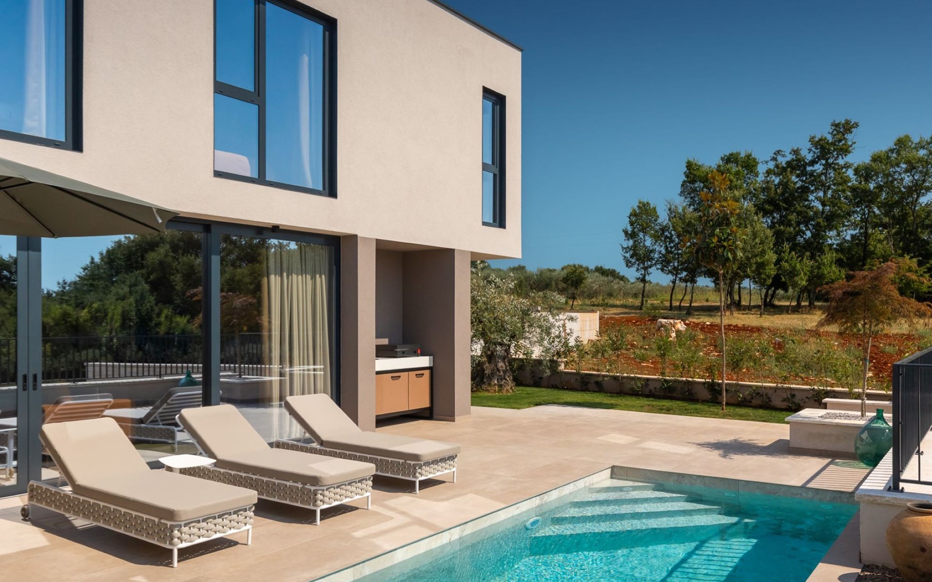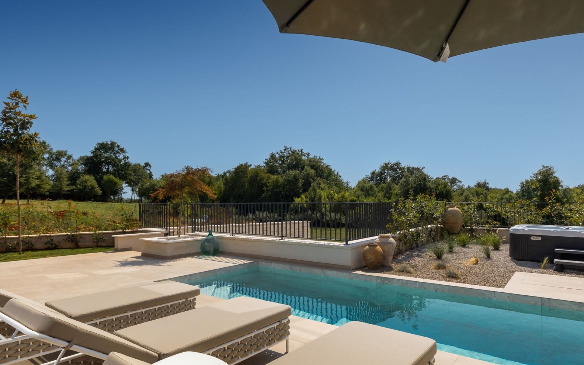 Zeer mooi twee onder één kap woning "Tia 2", van 2 verdiepingen, bouwjaar 2024. In het gehucht Mihatovići, 1 km van het centrum van Nova Vas, 5 km van het centrum van Poreč, 4.5 km van zee, 4.5 km van het strand. Voor alleengebruik: terrein 400 m2 (omheind), tuin met gazon, openluchtzwembad hoekig, verwarmd (7 x 3 m, 21 m2, 140 cm diepte, seizoensgebonden beschikbaarheid: 01.Apr. - 01.Nov.) met trap en zout-elektrolyse. Buitendouche, terras (20 m2), barbecue. In het huis: internetaansluiting, sauna, hot tub, wasmachine. Parkeerplaats (voor 2 auto's) bij het huis op het terrein. Winkel 1.5 km, winkelcentrum 3 km, restaurant 70 m, café 1.5 km, bushalte 2.8 km, kiezelstrand 4.5 km, rotsstrand 4.5 km. Attracties in de buurt: Aquapark 9 km. Groepen jongeren uitsluitend op aanvraag. Vliegveld 46 m van het huis.
