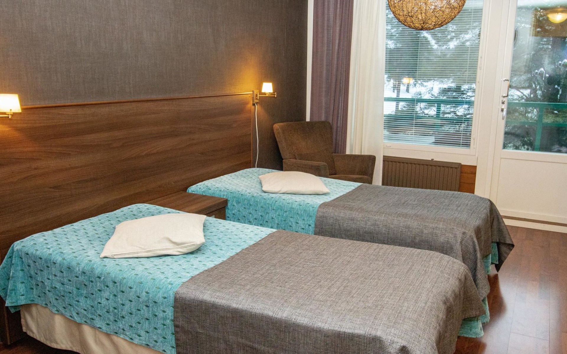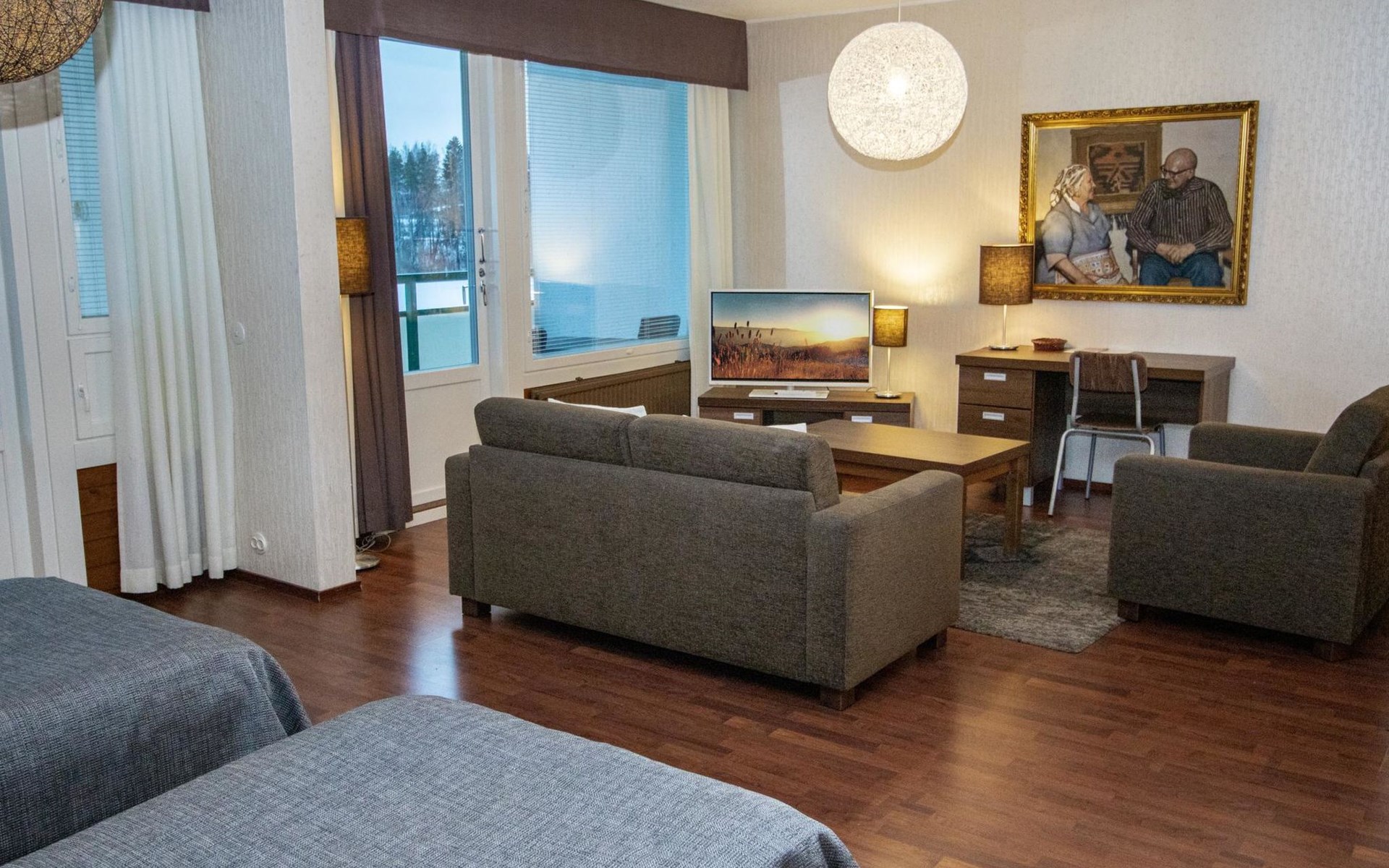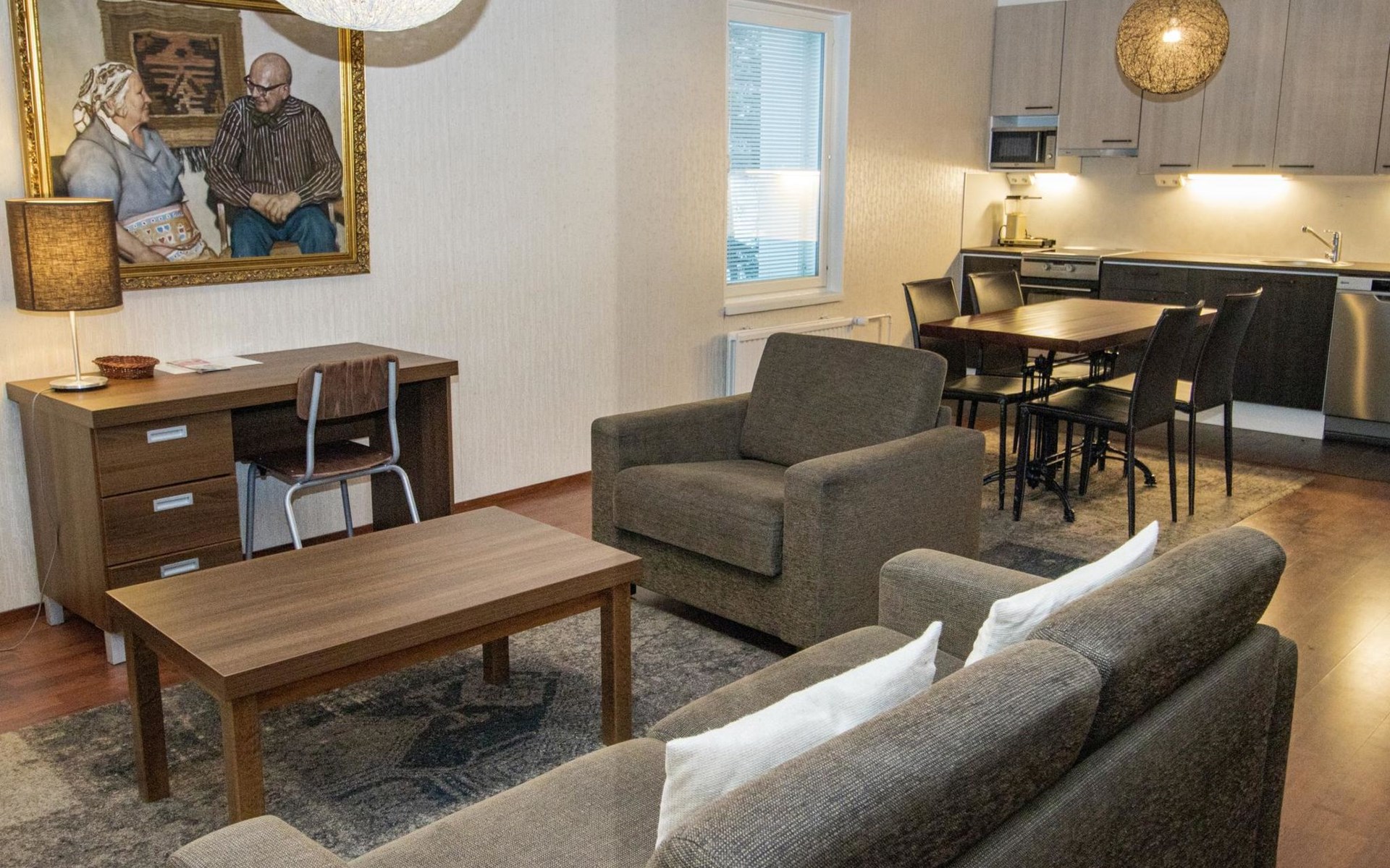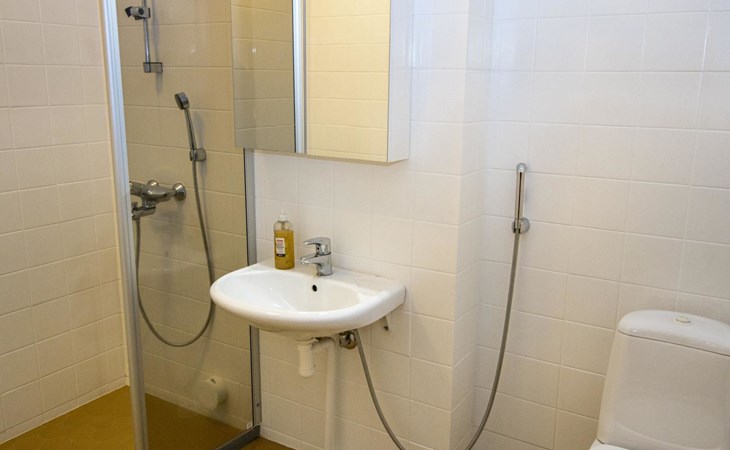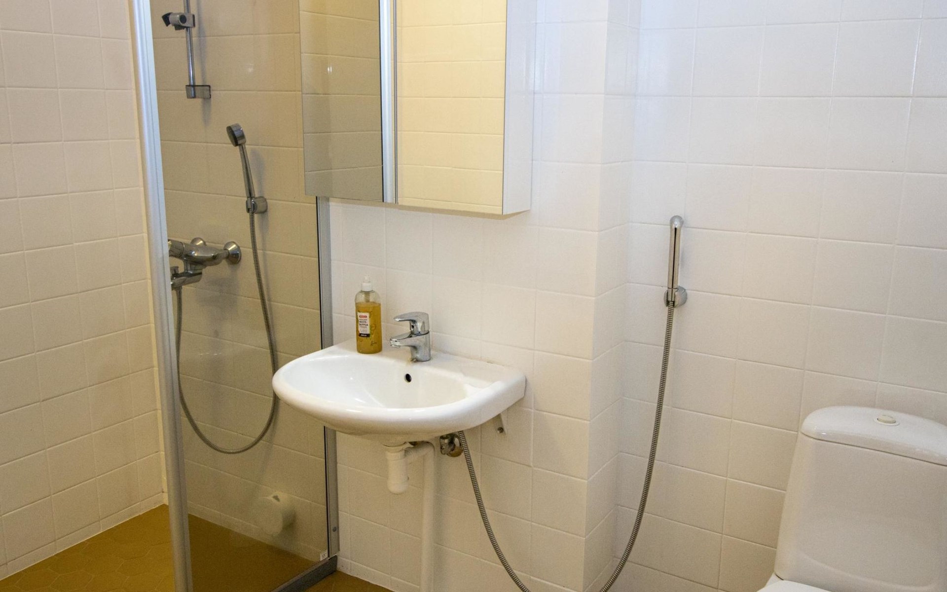 This apartment includes one room with a well-equipped kitchen, a separate dining area, two beds, and a bathroom with a WC and shower.