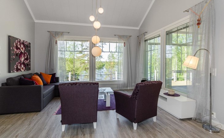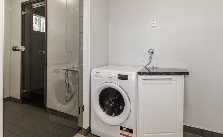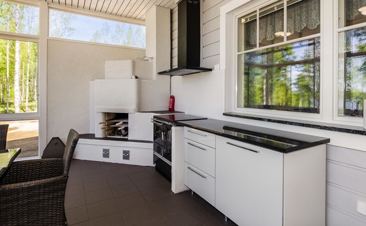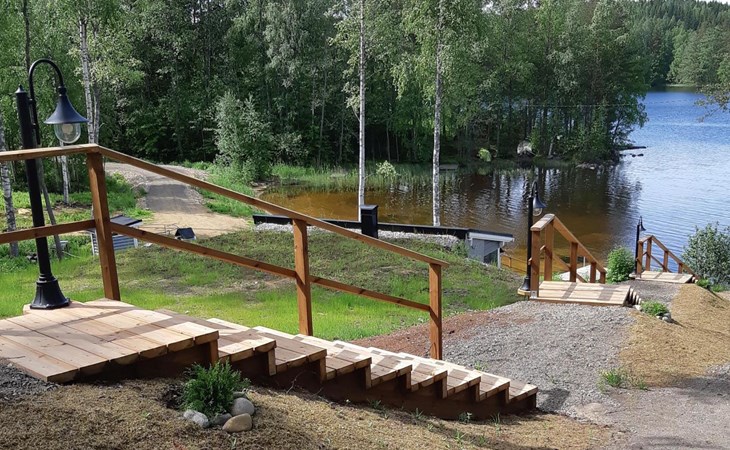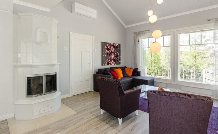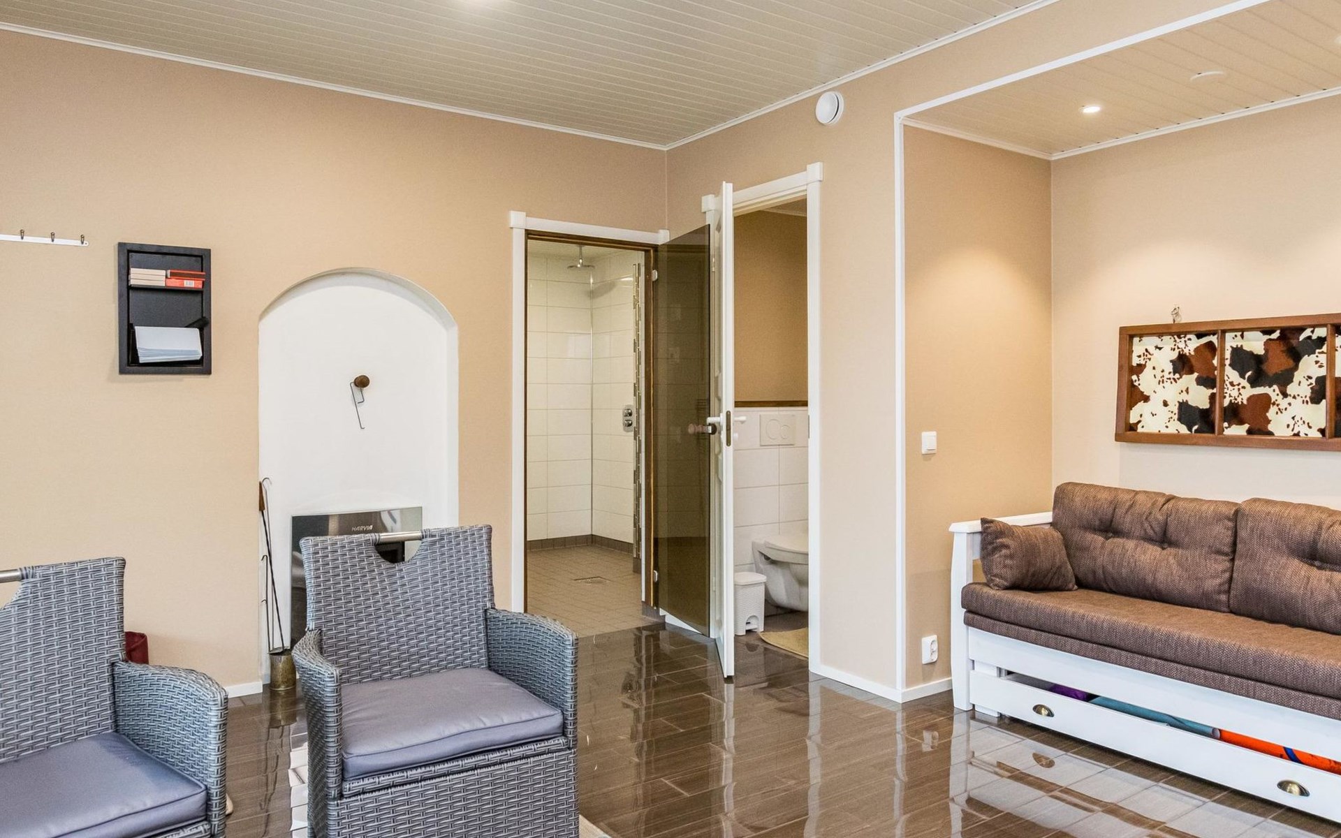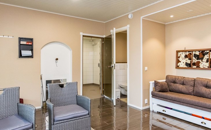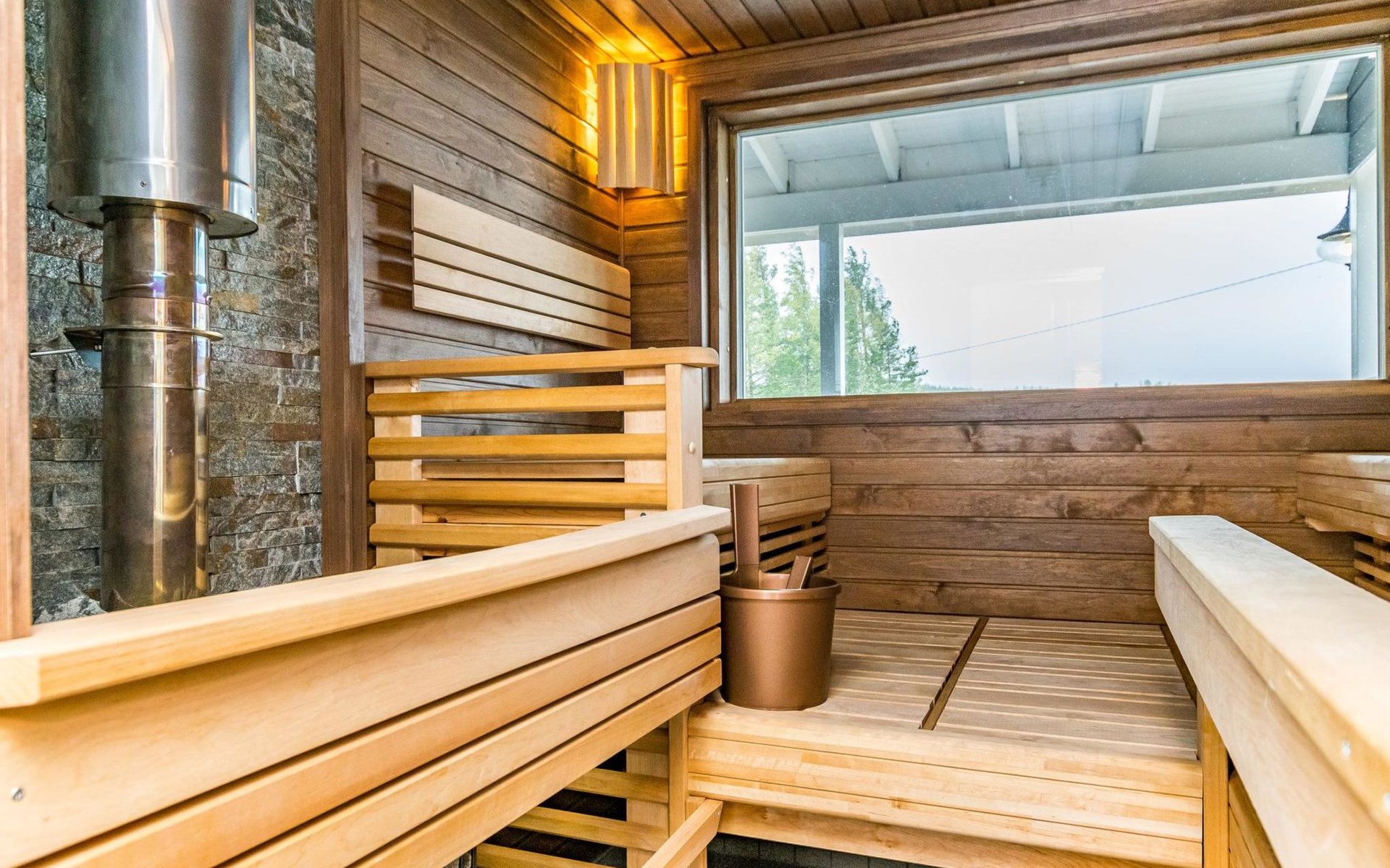 A wood-heated 32 m² sauna on the shore. There are 2 rain showers, toilet and porch. A sofa bed for 2 extra persons on the porch/living room (living room area is about 15 m² and it has sliding glass door).