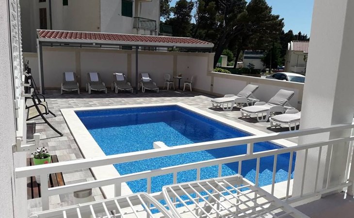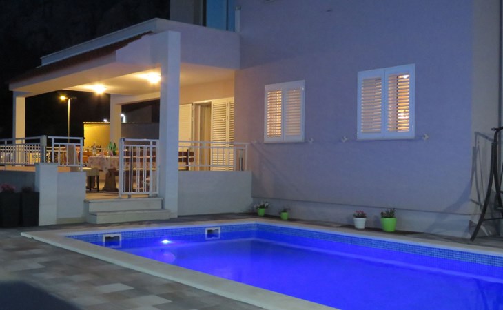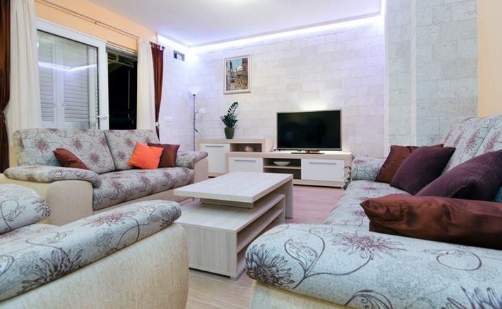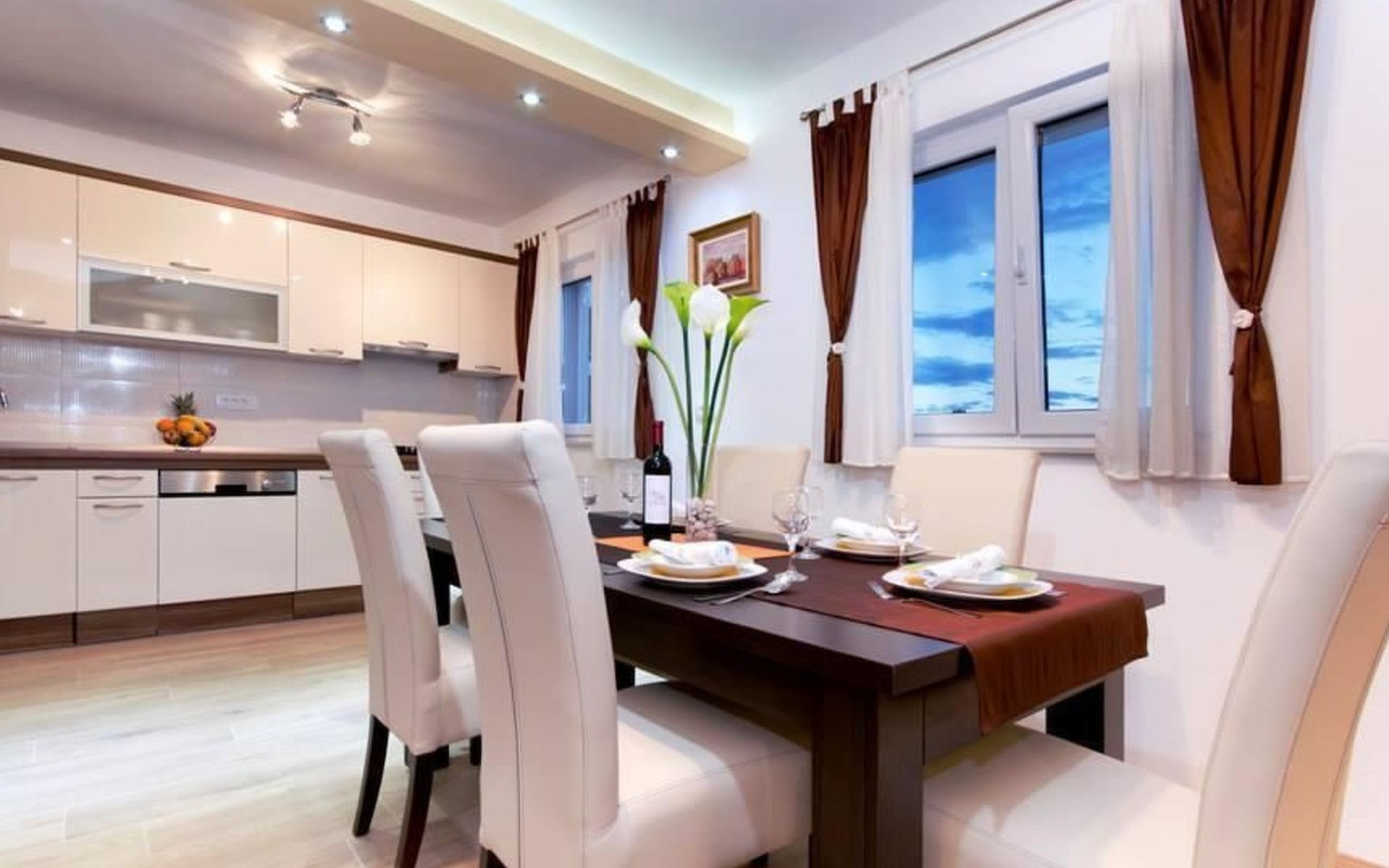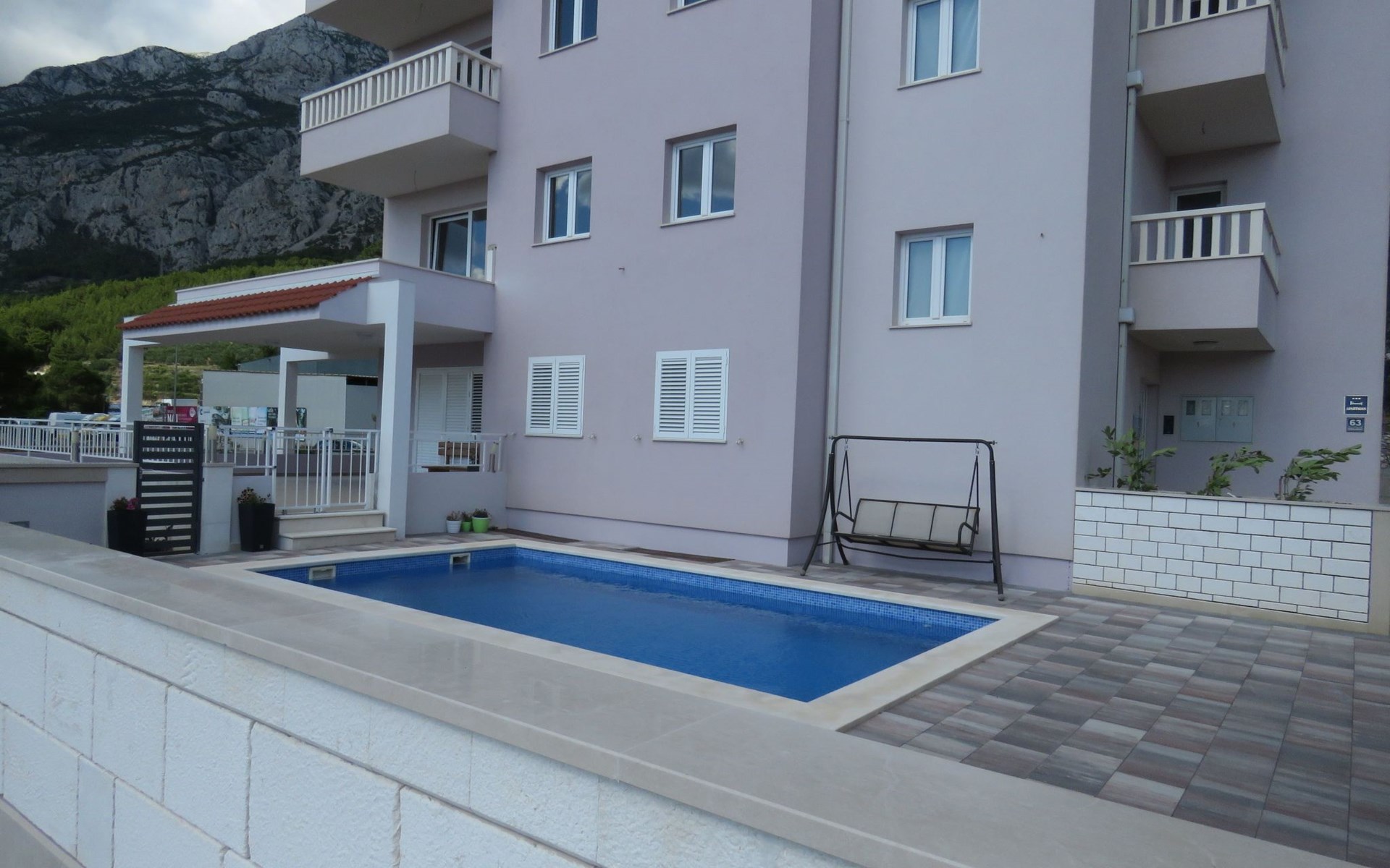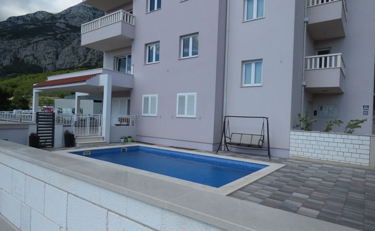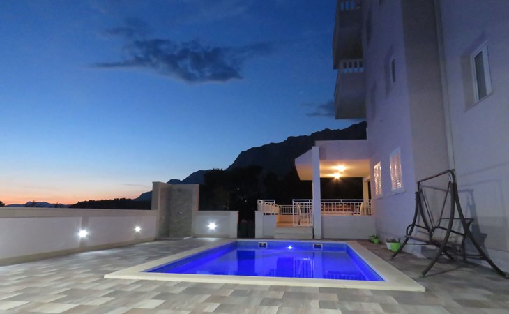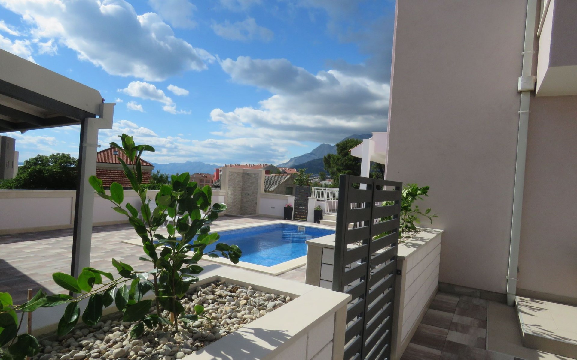 This comfortable and modern holiday flat with pool is located on the ground floor and first floor of an uninhabited private house with private parking and large terraces. The property is located in the eastern part of the town of Makarska, a town in the south of Croatia, southeast of Split, in the immediate vicinity of the city centre.Stepping through a sliding door from the living room you enter the terraces, where two benches, a long table with cosy chairs are available for outdoor dining. A sun canopy and an extendable marquise provide protection from the Mediterranean sun while dining. A small staircase paves the way to the pool area with an outdoor shower, sun roof area, adjustable sun loungers for sunbathing and the 24 m² pool. A barbecue for a barbecue evening is of course also available on site. The courtyard offers several parking spaces for those arriving by car.The house has three floors, but the second floor is closed. This makes the holiday flat ideal for a shared and relaxing holiday with groups of friends or a large family of up to twelve people, while still offering plenty of privacy. Built in 2013, emphasis was placed on comfortable and modern furnishings. On two living areas totalling 260 square metres, you are welcomed into six bedrooms, five of which have a double bed and one has two single beds. The living space is divided into three living and dining areas with three open-plan kitchens. There are also five shower rooms. In four bedrooms you will find a comfortable night's sleep in a double bed with a width of 180 cm. There are two bedside tables with reading lamps on both sides of the bed. The window, which can be fully opened on both sides, gives you a view of the greenery. In one bedroom, a wide double bed (160 cm) also offers you a restful night's sleep and has been furnished with a wardrobe at the headboard. Here, too, you can look out of the window and enjoy the view of nature. Another bedroom is slightly narrower and welcomes you with two single beds, which can be put together on request before your arrival. There is also a wardrobe and a bedside table with a reading lamp in this room. From the window, you can enjoy a sweeping view of the hilly surroundings. In the living room, you can sit together on three comfortable sofas. Three large flat screens with digital satellite TV and TV USB connection allow you to watch international TV as well as organise a film evening using the external USB storage device you have brought with you. On the way from the living room to the kitchen (in two separate flats), you will pass a massive dining table with six upholstered high-back chairs. The three kitchens are equipped with a fridge-freezer, dishwasher, microwave, built-in oven, gas/electric hob and small electrical appliances such as a coffee machine, kettle and toaster for your extensive self-catering needs. All five bathrooms are equipped with a wash hand basin, mirror, WC and shower curtain. While one bathroom has a shower in the bathtub, the others are equipped with a shower in the corner of the room. In addition to bed linen and towels, which are provided free of charge, Internet access via WLAN is also included. Inside the house, all rooms are equipped with air conditioning.There is a large Kaufland supermarket just 50 metres away, with a bureau de change, café, cash machine etc. A pebble beach is just 1000 metres away. The old town is 800 metres away on foot or by car. Restaurants and pubs invite you to stop for a bite to eat. There are water sports facilities on the beach and a tennis court 500 metres away.In addition to the high-quality furnishings, the special feature of this holiday home is certainly its privacy. Although the owner does not live in the house, he is available to you at any time.