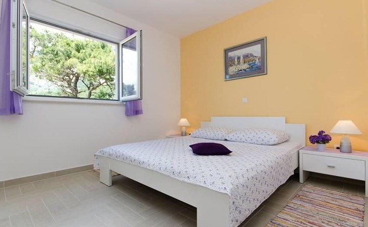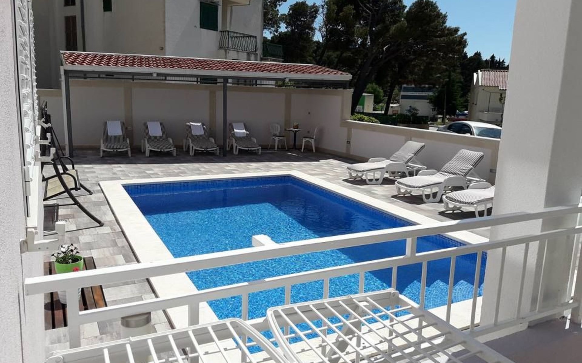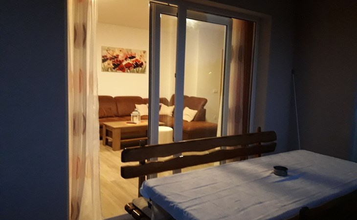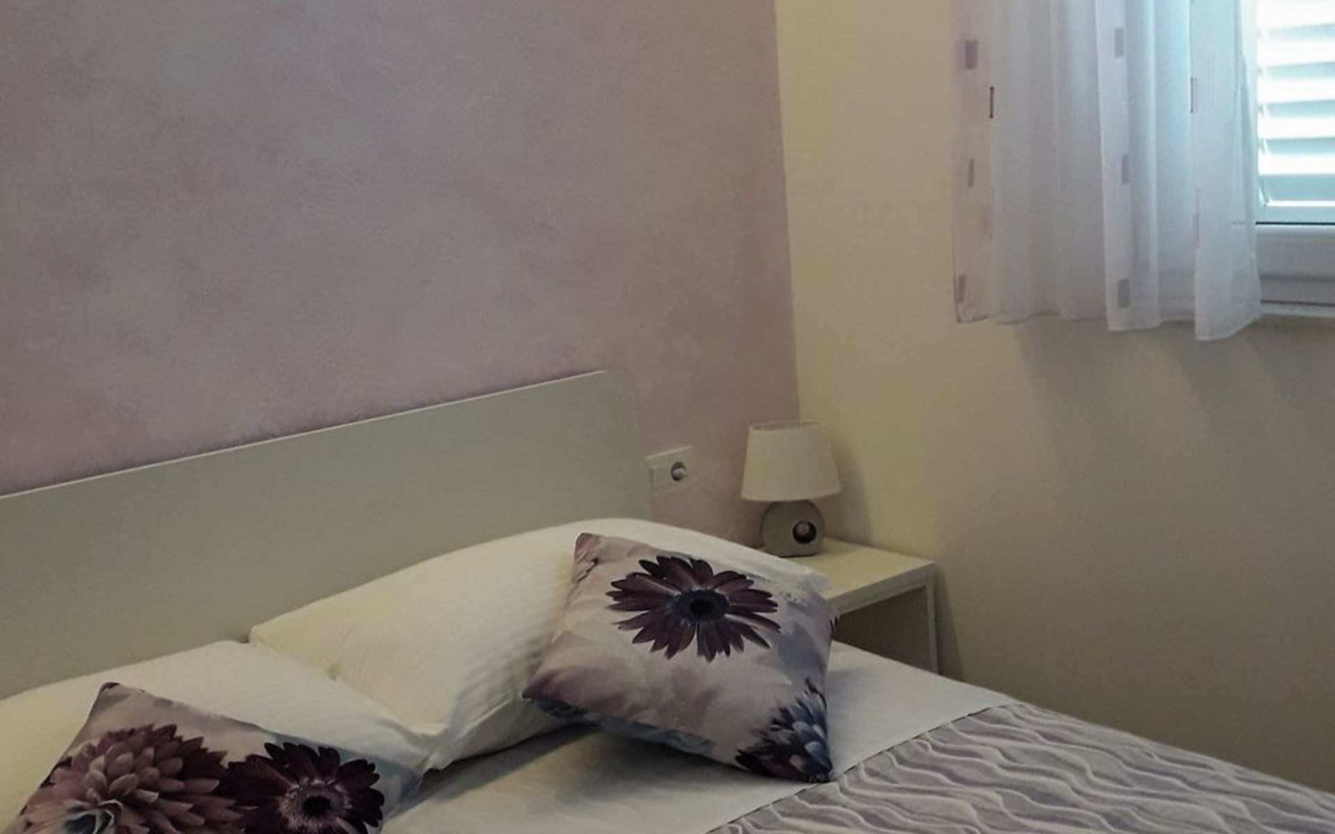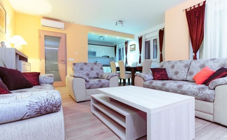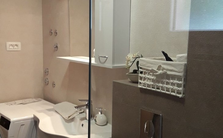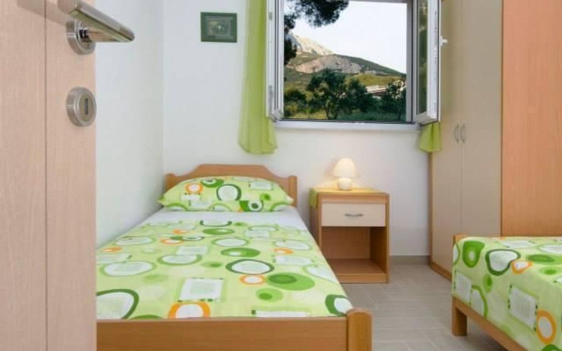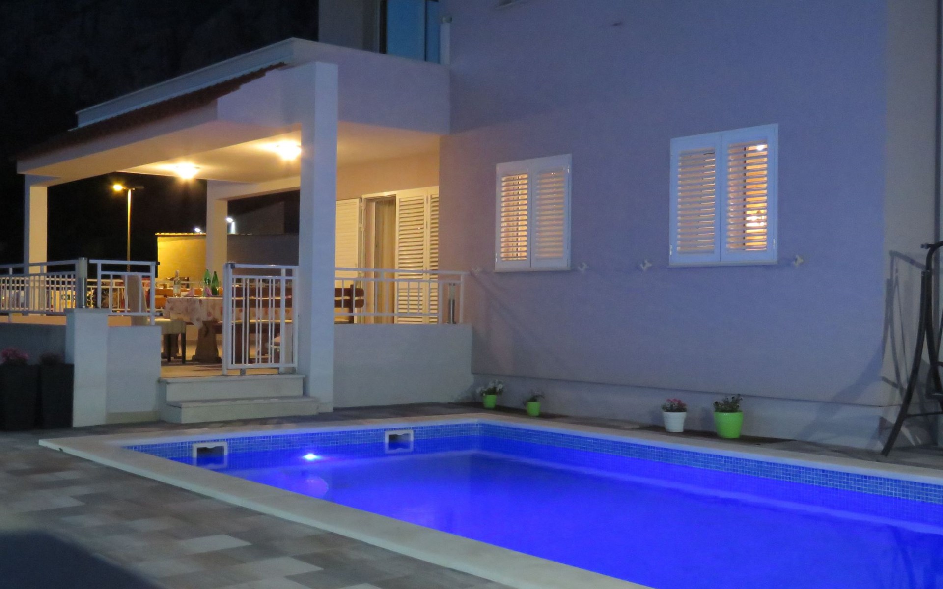 This comfortable and modern holiday flat with pool is located on the ground floor and first floor of an uninhabited private house with private parking and large terraces. The property is located in the eastern part of the town of Makarska, a town in the south of Croatia, southeast of Split, in the immediate vicinity of the city centre.Stepping through a sliding door from the living room you enter the terraces, where two benches, a long table with cosy chairs are available for outdoor dining. A sun canopy and an extendable marquise provide protection from the Mediterranean sun while dining. A small staircase paves the way to the pool area with an outdoor shower, sun roof area, adjustable sun loungers for sunbathing and the 24 m² pool. A barbecue for a barbecue evening is of course also available on site. The courtyard offers several parking spaces for those arriving by car.The house has three floors, but the second floor is closed. This makes the holiday flat ideal for a shared and relaxing holiday with groups of friends or a large family of up to twelve people, while still offering plenty of privacy. Built in 2013, emphasis was placed on comfortable and modern furnishings. On two living areas totalling 260 square metres, you are welcomed into six bedrooms, five of which have a double bed and one has two single beds. The living space is divided into three living and dining areas with three open-plan kitchens. There are also five shower rooms. In four bedrooms you will find a comfortable night's sleep in a double bed with a width of 180 cm. There are two bedside tables with reading lamps on both sides of the bed. The window, which can be fully opened on both sides, gives you a view of the greenery. In one bedroom, a wide double bed (160 cm) also offers you a restful night's sleep and has been furnished with a wardrobe at the headboard. Here, too, you can look out of the window and enjoy the view of nature. Another bedroom is slightly narrower and welcomes you with two single beds, which can be put together on request before your arrival. There is also a wardrobe and a bedside table with a reading lamp in this room. From the window, you can enjoy a sweeping view of the hilly surroundings. In the living room, you can sit together on three comfortable sofas. Three large flat screens with digital satellite TV and TV USB connection allow you to watch international TV as well as organise a film evening using the external USB storage device you have brought with you. On the way from the living room to the kitchen (in two separate flats), you will pass a massive dining table with six upholstered high-back chairs. The three kitchens are equipped with a fridge-freezer, dishwasher, microwave, built-in oven, gas/electric hob and small electrical appliances such as a coffee machine, kettle and toaster for your extensive self-catering needs. All five bathrooms are equipped with a wash hand basin, mirror, WC and shower curtain. While one bathroom has a shower in the bathtub, the others are equipped with a shower in the corner of the room. In addition to bed linen and towels, which are provided free of charge, Internet access via WLAN is also included. Inside the house, all rooms are equipped with air conditioning.There is a large Kaufland supermarket just 50 metres away, with a bureau de change, café, cash machine etc. A pebble beach is just 1000 metres away. The old town is 800 metres away on foot or by car. Restaurants and pubs invite you to stop for a bite to eat. There are water sports facilities on the beach and a tennis court 500 metres away.In addition to the high-quality furnishings, the special feature of this holiday home is certainly its privacy. Although the owner does not live in the house, he is available to you at any time.