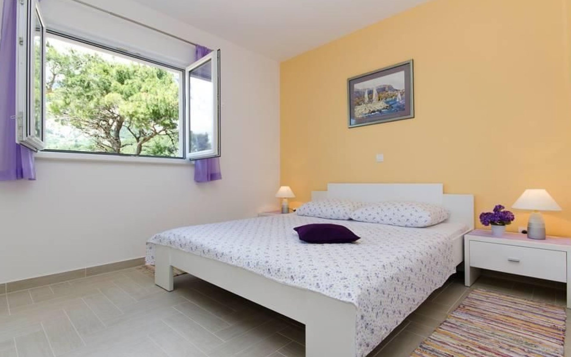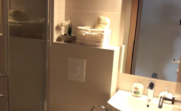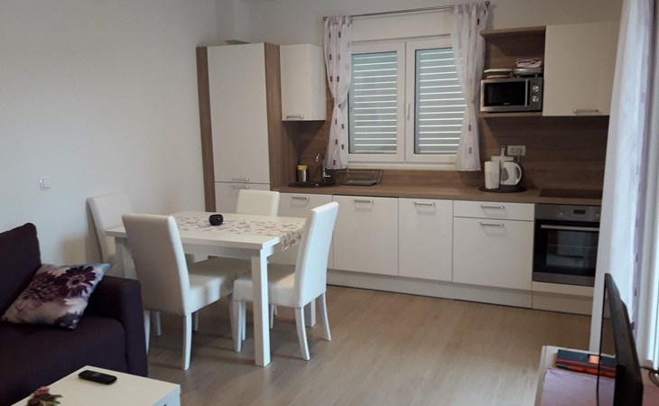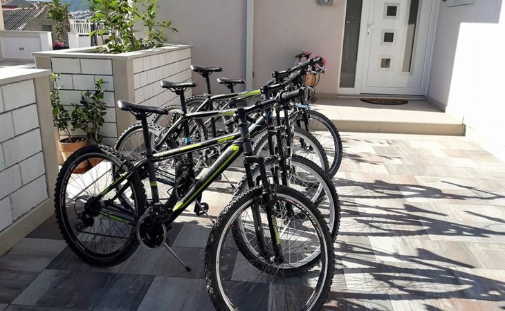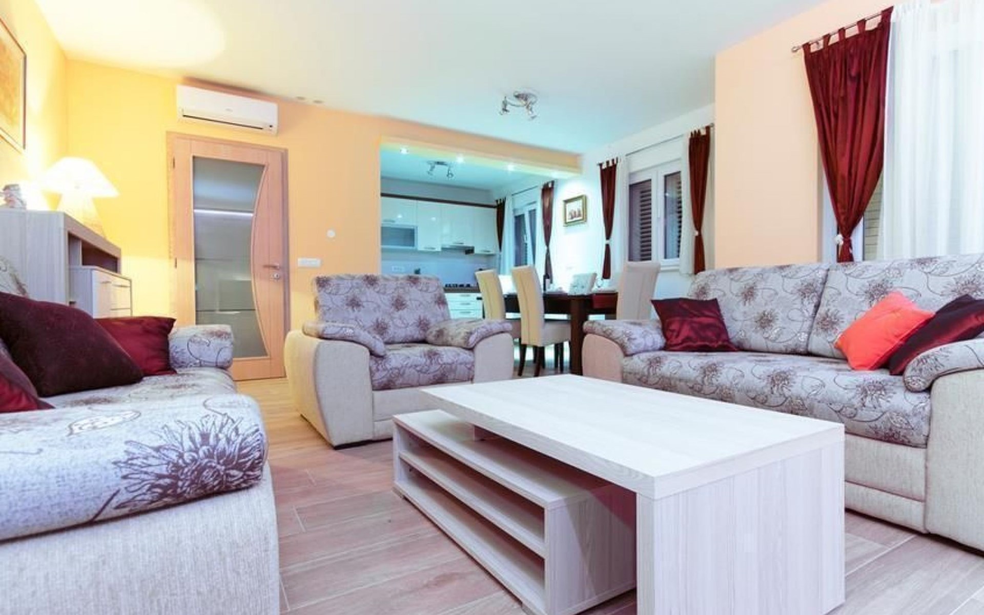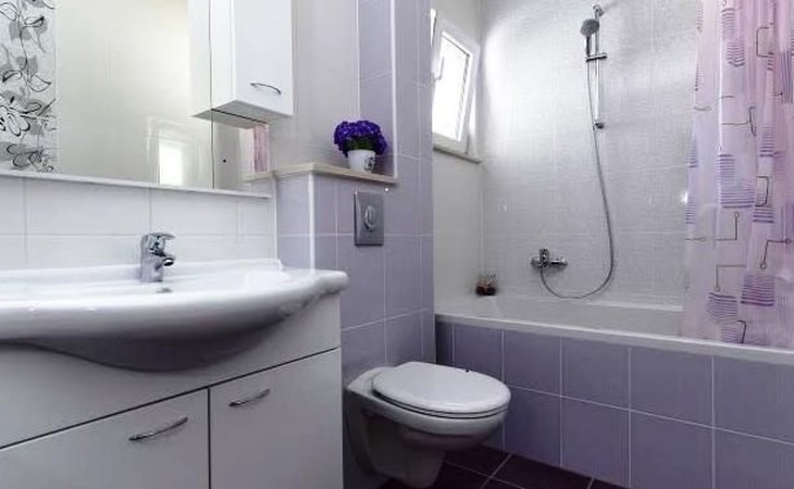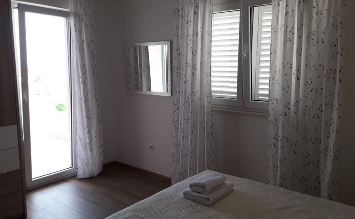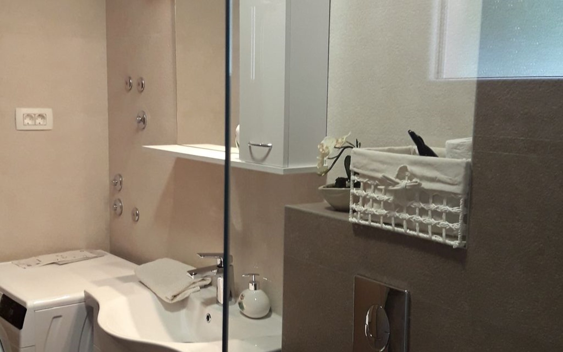 This comfortable and modern holiday flat with pool is located on the ground floor and first floor of an uninhabited private house with private parking and large terraces. The property is located in the eastern part of the town of Makarska, a town in the south of Croatia, southeast of Split, in the immediate vicinity of the city centre.Stepping through a sliding door from the living room you enter the terraces, where two benches, a long table with cosy chairs are available for outdoor dining. A sun canopy and an extendable marquise provide protection from the Mediterranean sun while dining. A small staircase paves the way to the pool area with an outdoor shower, sun roof area, adjustable sun loungers for sunbathing and the 24 m² pool. A barbecue for a barbecue evening is of course also available on site. The courtyard offers several parking spaces for those arriving by car.The house has three floors, but the second floor is closed. This makes the holiday flat ideal for a shared and relaxing holiday with groups of friends or a large family of up to twelve people, while still offering plenty of privacy. Built in 2013, emphasis was placed on comfortable and modern furnishings. On two living areas totalling 260 square metres, you are welcomed into six bedrooms, five of which have a double bed and one has two single beds. The living space is divided into three living and dining areas with three open-plan kitchens. There are also five shower rooms. In four bedrooms you will find a comfortable night's sleep in a double bed with a width of 180 cm. There are two bedside tables with reading lamps on both sides of the bed. The window, which can be fully opened on both sides, gives you a view of the greenery. In one bedroom, a wide double bed (160 cm) also offers you a restful night's sleep and has been furnished with a wardrobe at the headboard. Here, too, you can look out of the window and enjoy the view of nature. Another bedroom is slightly narrower and welcomes you with two single beds, which can be put together on request before your arrival. There is also a wardrobe and a bedside table with a reading lamp in this room. From the window, you can enjoy a sweeping view of the hilly surroundings. In the living room, you can sit together on three comfortable sofas. Three large flat screens with digital satellite TV and TV USB connection allow you to watch international TV as well as organise a film evening using the external USB storage device you have brought with you. On the way from the living room to the kitchen (in two separate flats), you will pass a massive dining table with six upholstered high-back chairs. The three kitchens are equipped with a fridge-freezer, dishwasher, microwave, built-in oven, gas/electric hob and small electrical appliances such as a coffee machine, kettle and toaster for your extensive self-catering needs. All five bathrooms are equipped with a wash hand basin, mirror, WC and shower curtain. While one bathroom has a shower in the bathtub, the others are equipped with a shower in the corner of the room. In addition to bed linen and towels, which are provided free of charge, Internet access via WLAN is also included. Inside the house, all rooms are equipped with air conditioning.There is a large Kaufland supermarket just 50 metres away, with a bureau de change, café, cash machine etc. A pebble beach is just 1000 metres away. The old town is 800 metres away on foot or by car. Restaurants and pubs invite you to stop for a bite to eat. There are water sports facilities on the beach and a tennis court 500 metres away.In addition to the high-quality furnishings, the special feature of this holiday home is certainly its privacy. Although the owner does not live in the house, he is available to you at any time.