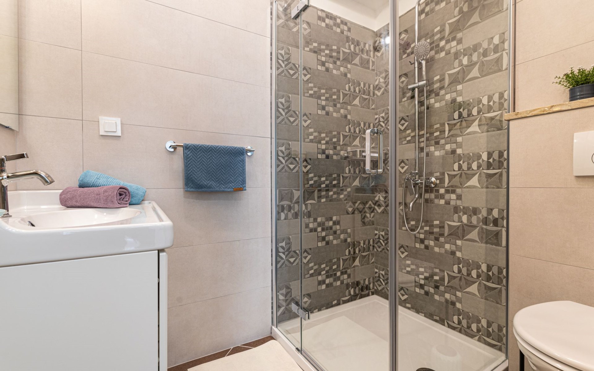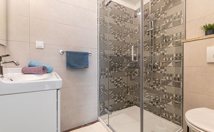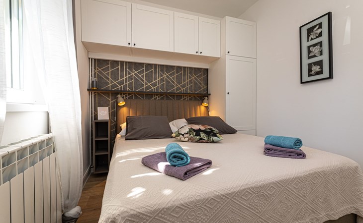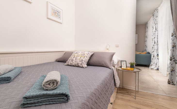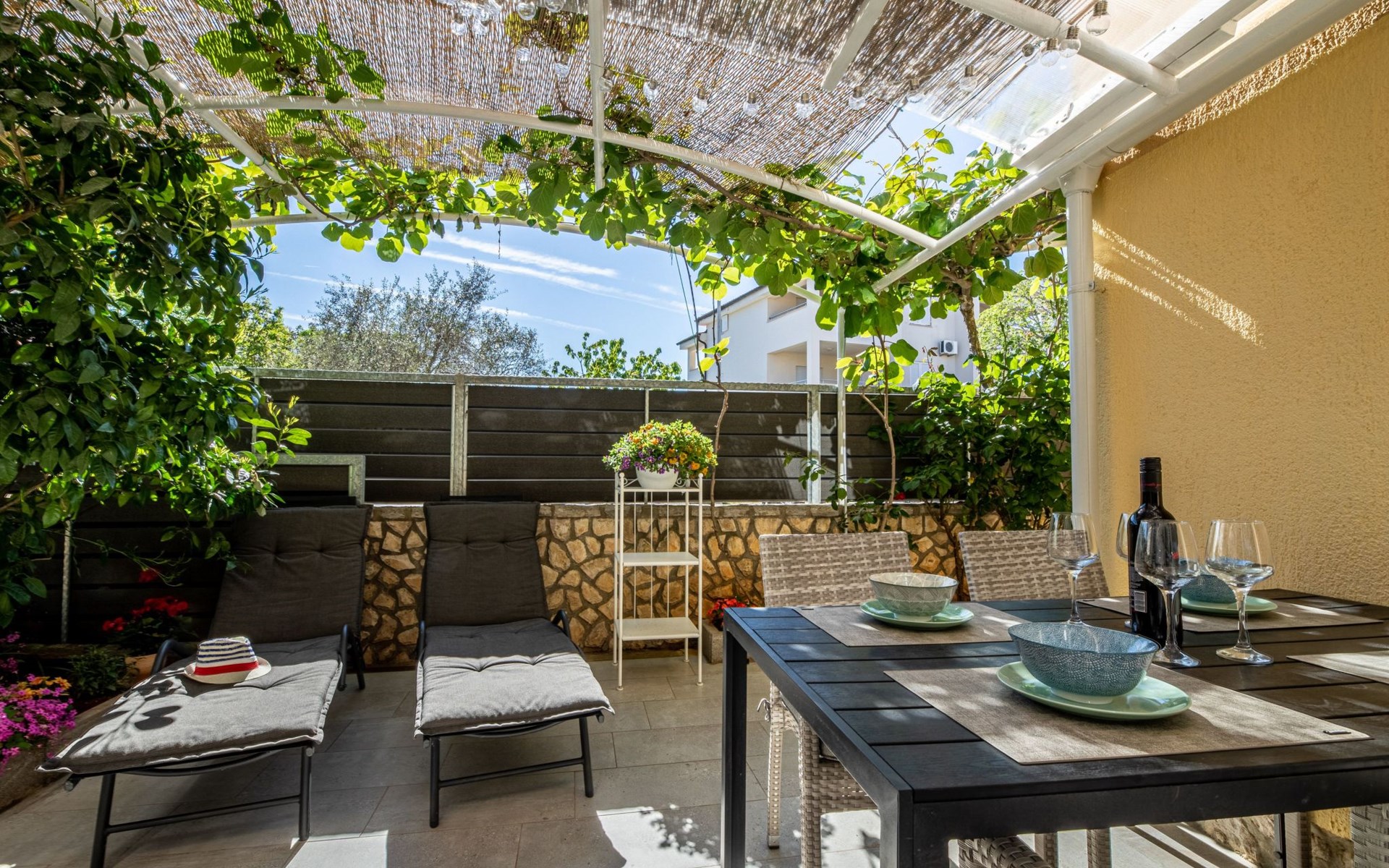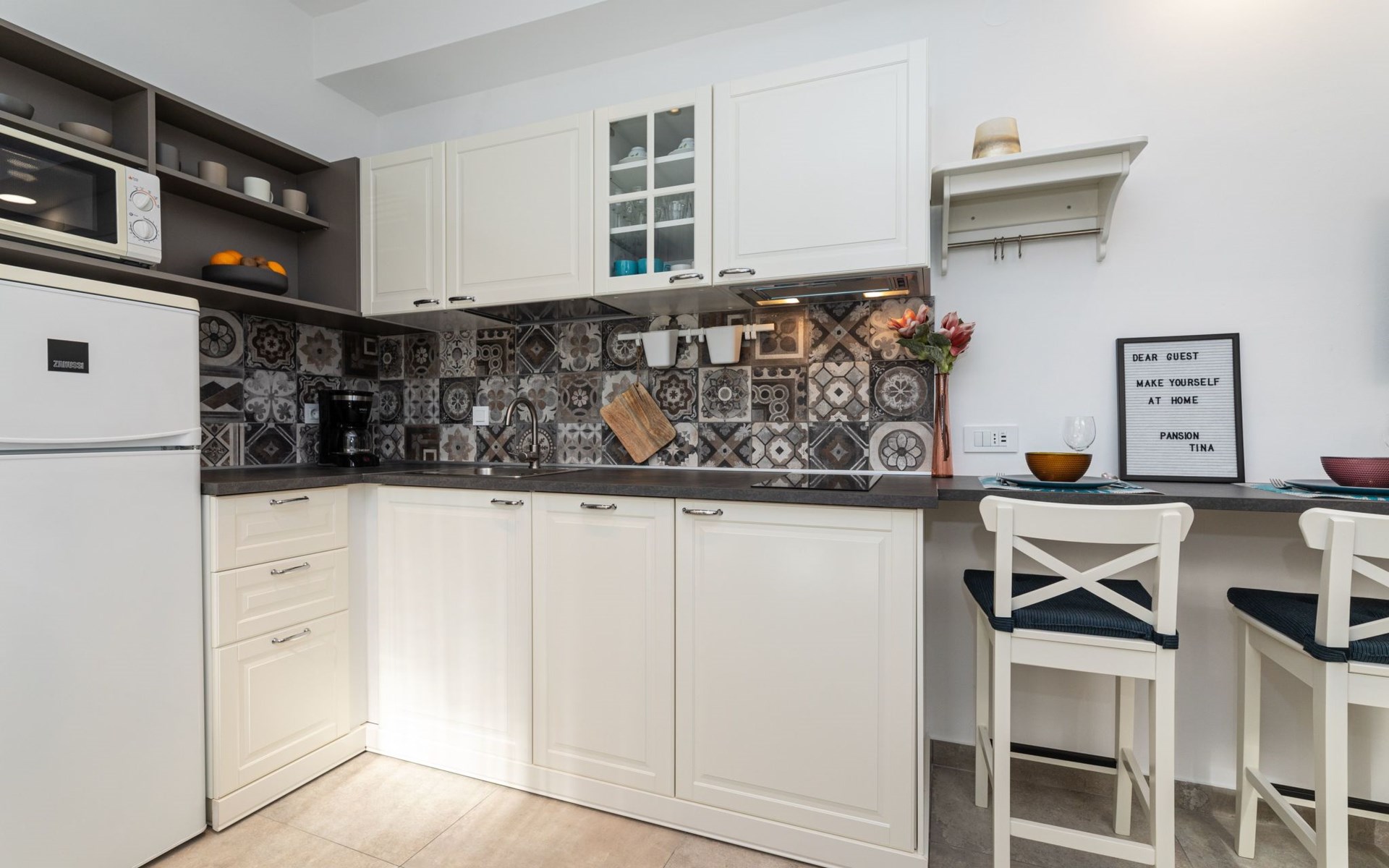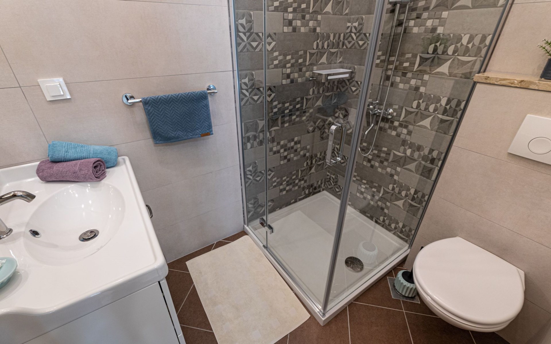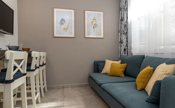 Opposite the building there is free parking . Guests can make the exploration of the surrounding area on the trails for mountain biking or hiking recreationally located at 200 meters from the guest house .Pension Tina - APP 7 (app 1/2 + 2) *** - app on the ground floor with a large enclosed terraceThe modern and comfortably furnished apartment is located on the ground floor and offers space for 2 to 4 people.In the apartment you will find a living/ dining area with a well equipped kitchen, a bedroom with a double bed and entrance hall with a bed 120x200 for 1-2 small children and bathroom with a shower. The apartment also has a large enclosed terrace with seating and a deckchairs. In the garden on the ground floor there is a shared sunbathing area with deckchairs and a beautiful heated swimming pool.Air conditioning, satellite TV, Wi-Fi internet and barbecue are also available. You can reach the nearest beach in a 5 - 10 minutes (approx. 600 m).Parking is opposite the house. There is also a children 's playground and a table tennis table.
