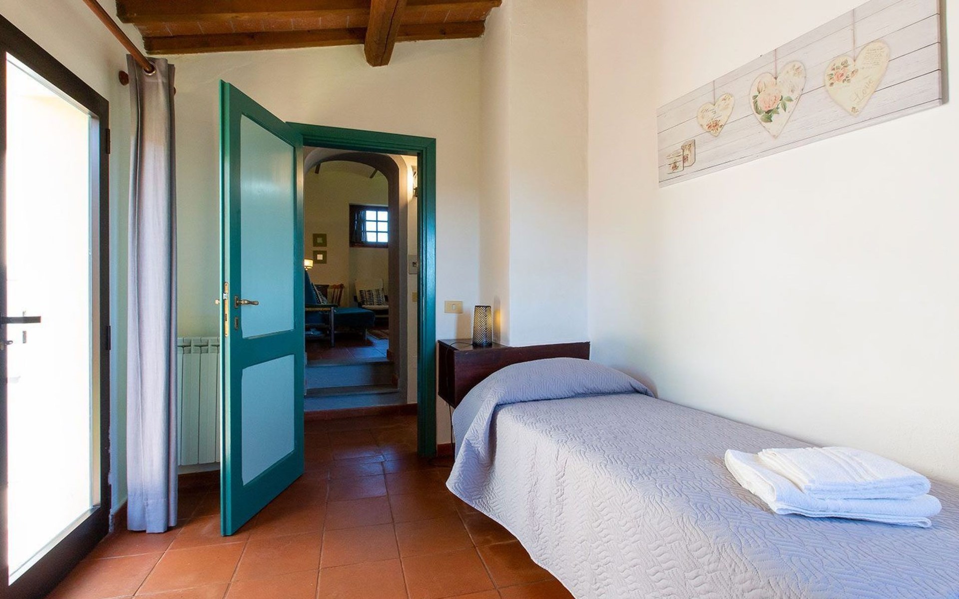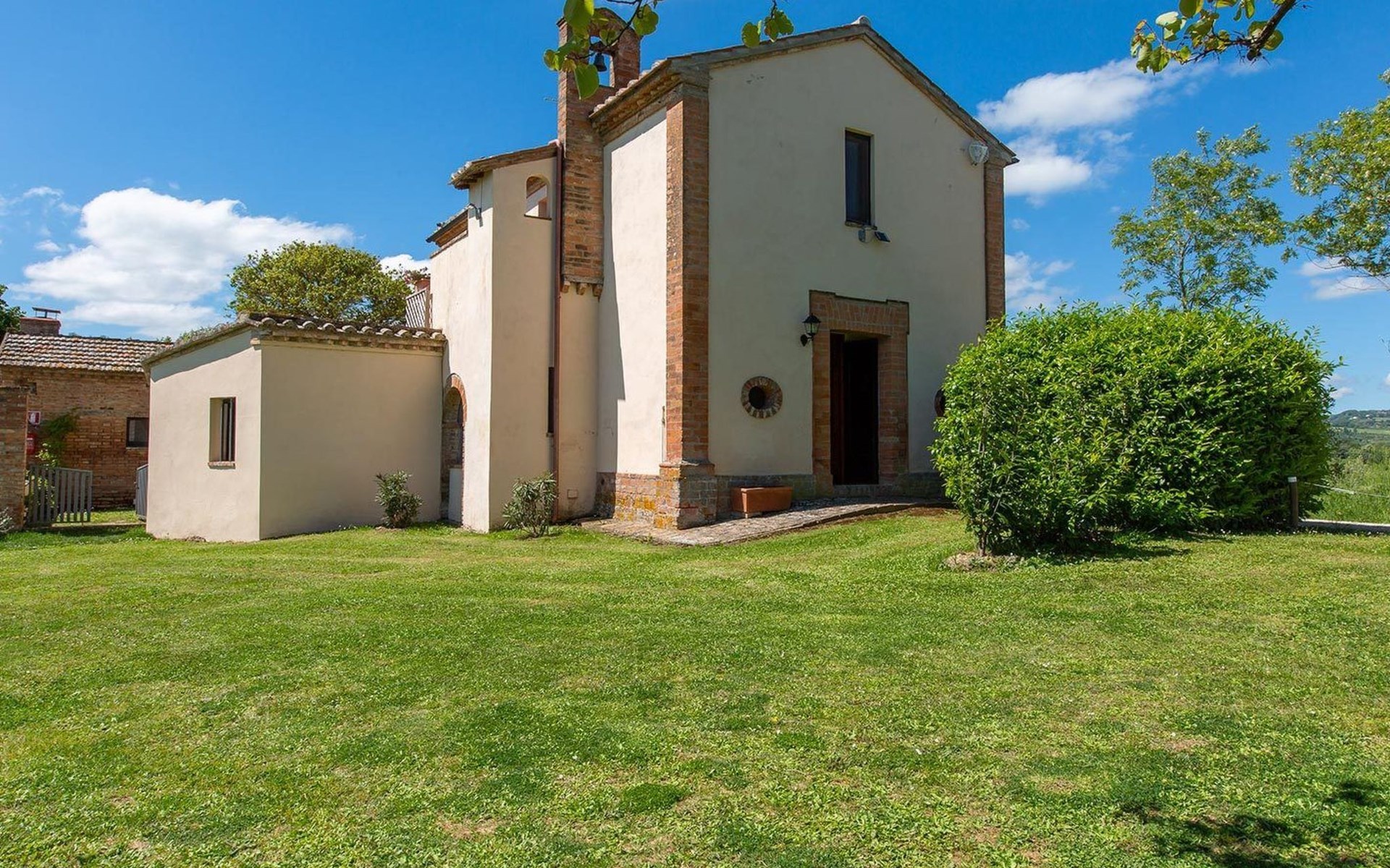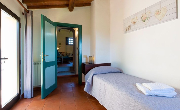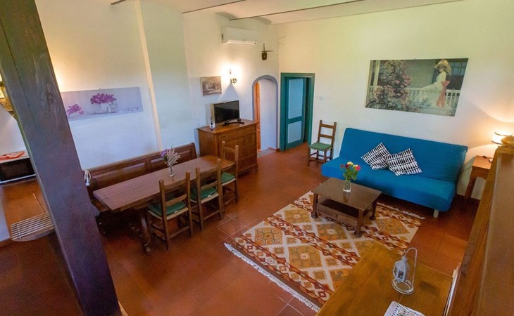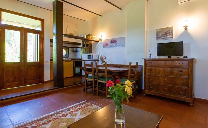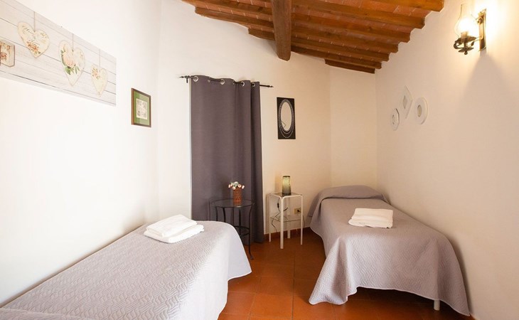 Location Macciano. In the middle of the splendid "Val di Chiana", situated on the first floor of a splendid 16th century farmhouse which has been completely renovated, the flat enjoys a wonderful view over the surrounding valley thanks to a living room created from an old window loggia.01 Chiesone 1 Chiesone 1 is a comfortable flat situated on the ground floor, consisting of a large living room with open kitchen, a double bedroom, a twin bedroom and two bathrooms with shower. The flat can be combined into a single unit with Chiesone 2 above. It also has an outdoor area equipped with a sun umbrella, table and chairs.Those renting this flat will enjoy a beautiful garden, terraces, a swimming pool and a tennis court to share with the other guests.Two bedrooms (one double and one twin), a bathroom with a kitchenette and a dining area complete this flat perfect for a family or a group of friends.The Val di Chiana is an area rich in ancient and picturesque villages, valleys, lakes and tourist resorts, and Macciangrosso is strategically located between Tuscany and Umbria. By staying here, you will be able to reach, in a short time, some of the most evocative and attractive places in our country, medieval villages, ancient pilgrimage routes, and wine and food traditions. We therefore invite you to visit: THE VAL D'ORCIA Declared a UNESCO World Heritage Site... "an exceptional example of how the natural landscape was redesigned during the Renaissance period to reflect the ideals of good governance and to create an aesthetically pleasing image; the landscape of the Val d'Orcia was celebrated by the painters of the Sienese School, which flourished during the Renaissance. The images of the Val d'Orcia and especially the reproductions of its landscapes, in which people are depicted living in harmony with nature, became icons of the Renaissance and profoundly influenced the way of thinking about landscape in the years to come' THE VALDICHIANA William Goethe, Journey to Italy ... 'It is not possible to see more beautiful fields; there is not a gorge of soil which is not worked to perfection, prepared for sowing. The forage grows there luxuriantly, and seems to find in these soils all the conditions required for it to flourish. In the second year they sow broad beans for the horses, for oats do not grow here. They also sow lupins, which are now already green and bear fruit in March. The flax is also already sown; in the ground all winter, and the cold, the frost make it more tenacious.' THE TRASIMENO LAKE The lake holds within itself an ancient and troubled history, manifested by castles, fortresses, churches and abbeys; the works of artists of great renown, such as those of Pietro Vannucci known as Perugino or those of Nicolò Pomarancio. Legend has it that the nymph of Lake Agilla, madly in love with the handsome Prince Trasimeno, seduced him by dragging him into its waters, which were thus named after him. Three islands emerge from the lake: Maggiore, Minore and Polvese. A scenic road connects the lakeside towns: Castiglione del Lago, Borghetto, Tuoro sul Trasimeno, Passignano sul Trasimeno, Torricella, Magione, Monte del Lago, San Feliciano, San Savino, Sant'Arcangelo.VAL D'ORCIA Declared a UNESCO World Heritage Site... "an outstanding example of how the natural landscape was redesigned during the Renaissance period to reflect the ideals of good governance and to create an aesthetically pleasing image; the landscape of the Val d'Orcia was celebrated by the painters of the Sienese School, which flourished during the Renaissance. The images of the Val d'Orcia and especially the reproductions of its landscapes, depicting people living in harmony with nature, became icons of the Renaissance and profoundly influenced the way of thinking about landscape in the years to come'. IT052011B5STN9NMH7