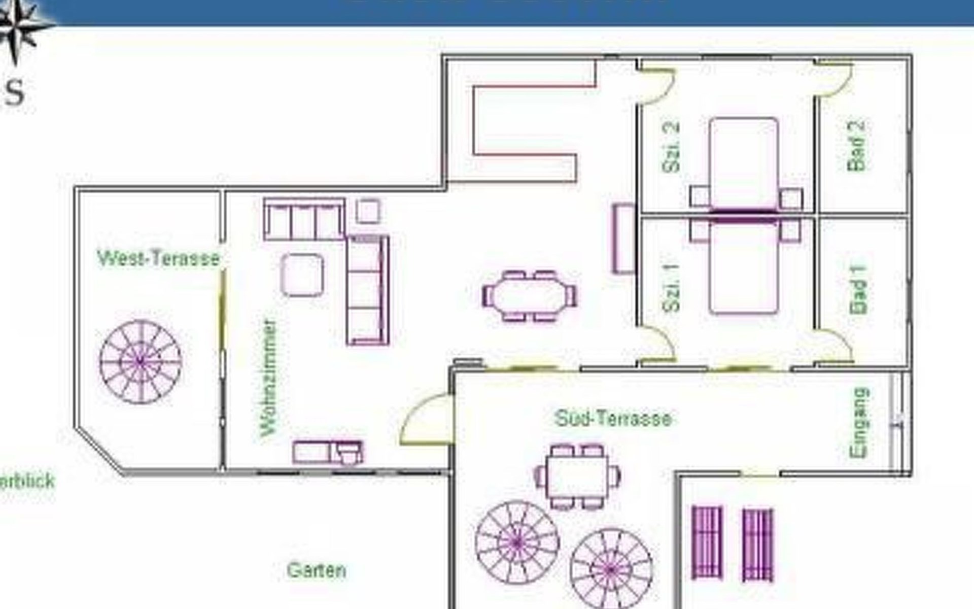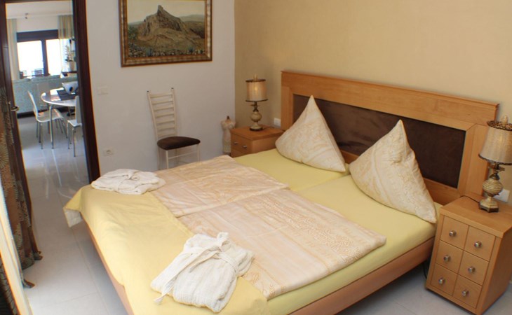 Inside, you will find tasteful furnishings that perfectly combine comfort and style. Both bedrooms offer a double bed, consisting of two 90 x 200 cm mattresses, and have an en-suite bathroom with shower, WC and bidet. A large, bright and sun-drenched living area with an electric fireplace is divided into an open American kitchen, a dining room and a cosy sofa area. The fully equipped kitchen leaves nothing to be desired with a 4-ring ceramic hob, an oven that also serves as a microwave, a large fridge, a dishwasher and an espresso machine. WLAN, satellite TV, bed linen, towels, beach towels, iron, hairdryer and bathrobes are provided for your comfort.