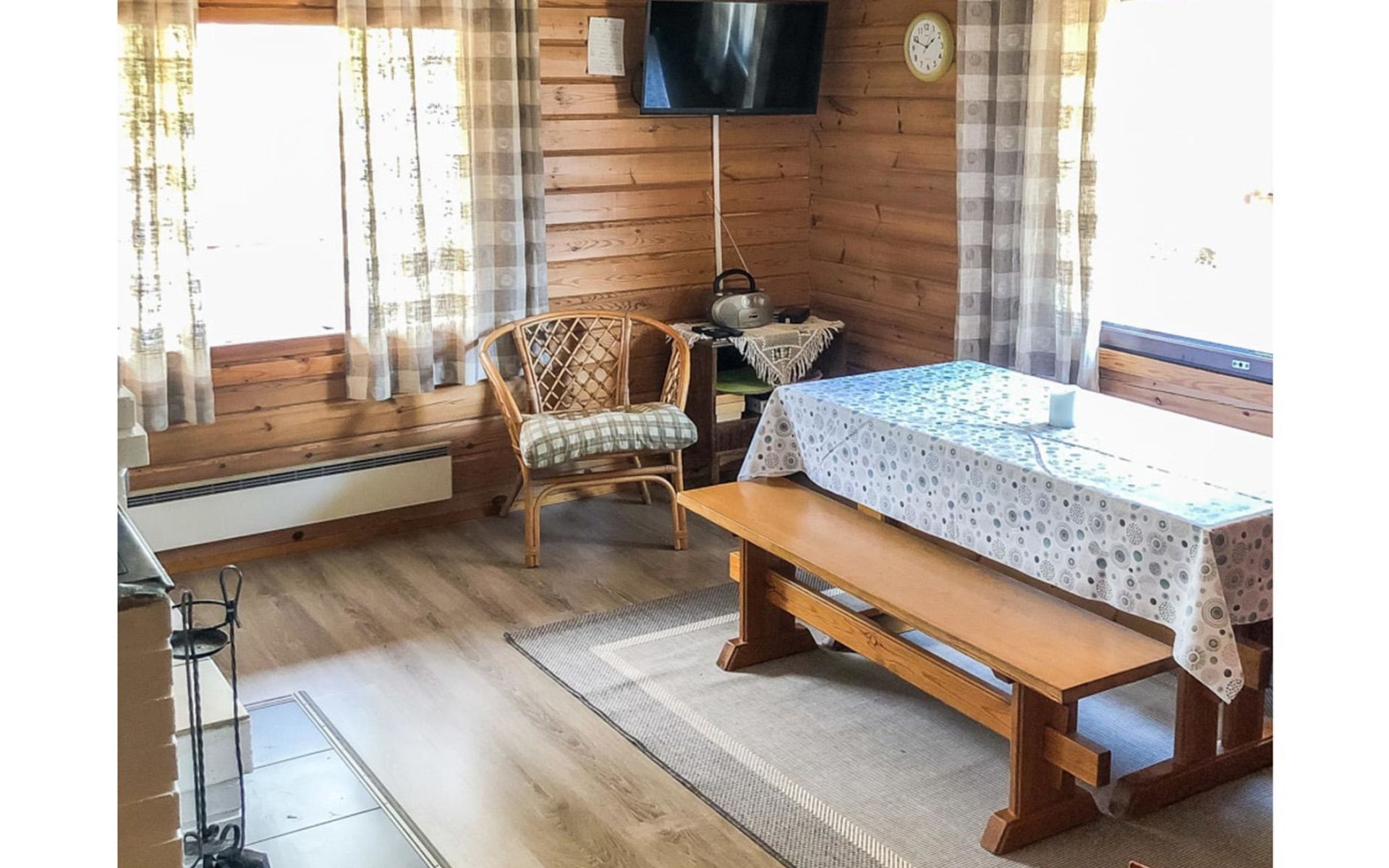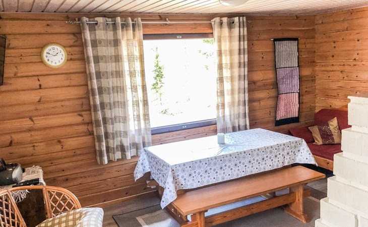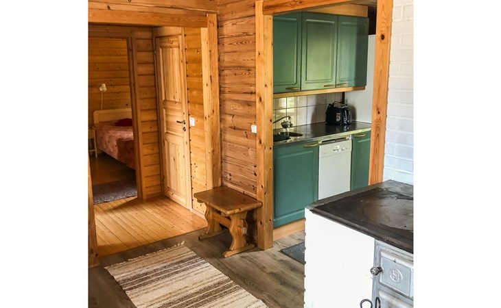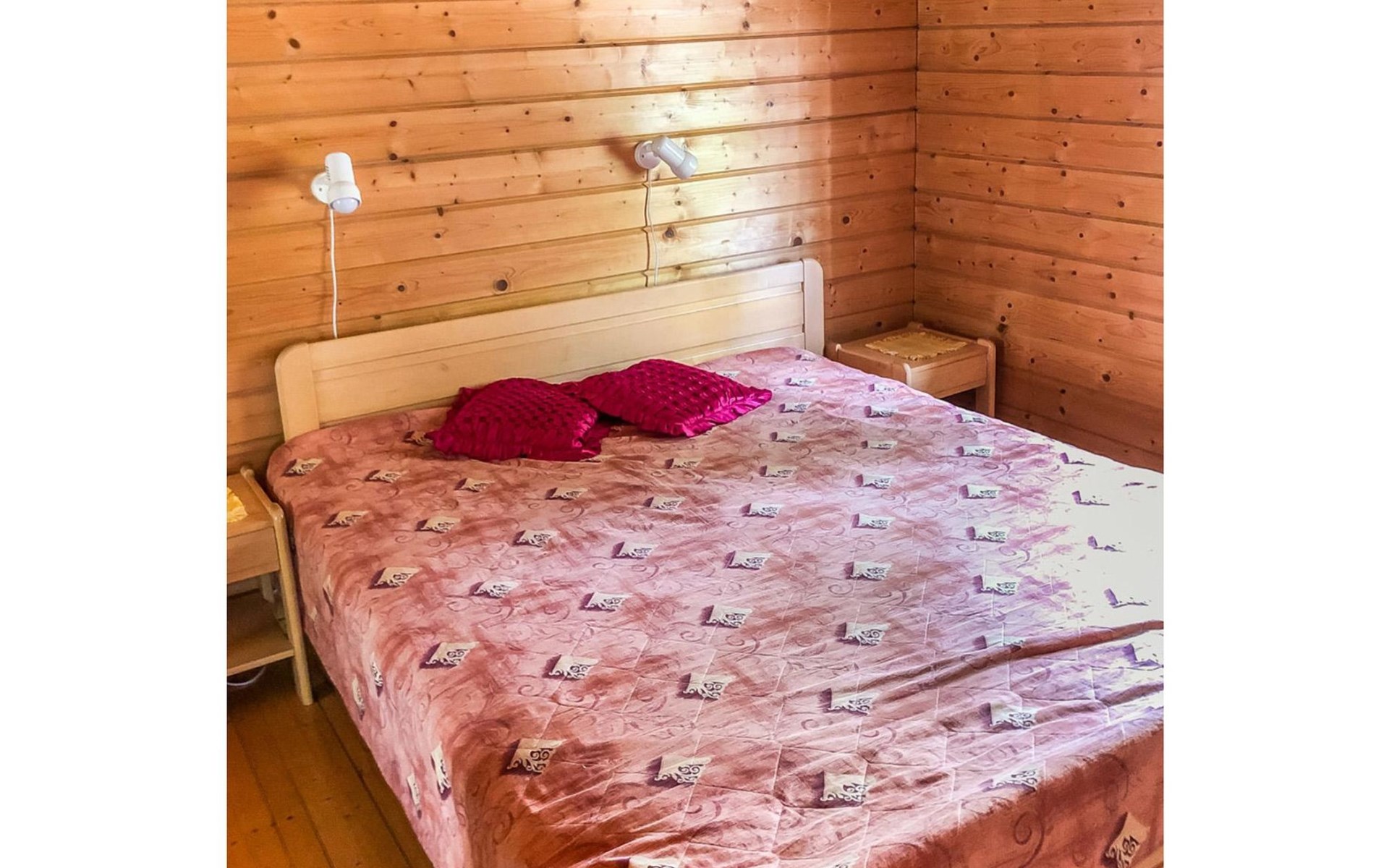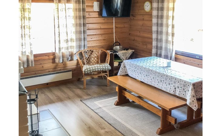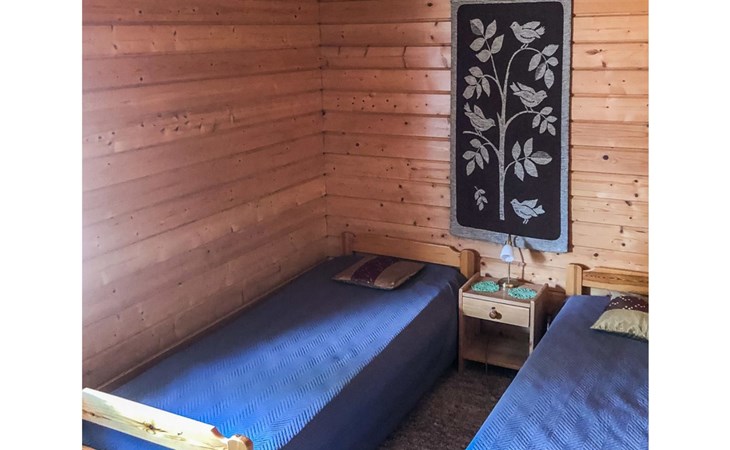 Log cabin 1982, renovated 1999, living room/kitchen with 2 extra beds, 2 bedroom with 2 beds in each, foyer, open veranda. Shower in the cabin.