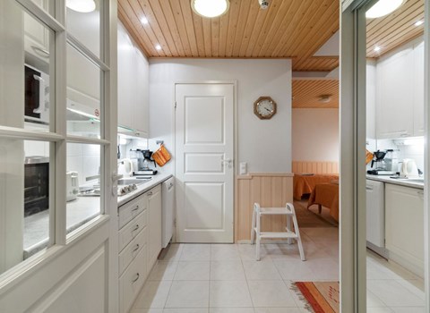 At the heart of the cabin is the inviting living room and open-plan kitchen, providing a comfortable space for spending time together. After a day of outdoor activities, you can unwind in the sauna and washroom — the perfect way to relax in true Finnish style.